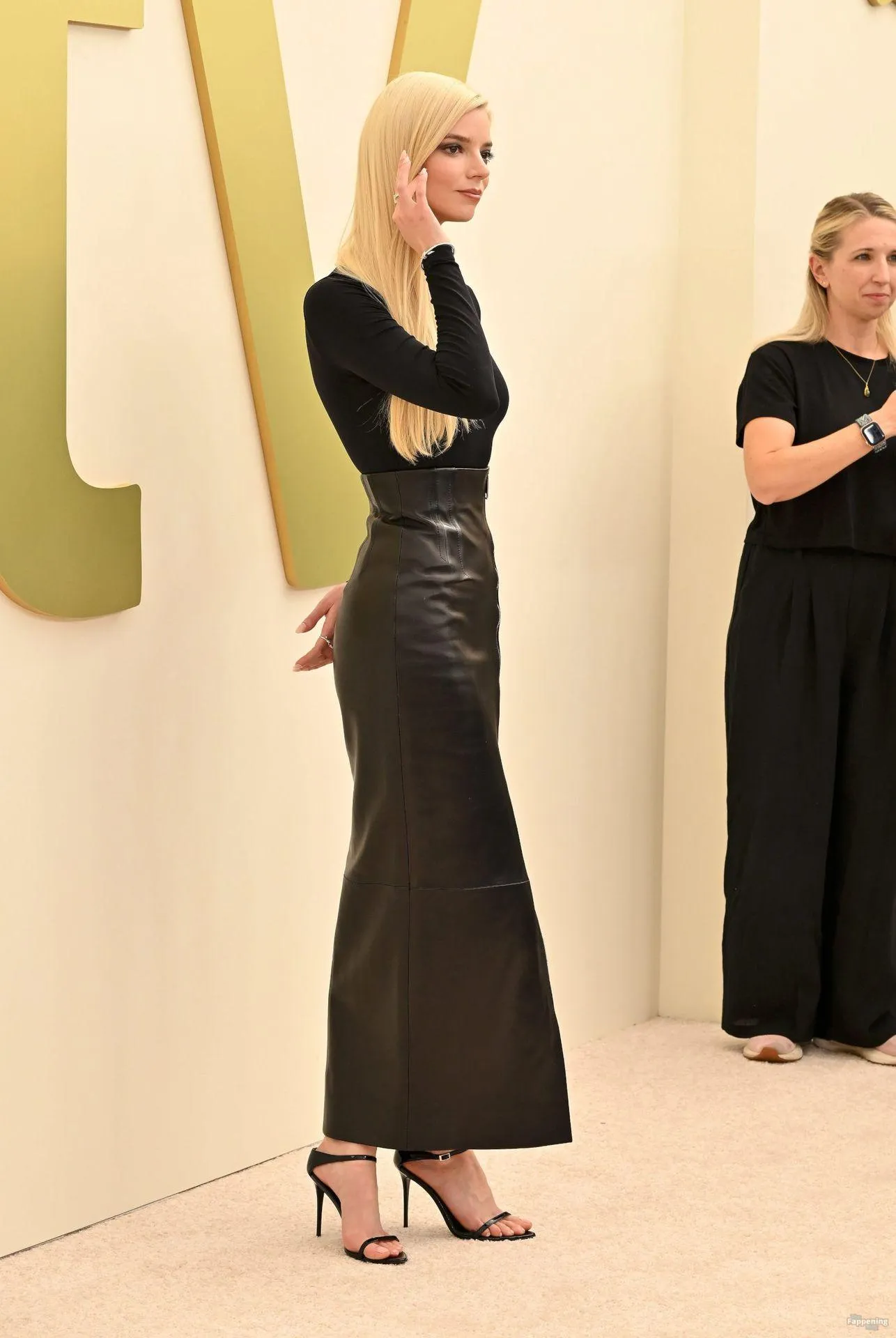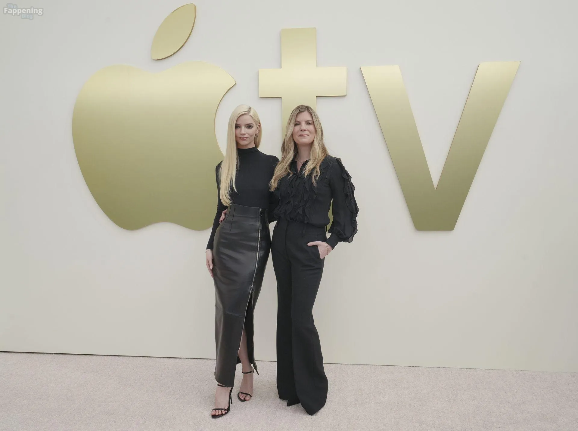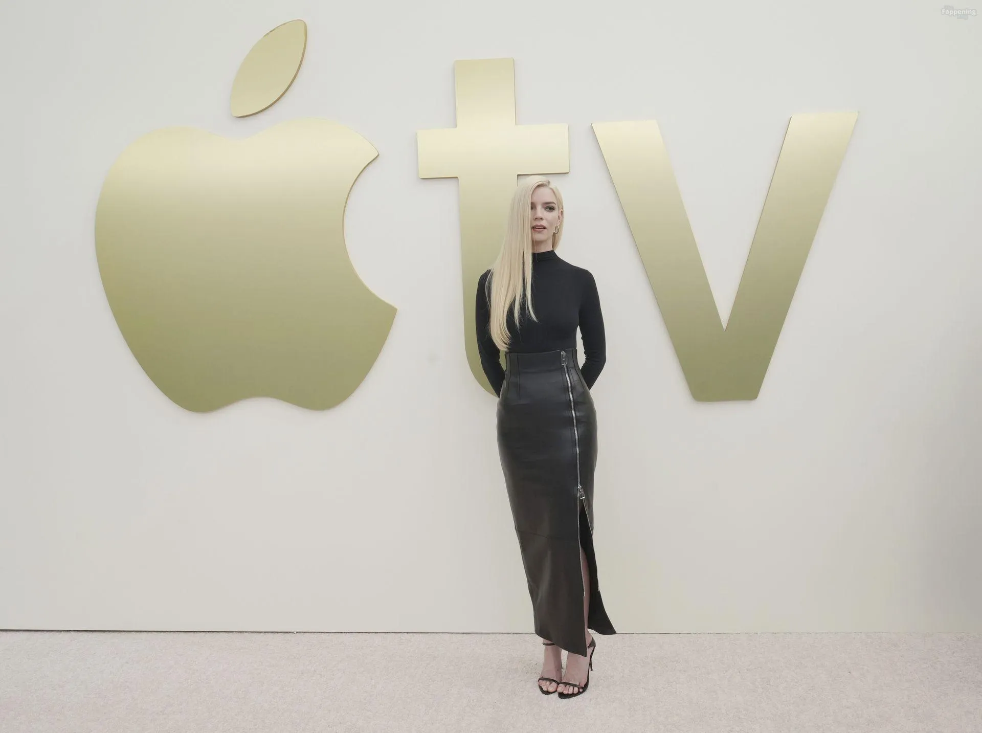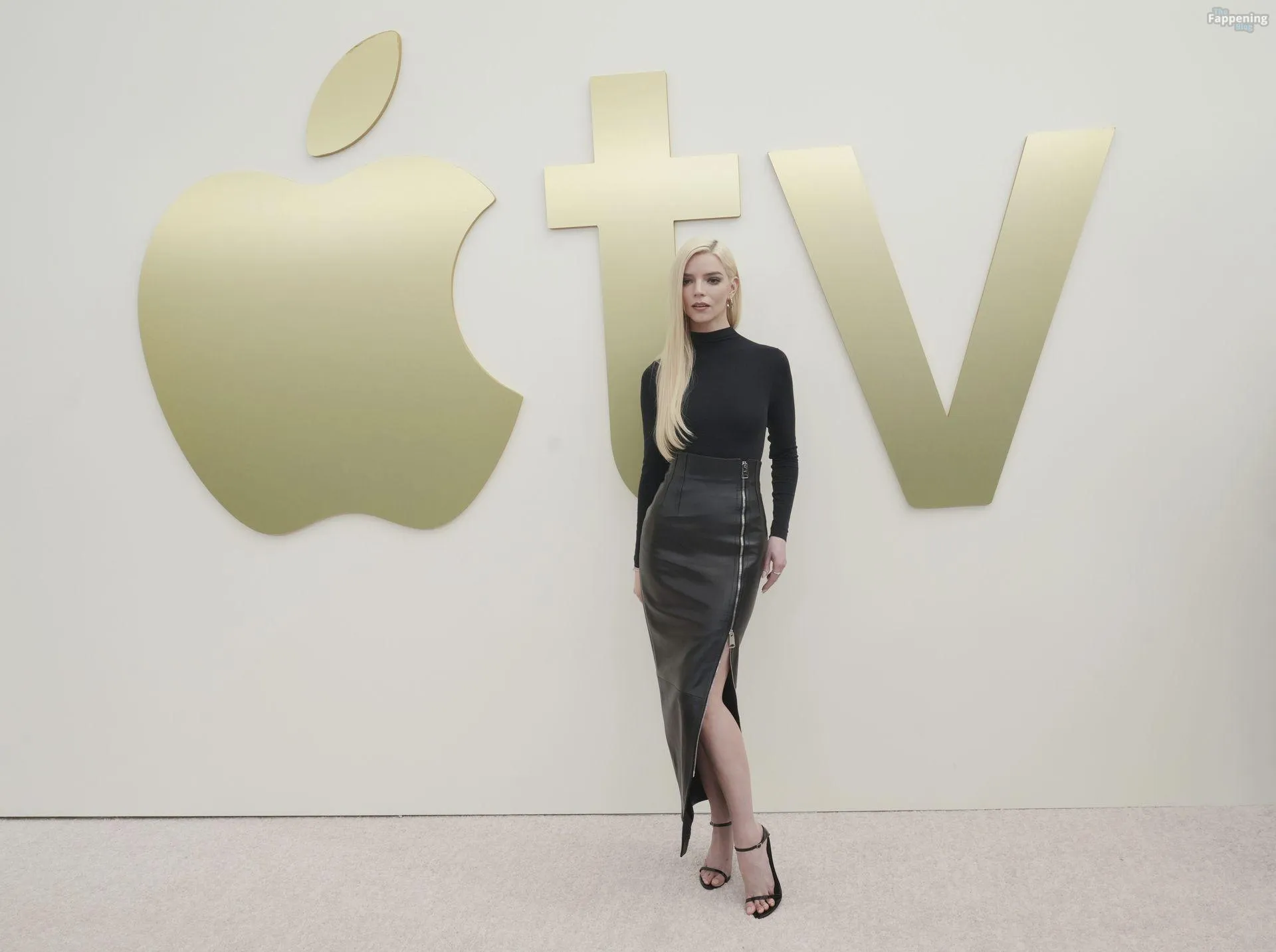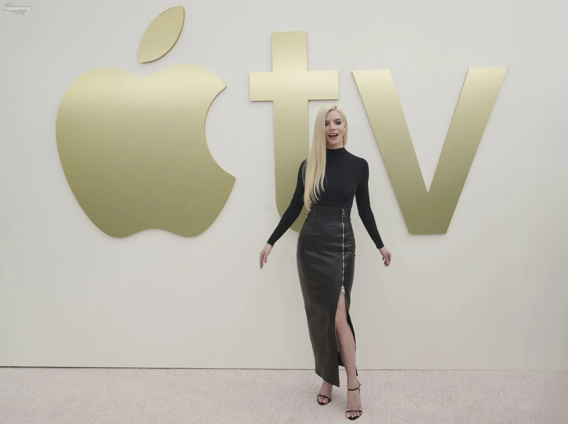 Anya Taylor-Joy attends the Apple TV Press Day held at Barker Hangar in Los Angeles. The actress stuns on the red carpet, wearin’ a black bodysuit and zipper leather skirt.