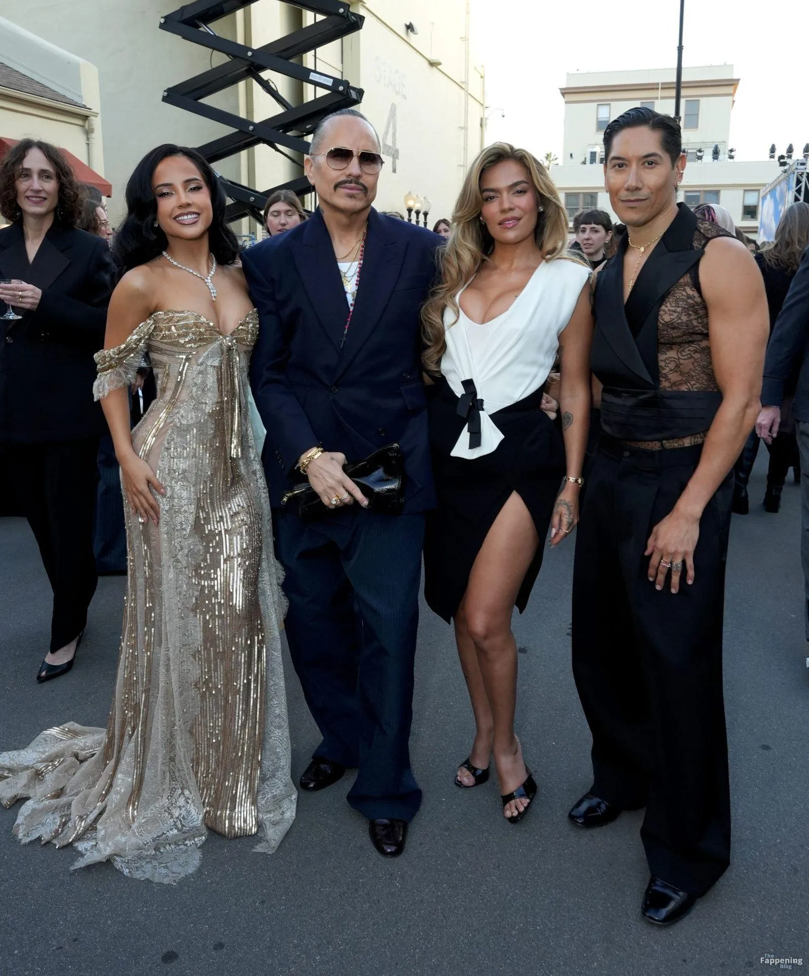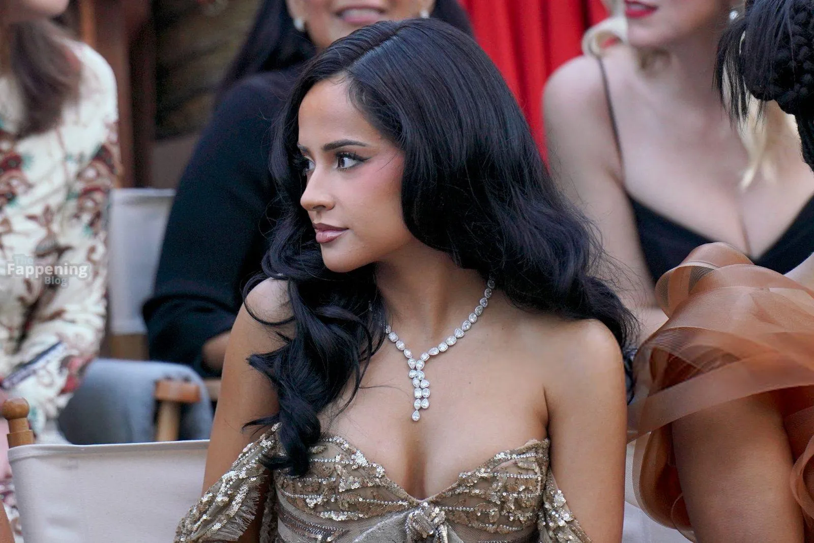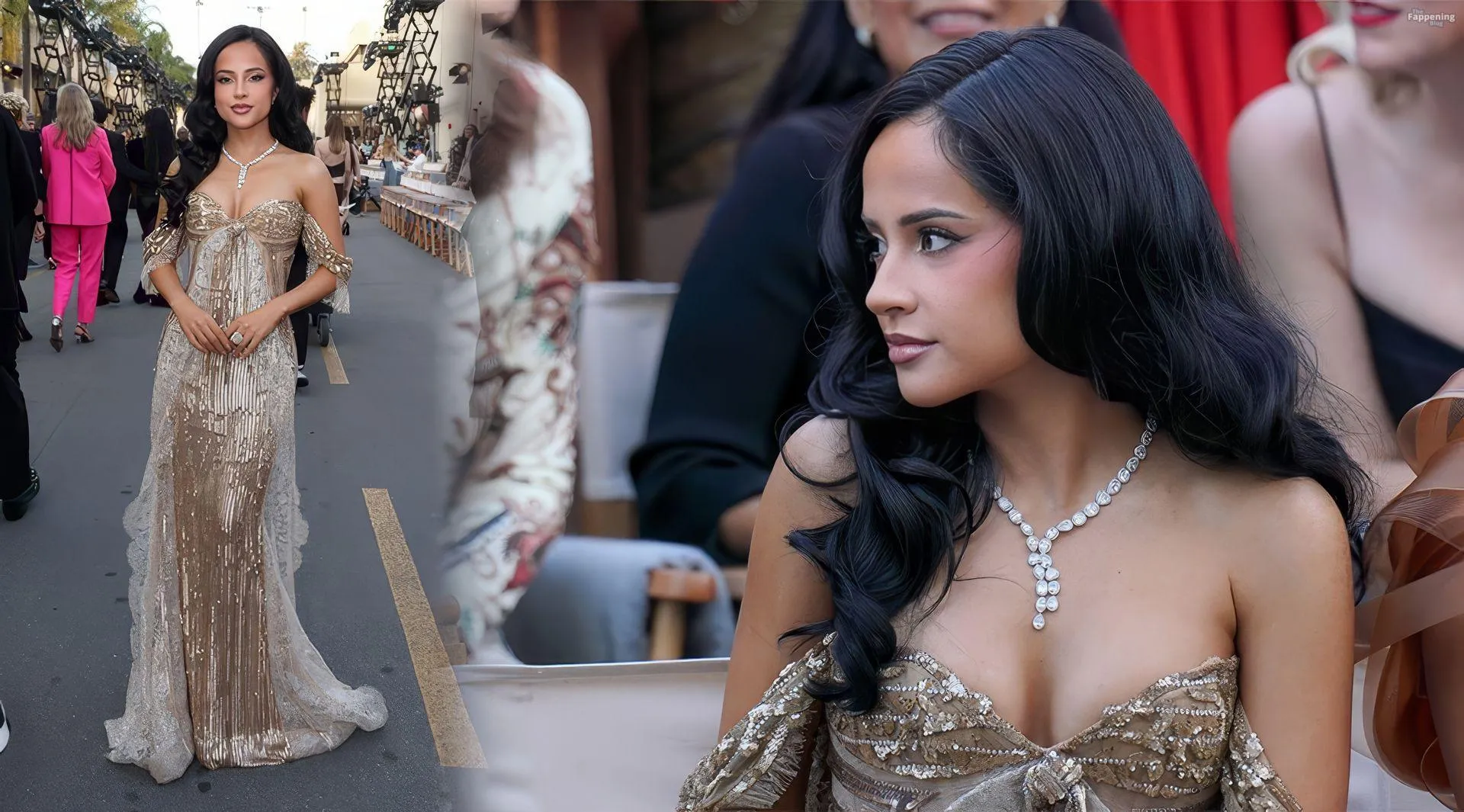 Singer Becky G shows off her cleavage wearin’ a gold sequin gown at Vogue World: Hollywood 2025.