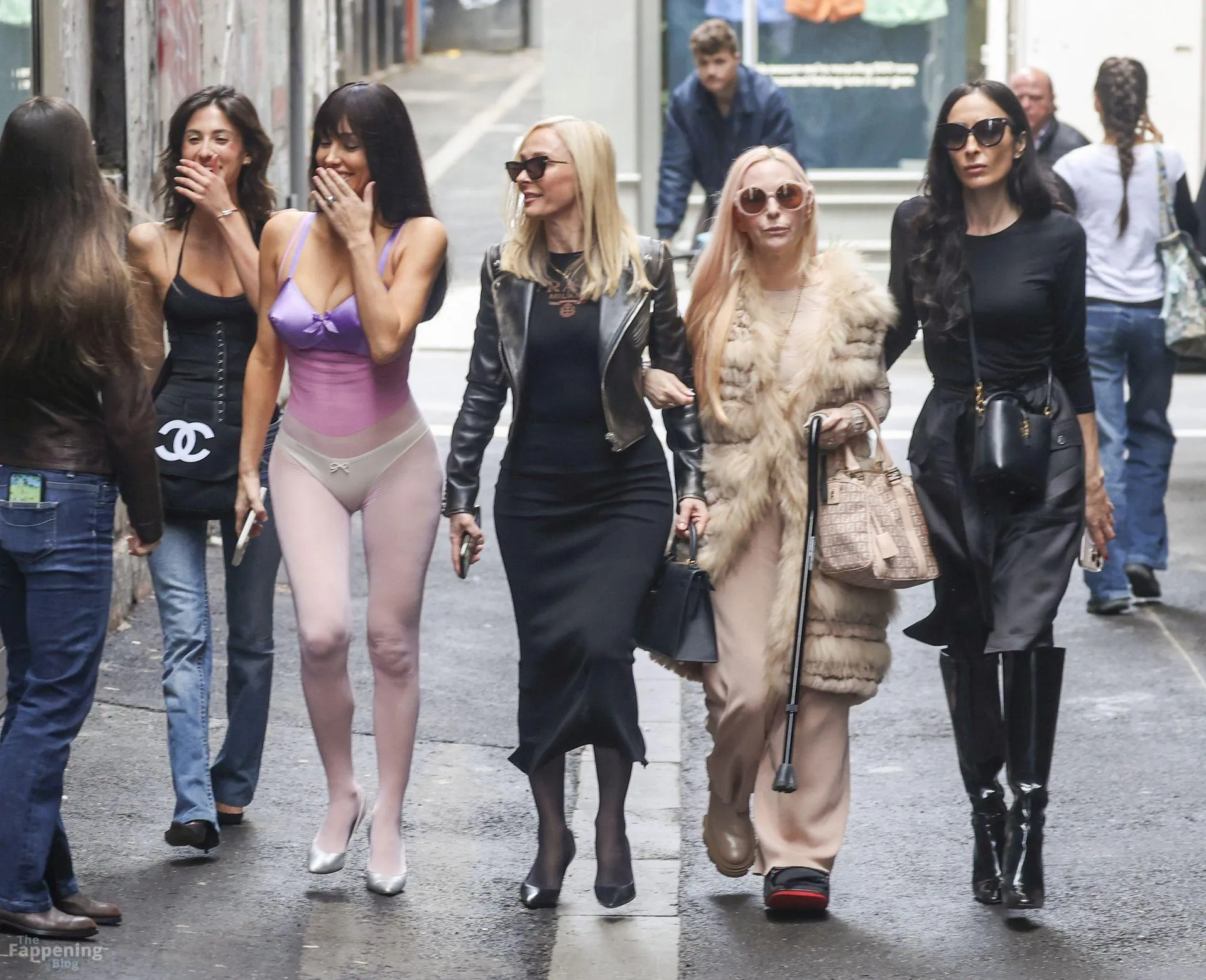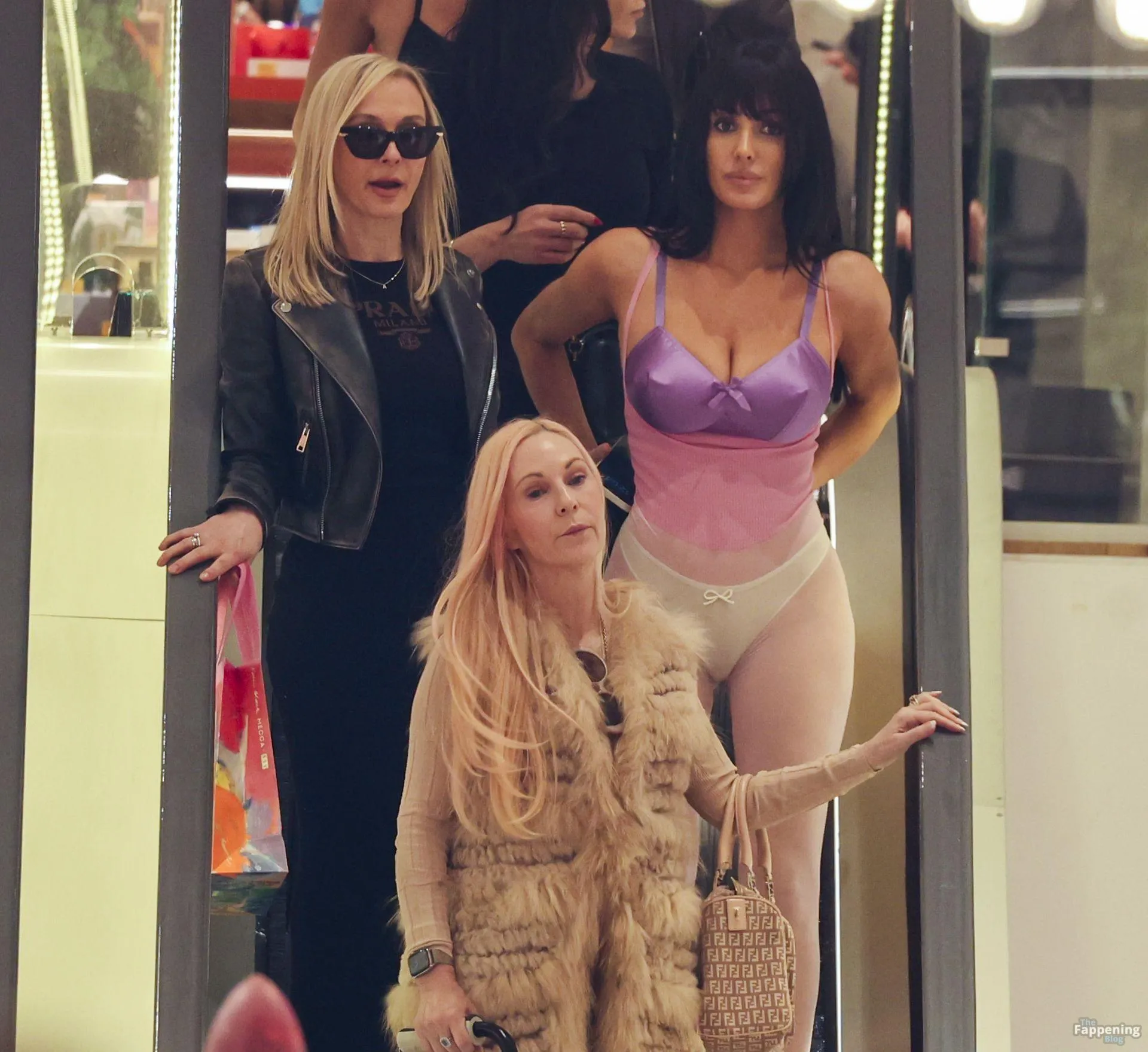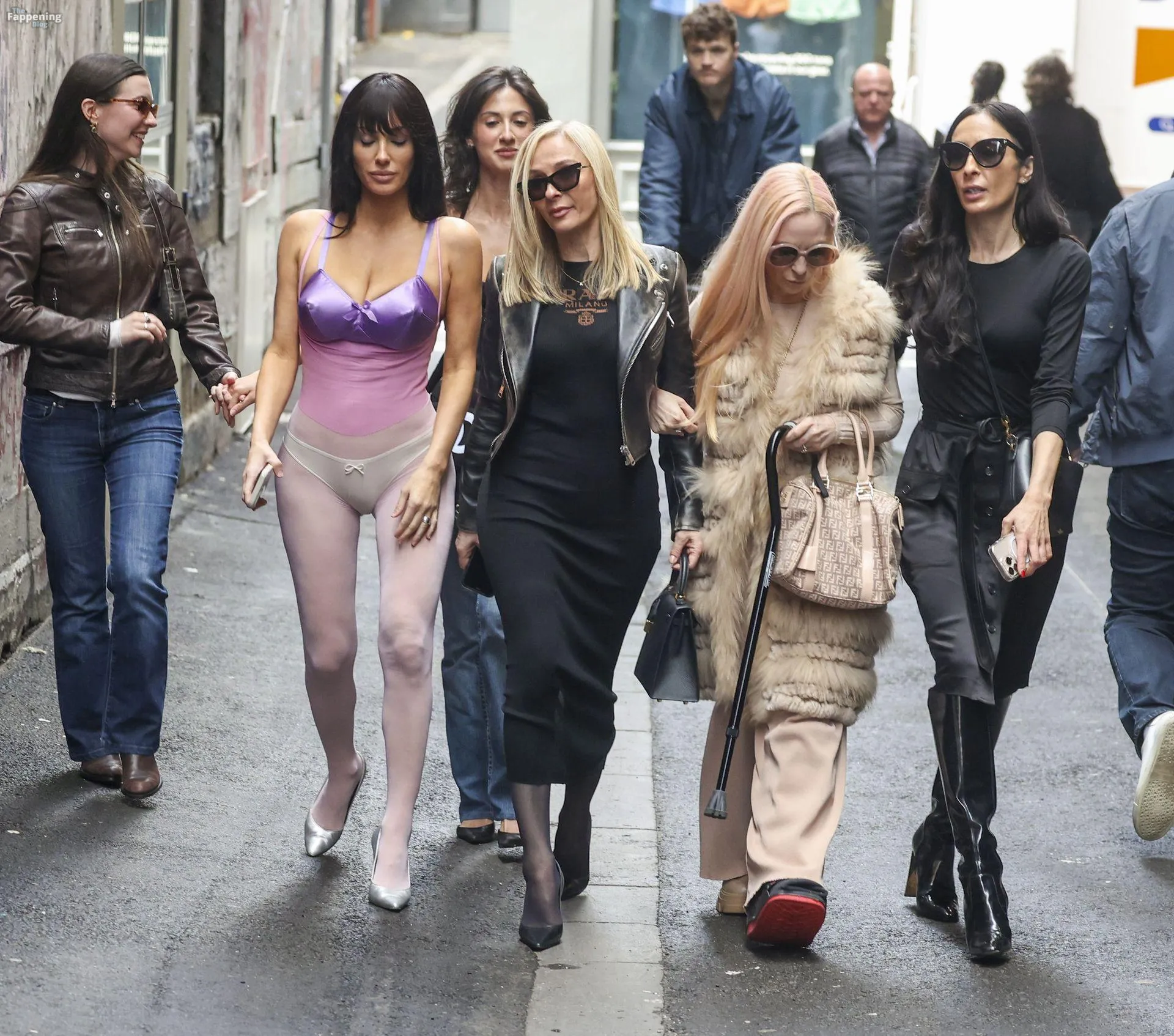 Bianca Censori was spotted out in Melbourne, Australia, on a family shopping trip, wearin’ a sheer purple bodysuit that showed off her goods. She paired it with a metallic purple bra and white underwear, walkin’ with her mom Alexandra, sister Angelina, and a few relatives. They hit up Mecca for a beauty haul and strolled the CBD laneways, lookin’ relaxed despite the rain.