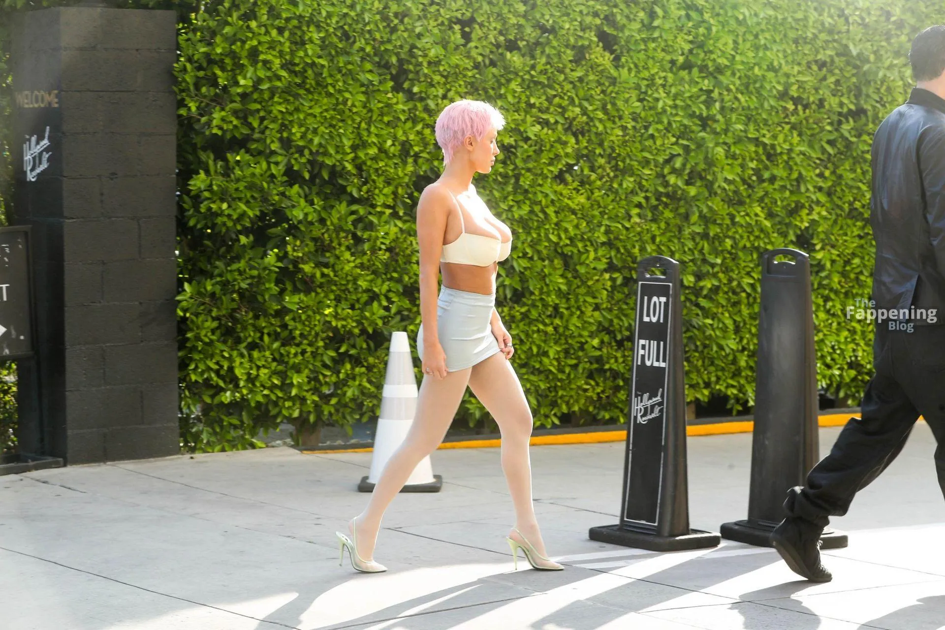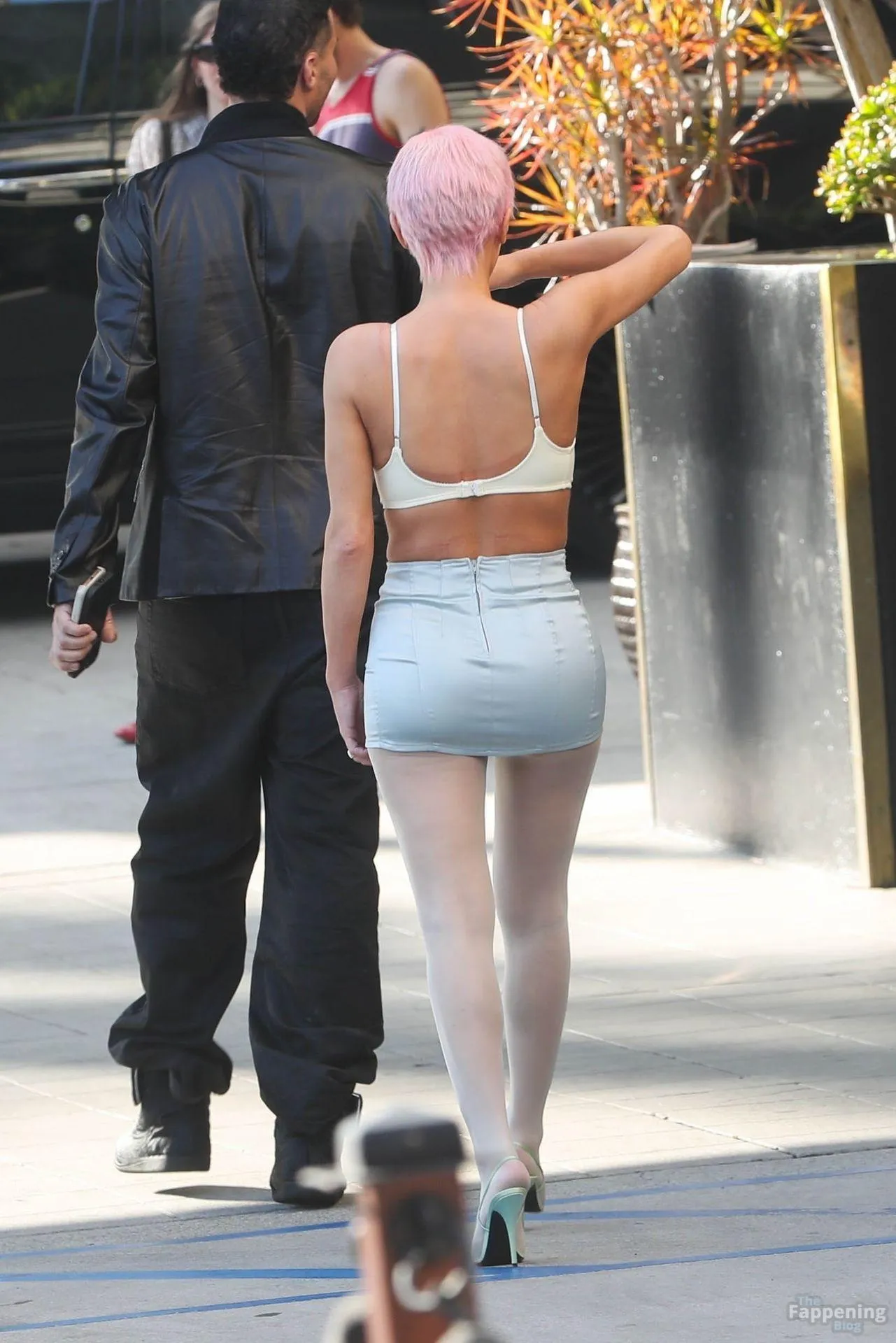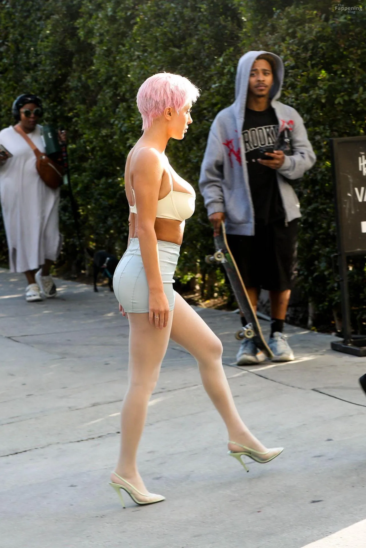 Bianca Censori is struttin’ her stuff in a skimpy skirt and a top that shows off her sexy breasts.