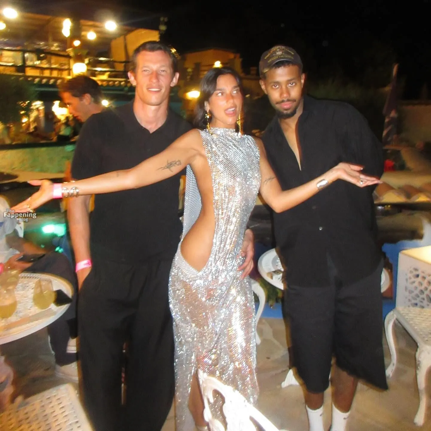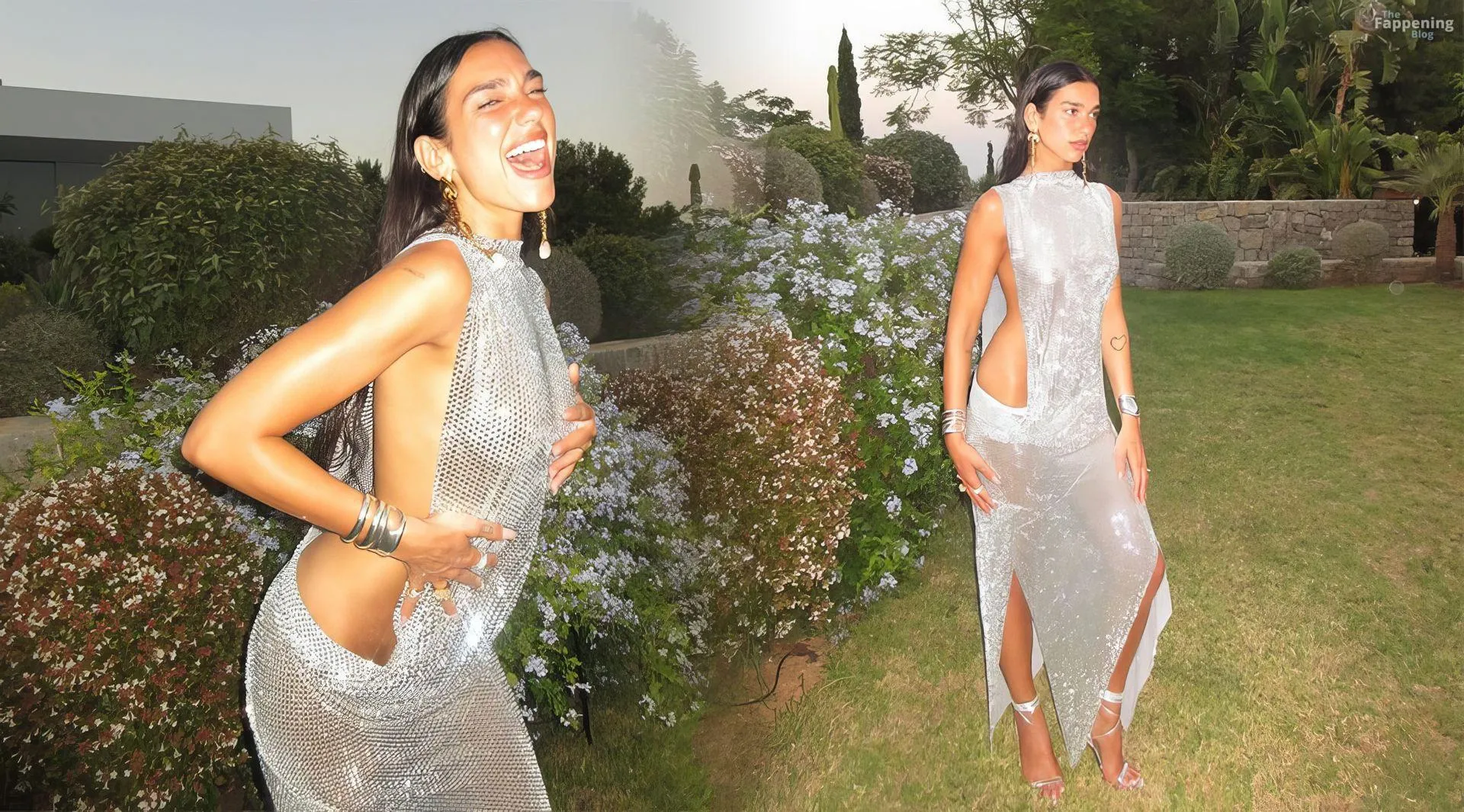 Dua Lipa poses braless in a see-through silver dress, flauntin’ her slender figure and some sideboob.