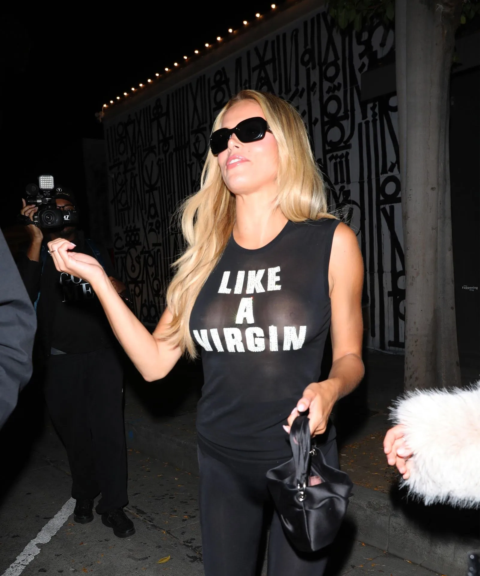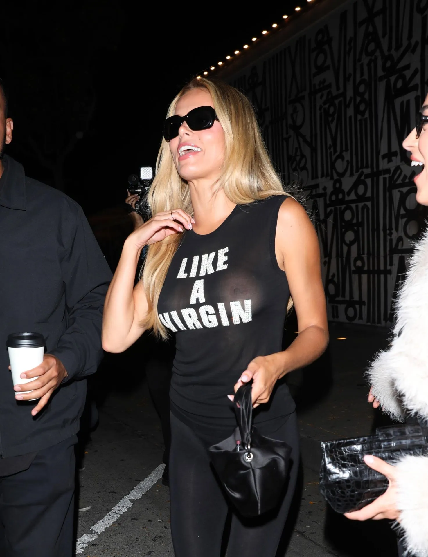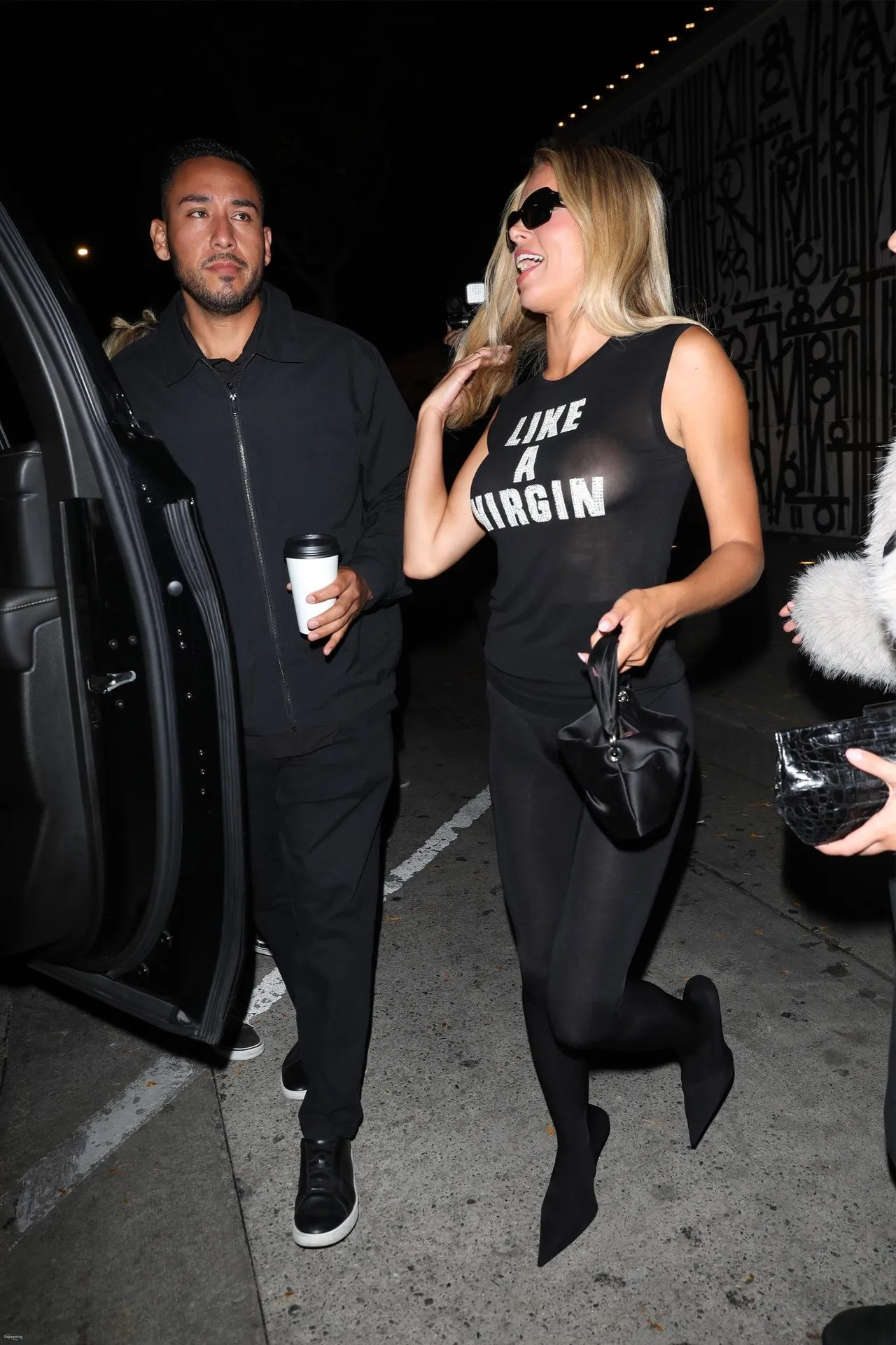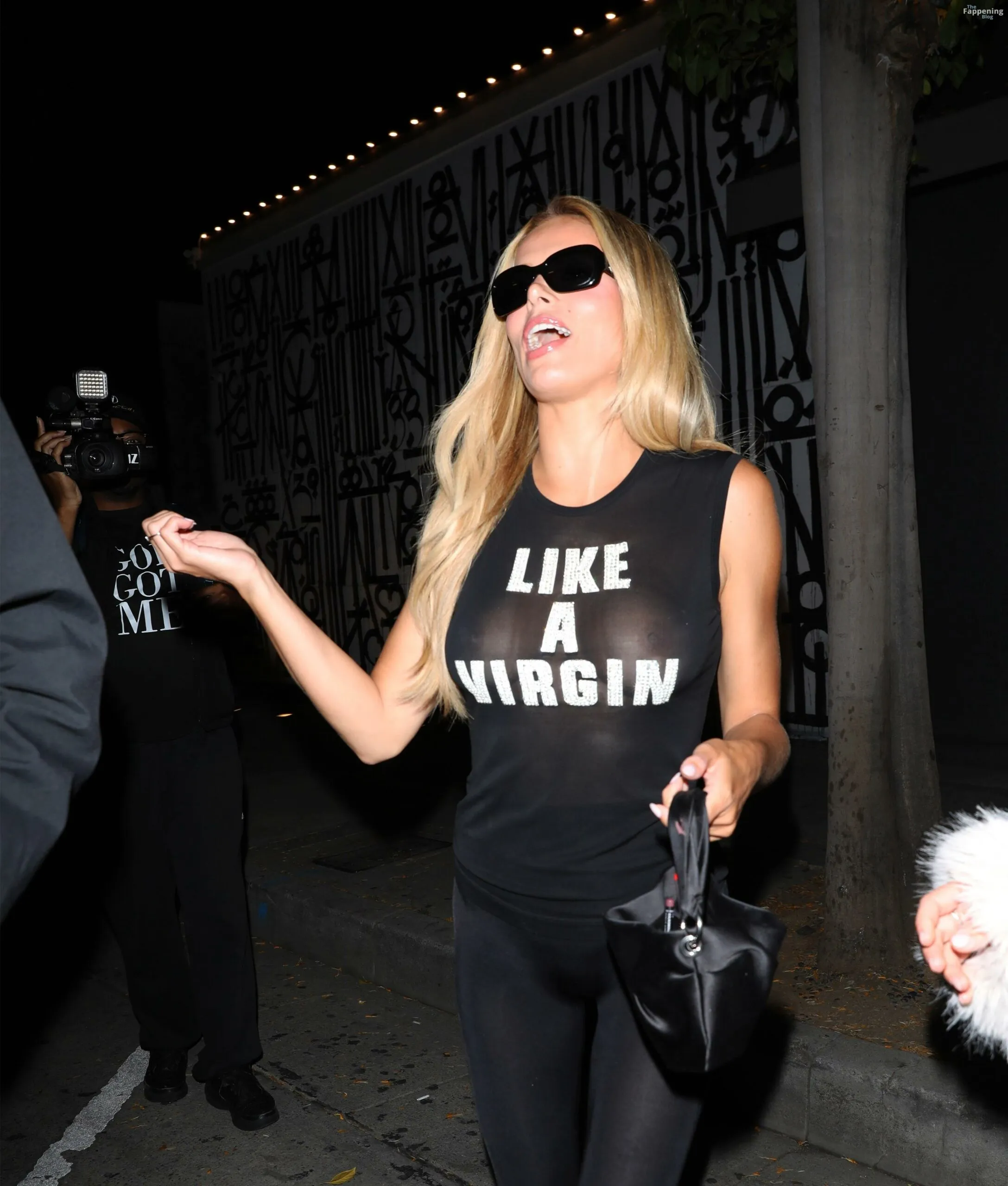 Model Brooks Nader (29) leaves little to the imagination wearing a see-through top that reads ‘Like a Virgin’ as she’s seen exiting Craig’s restaurant after having dinner in West Hollywood.