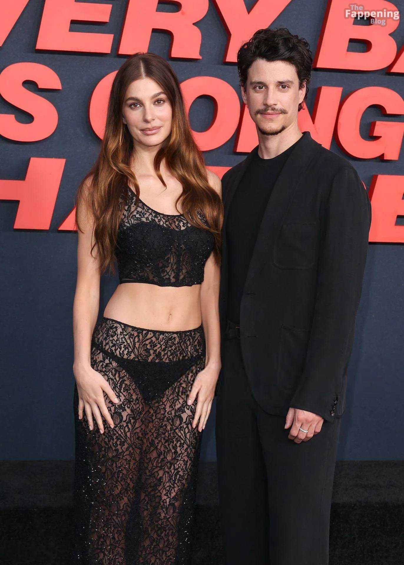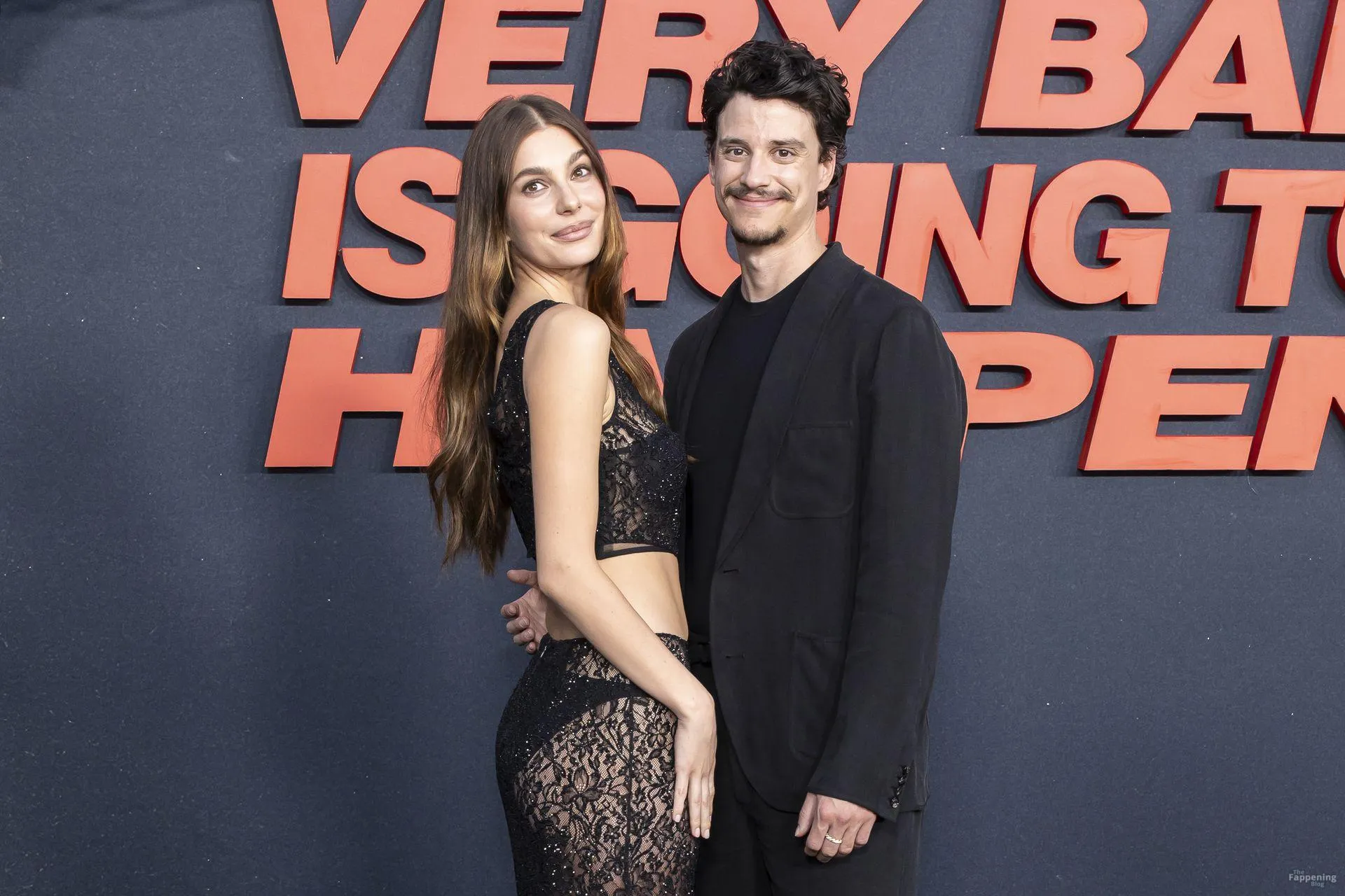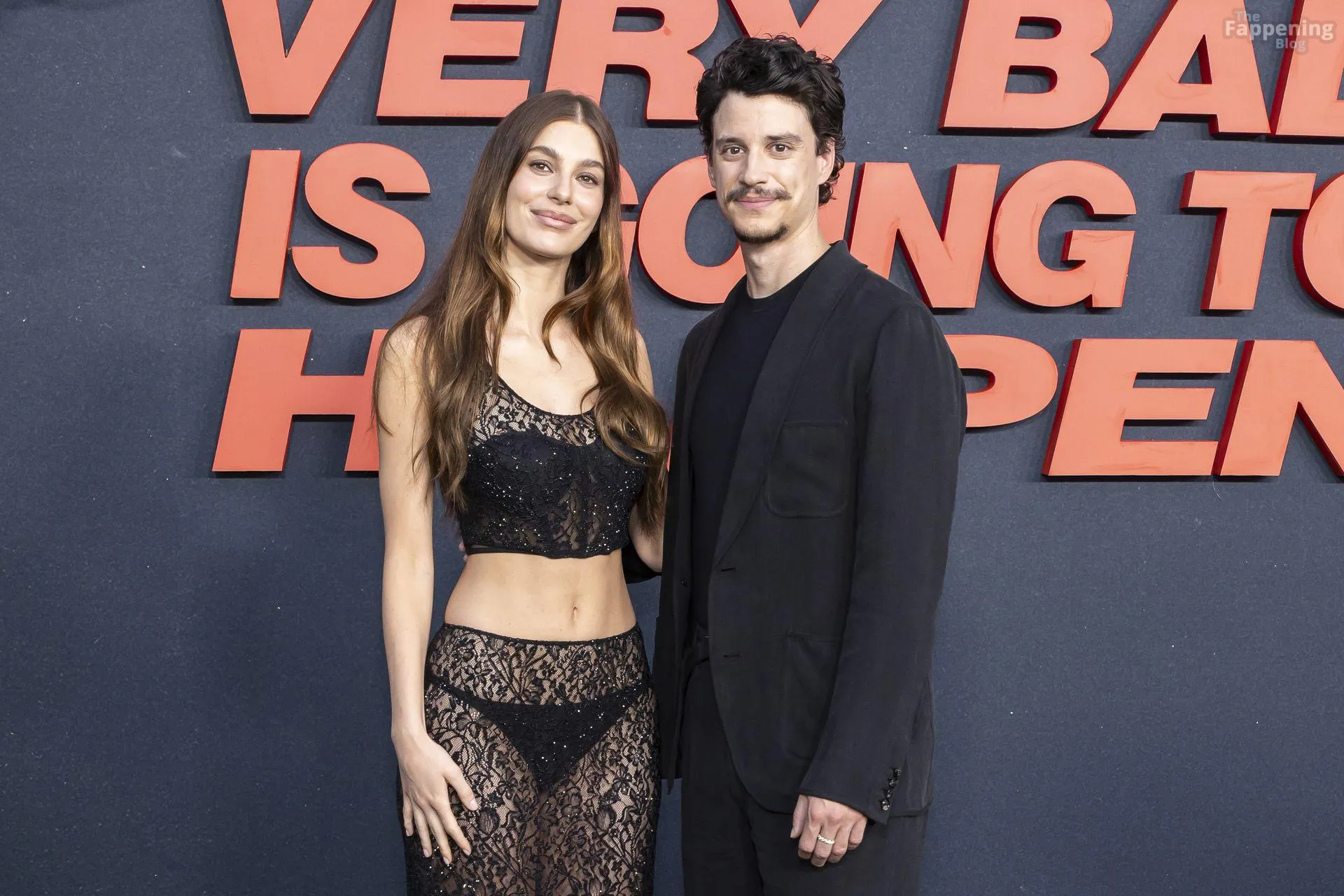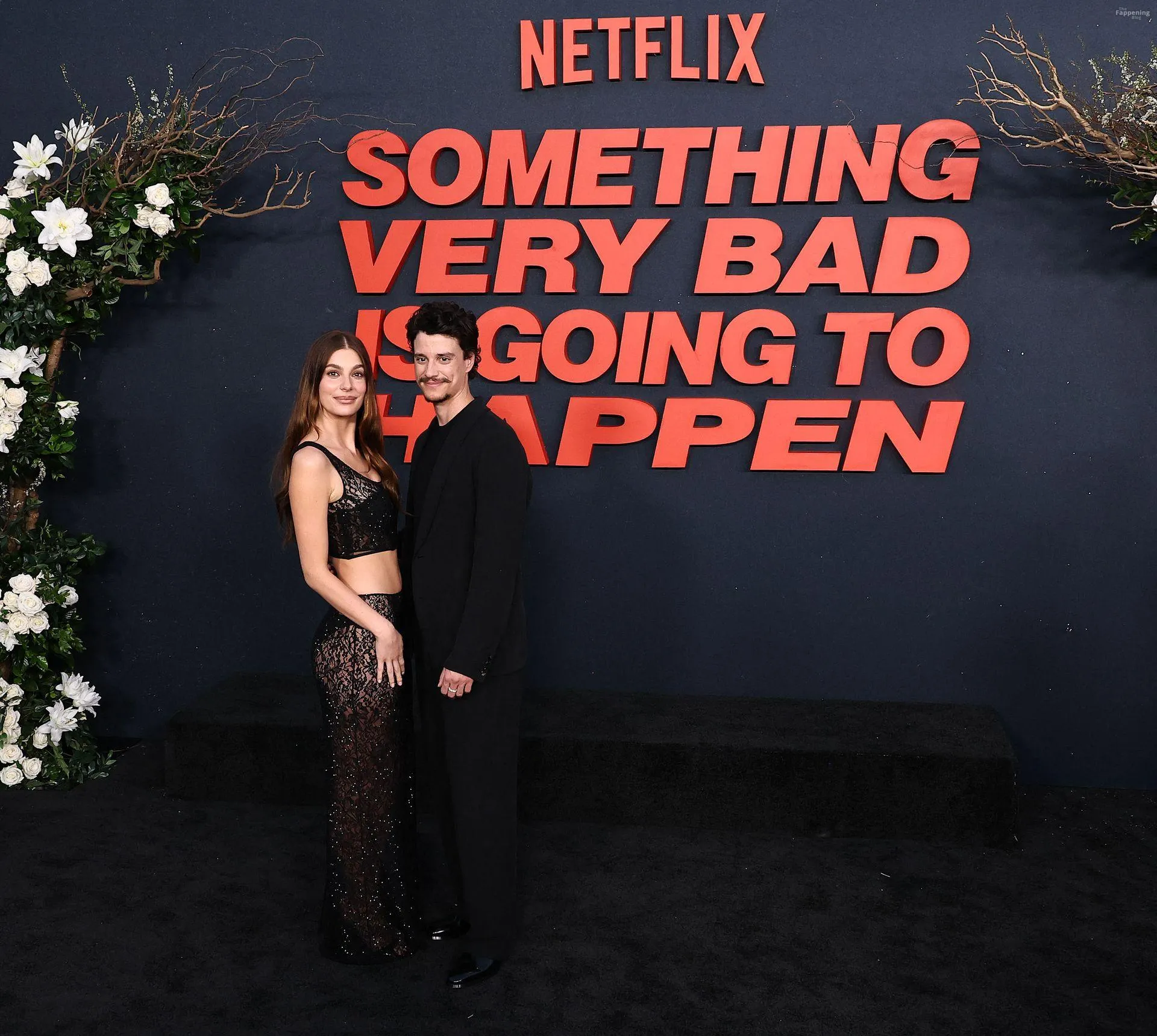 Camila Morrone poses in a black see-through ensemble on the red carpet of the “Something Very Bad Is Going to Happen” LA premiere.