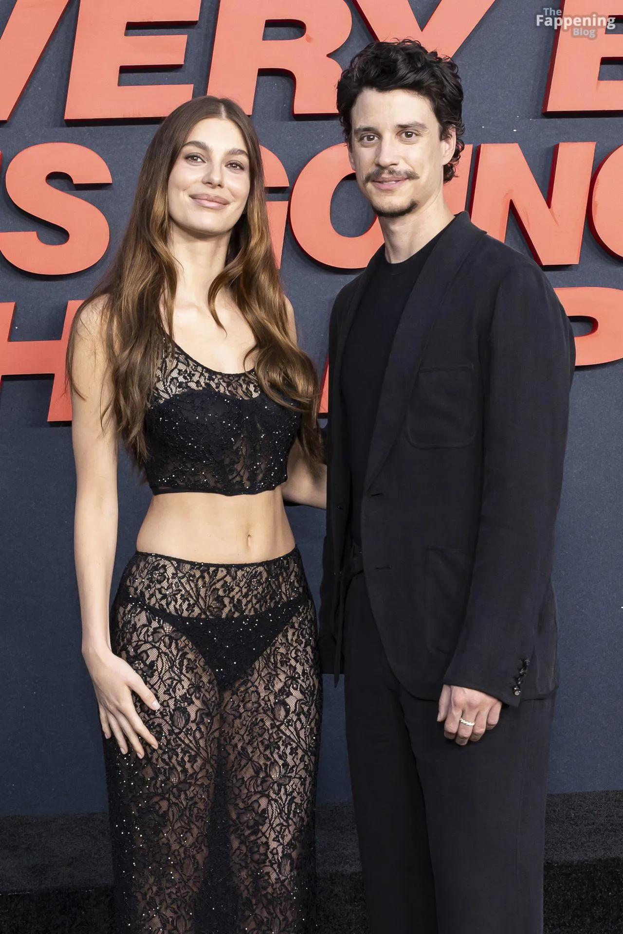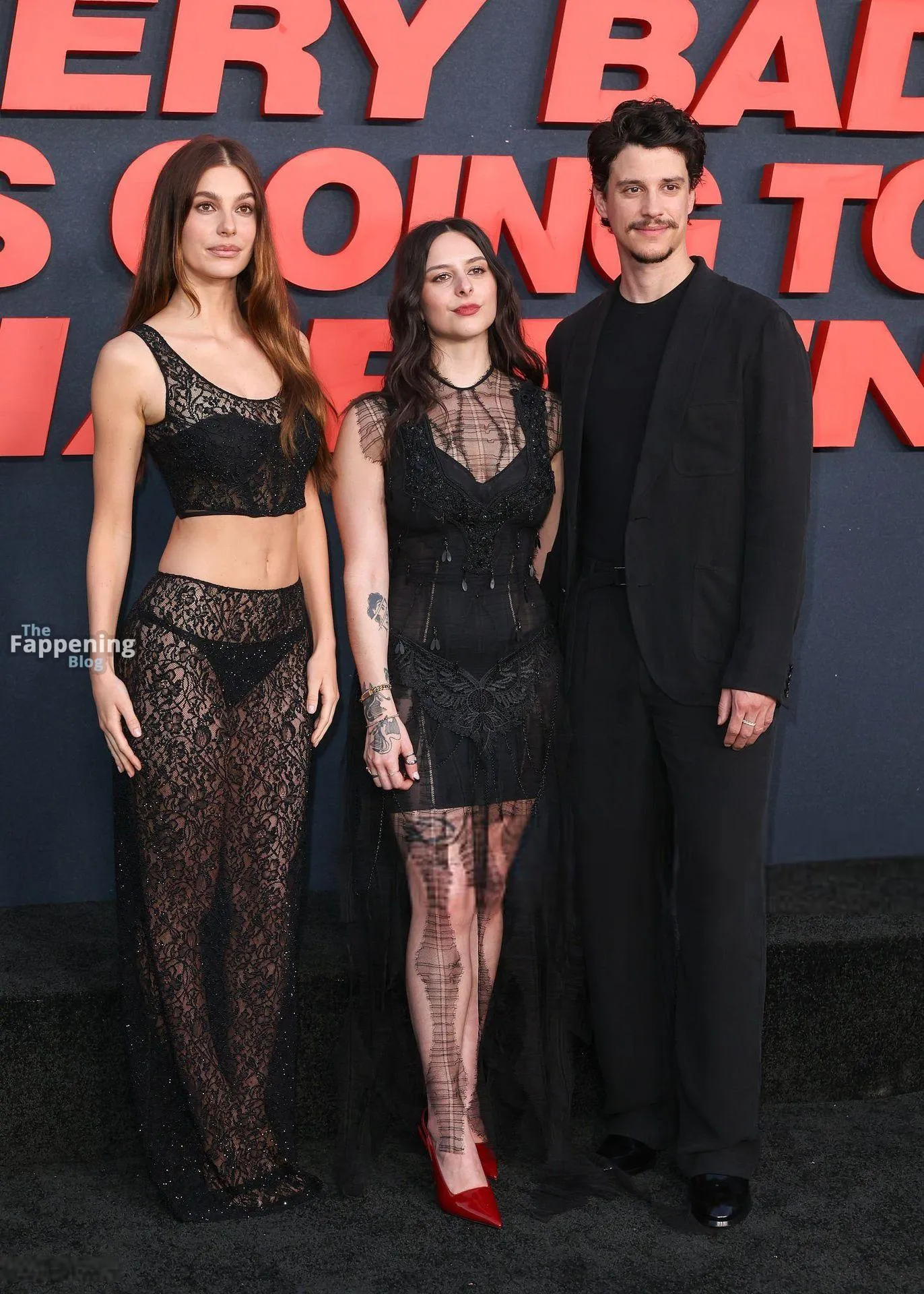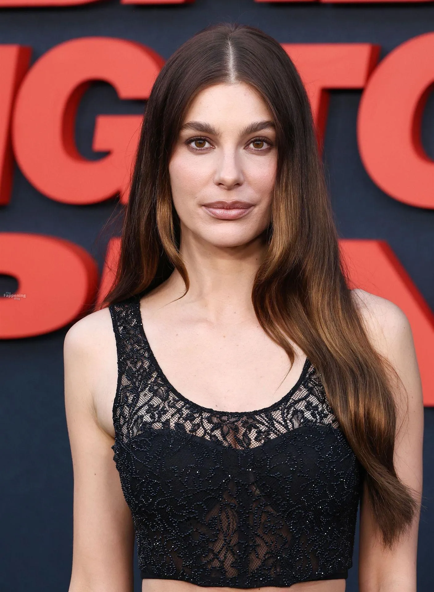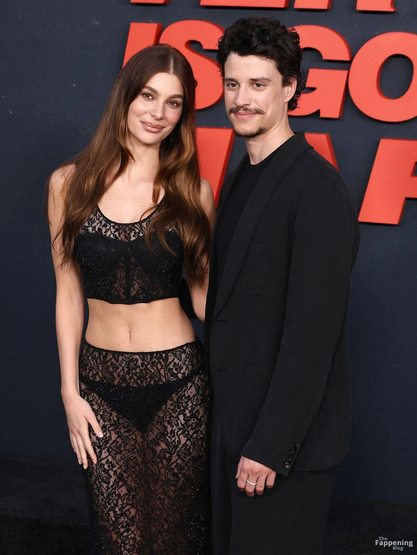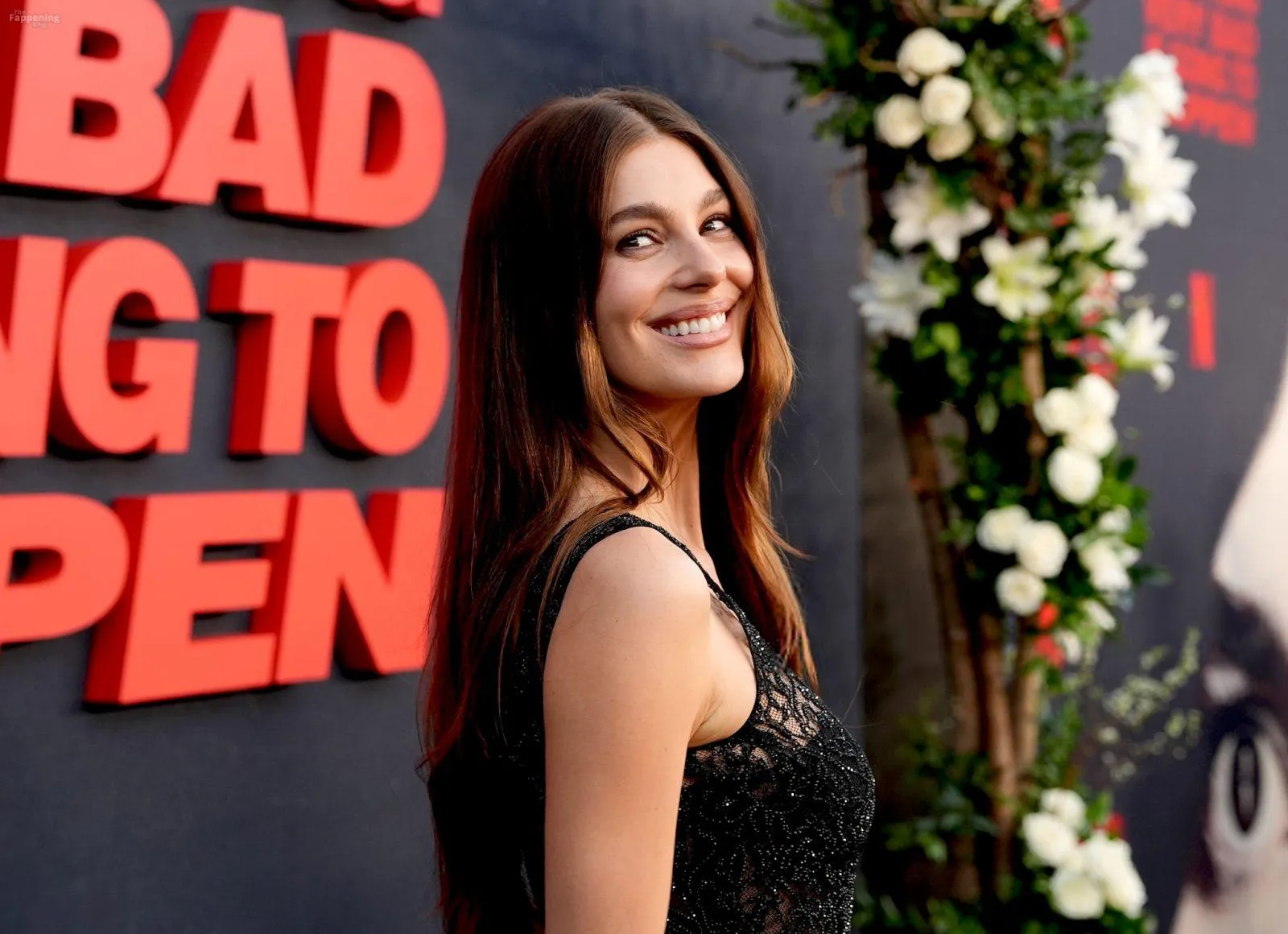 Camila Morrone poses in a black see-through ensemble on the red carpet of the “Something Very Bad Is Going to Happen” LA premiere.