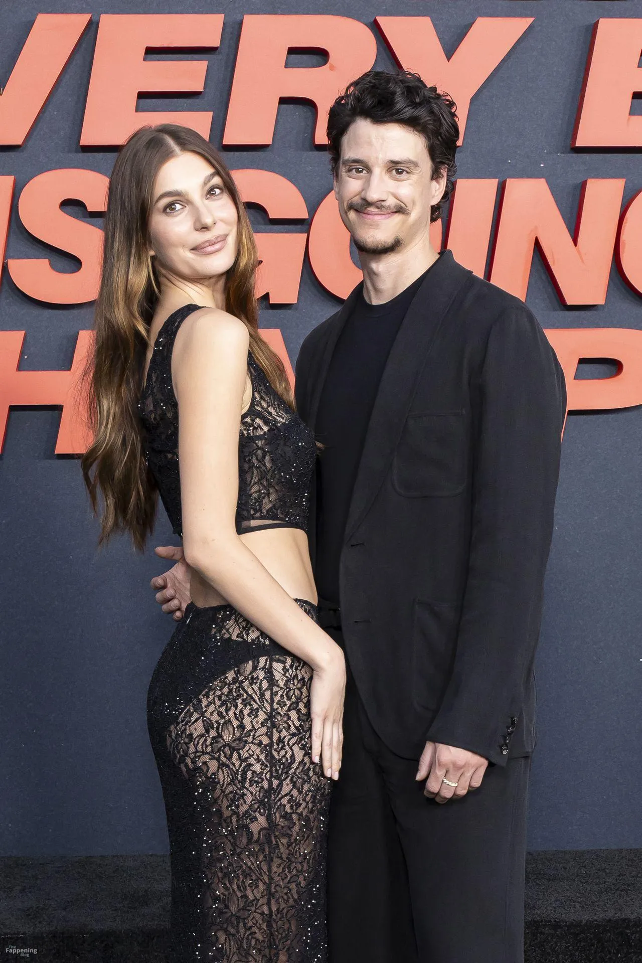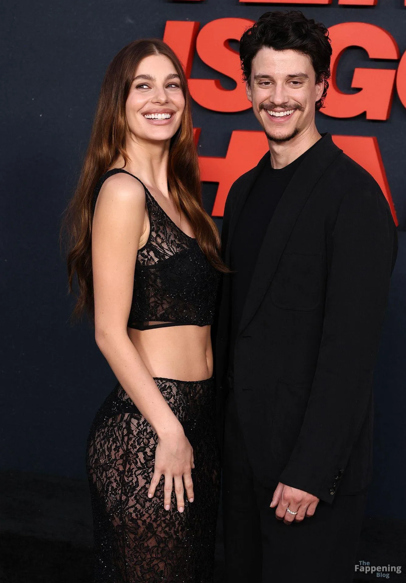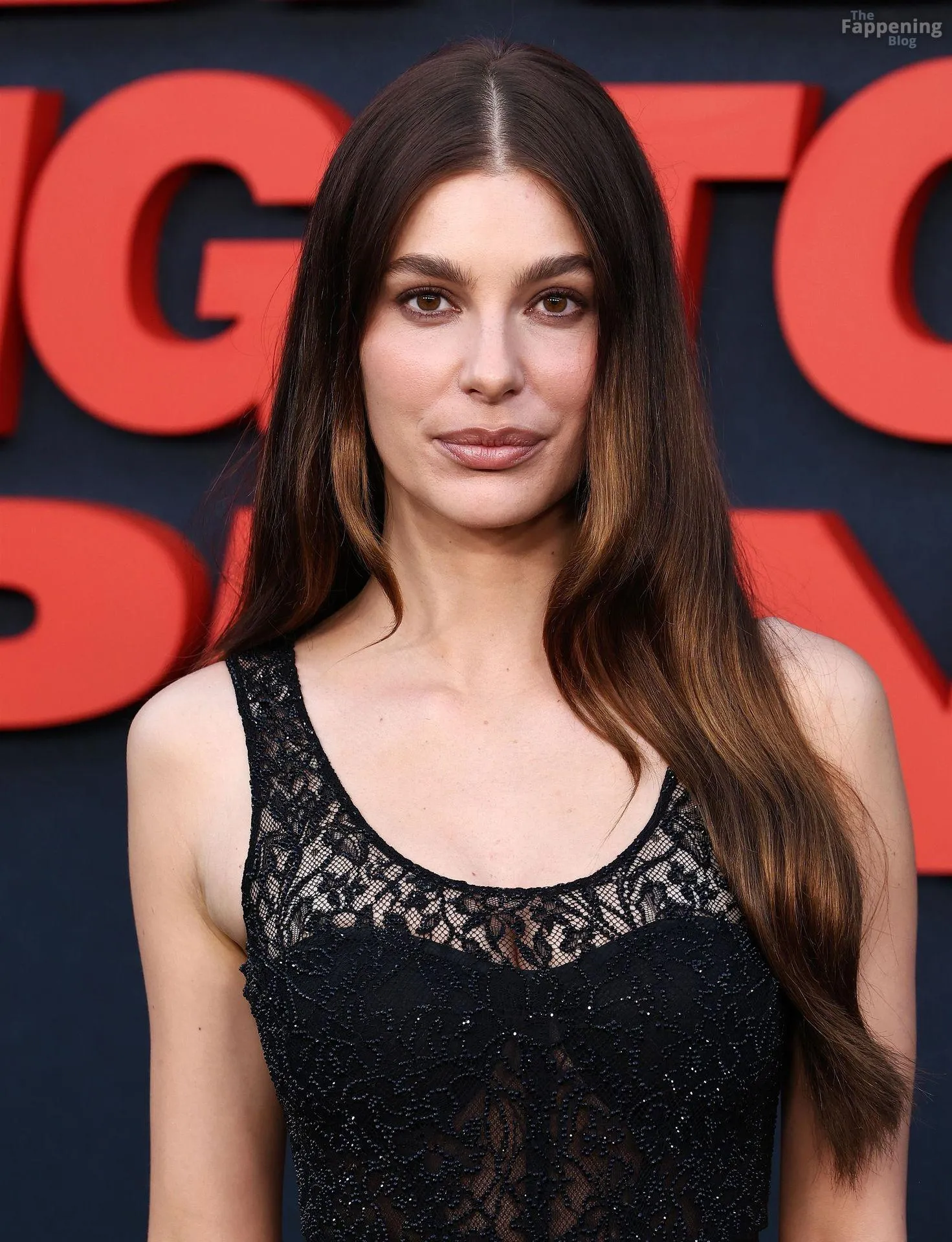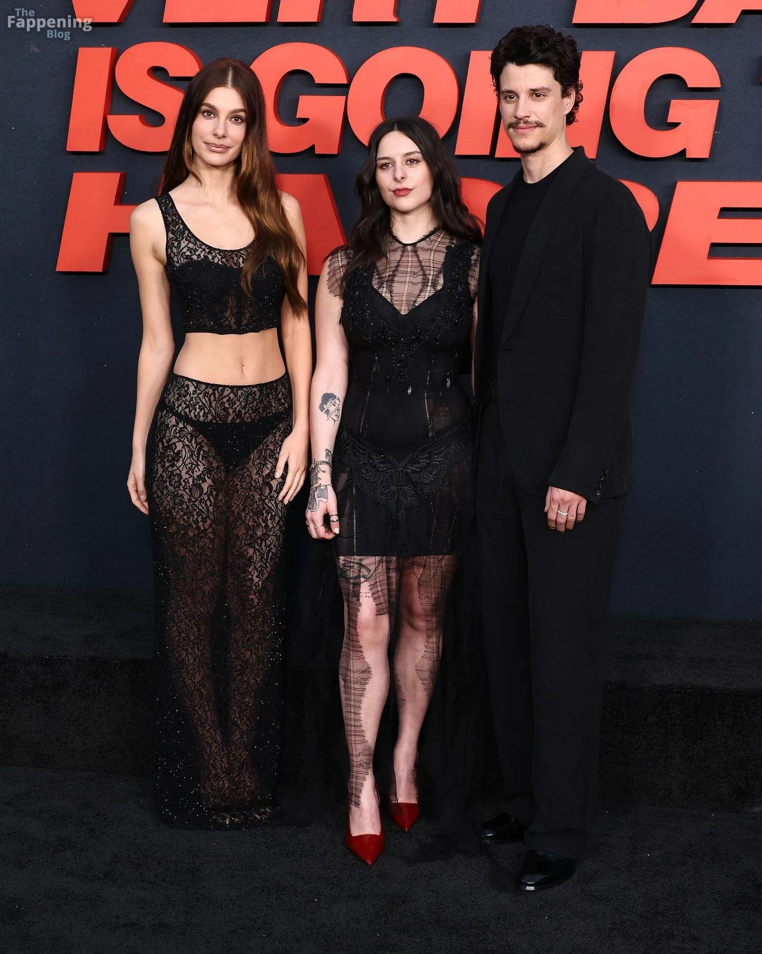 Camila Morrone poses in a black see-through ensemble on the red carpet of the “Something Very Bad Is Going to Happen” LA premiere.