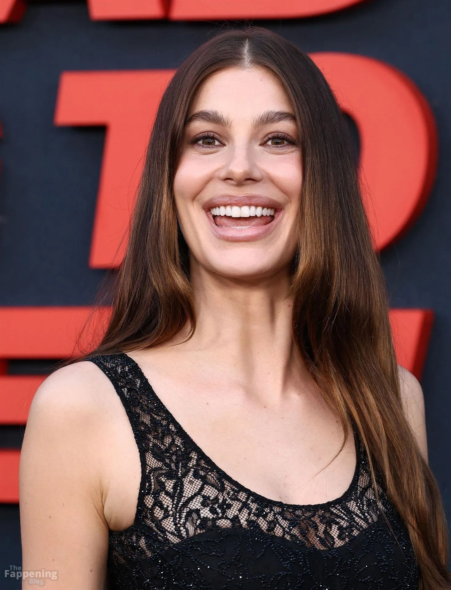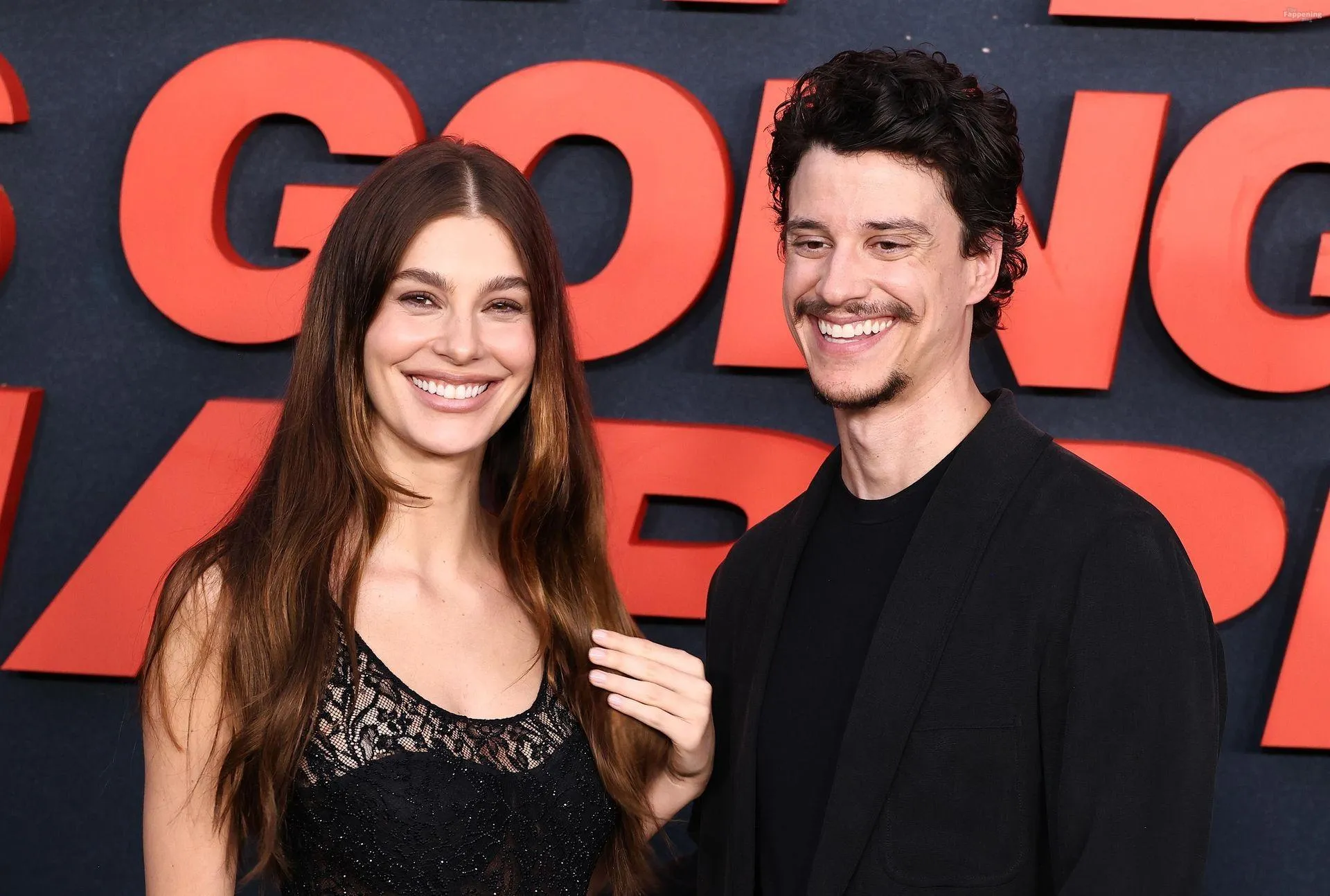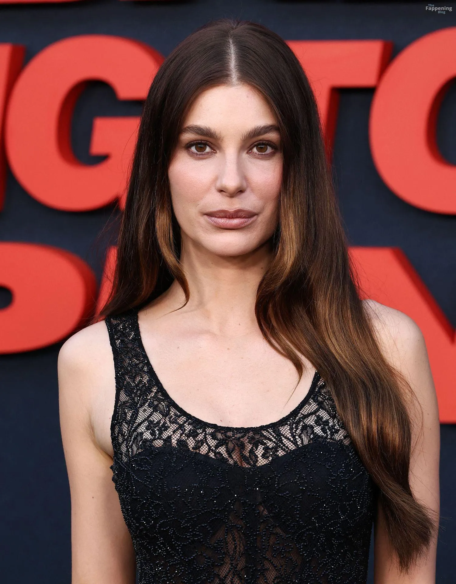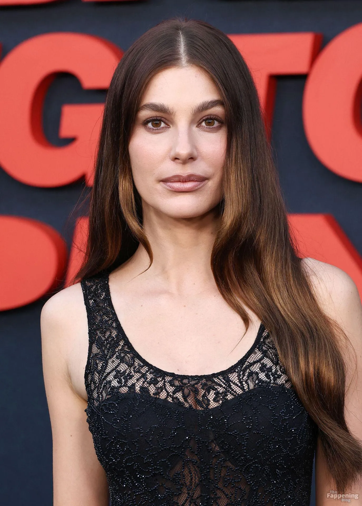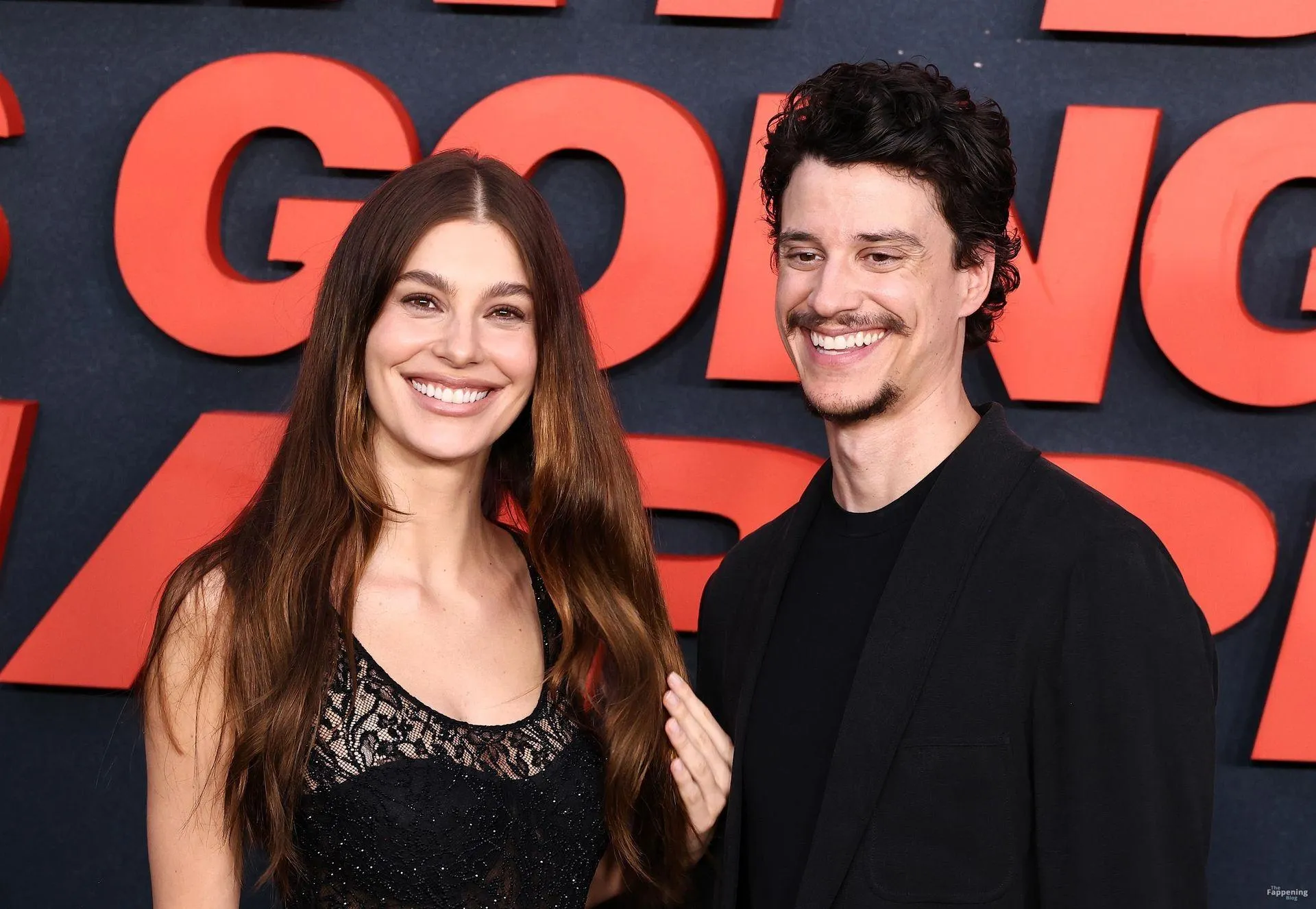 Camila Morrone poses in a black see-through ensemble on the red carpet of the “Something Very Bad Is Going to Happen” LA premiere.