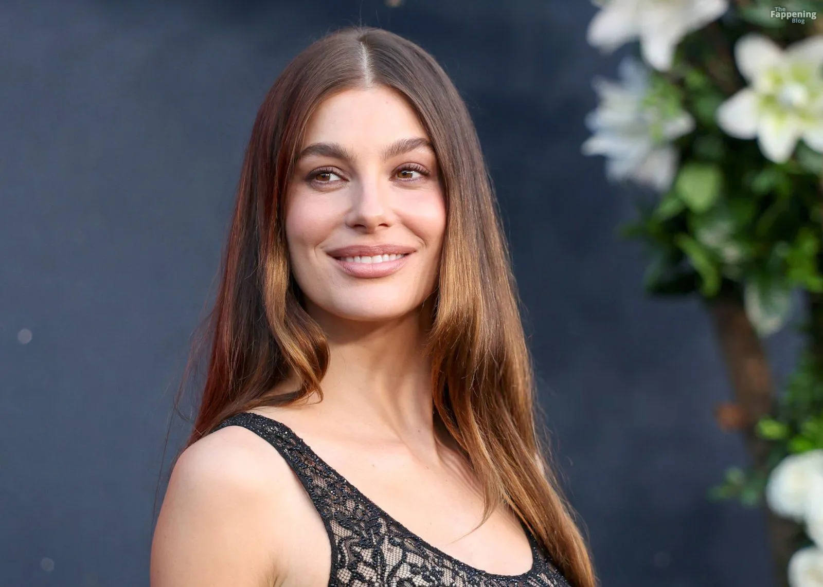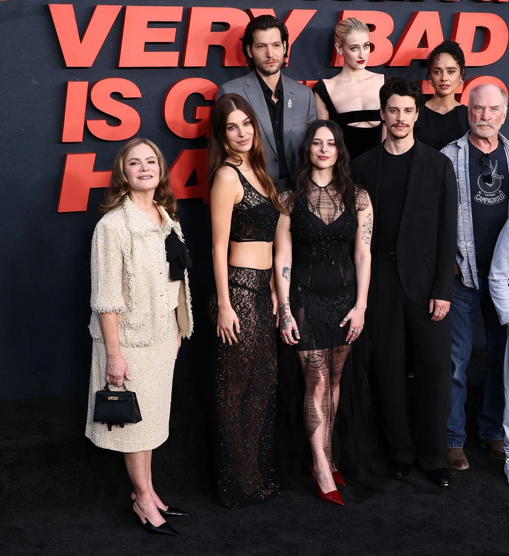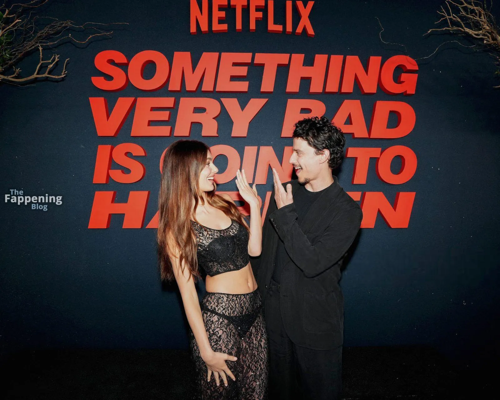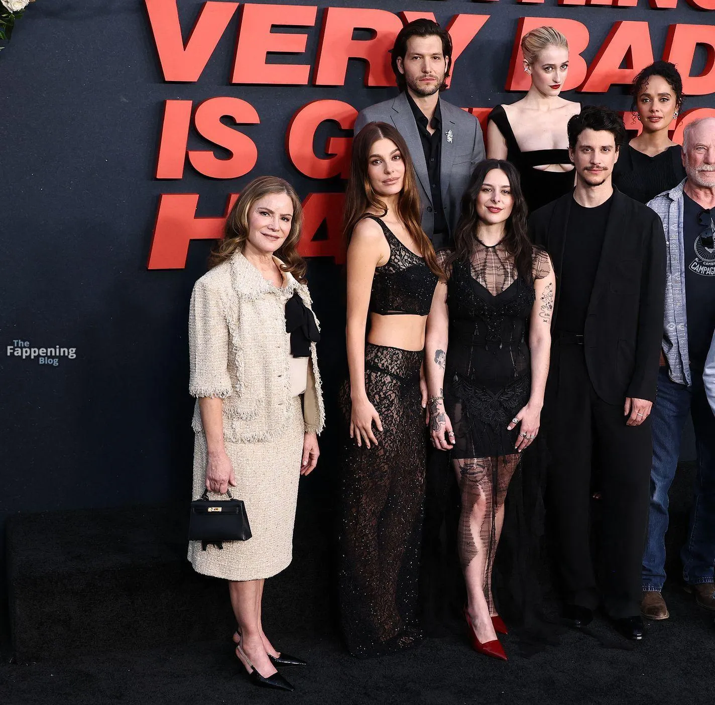 Camila Morrone poses in a black see-through ensemble on the red carpet of the “Something Very Bad Is Going to Happen” LA premiere.