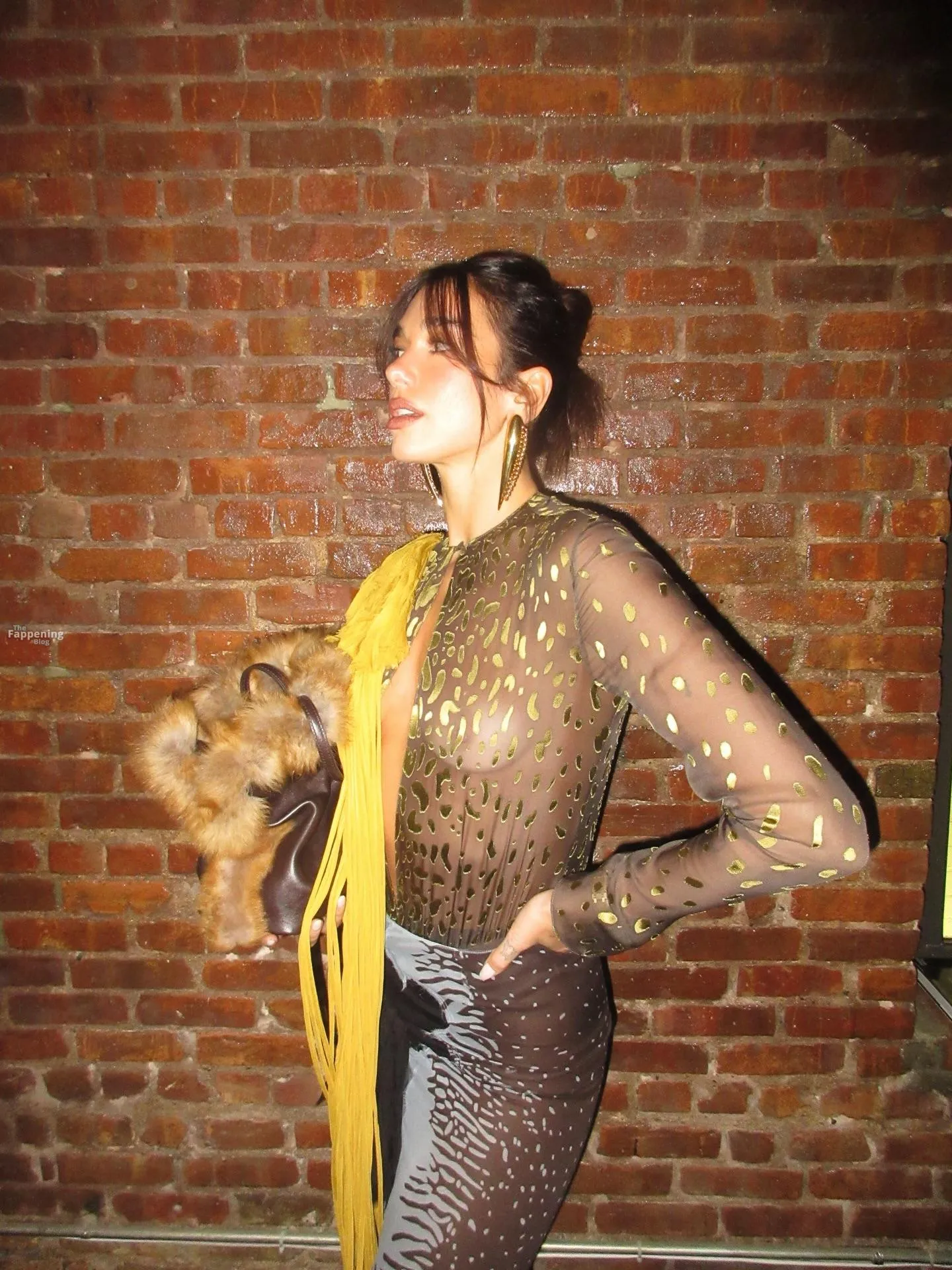 Singer Dua Lipa goes full braless in a sheer top that hides nothing – tits out, hard nipples completely visible.
