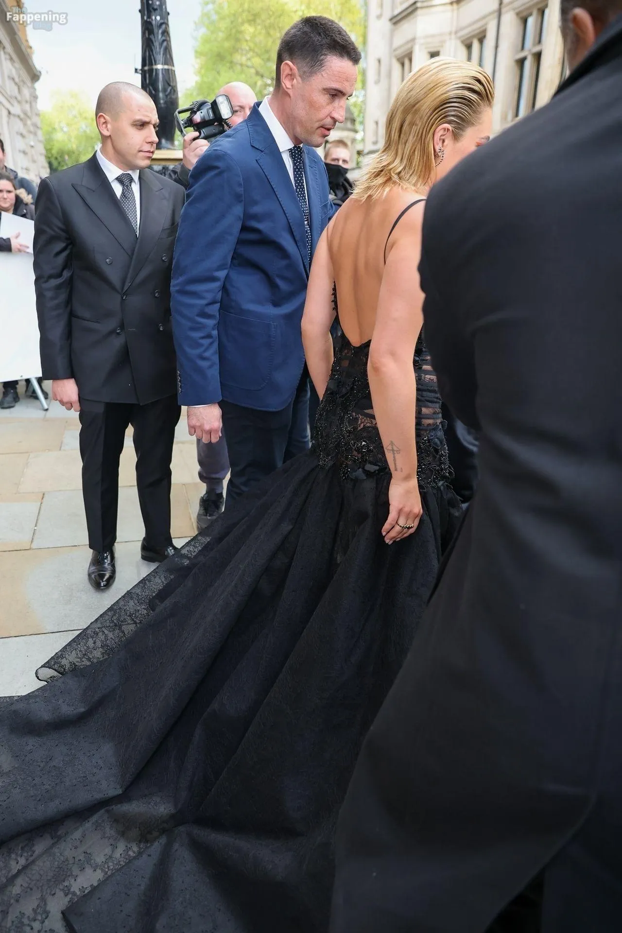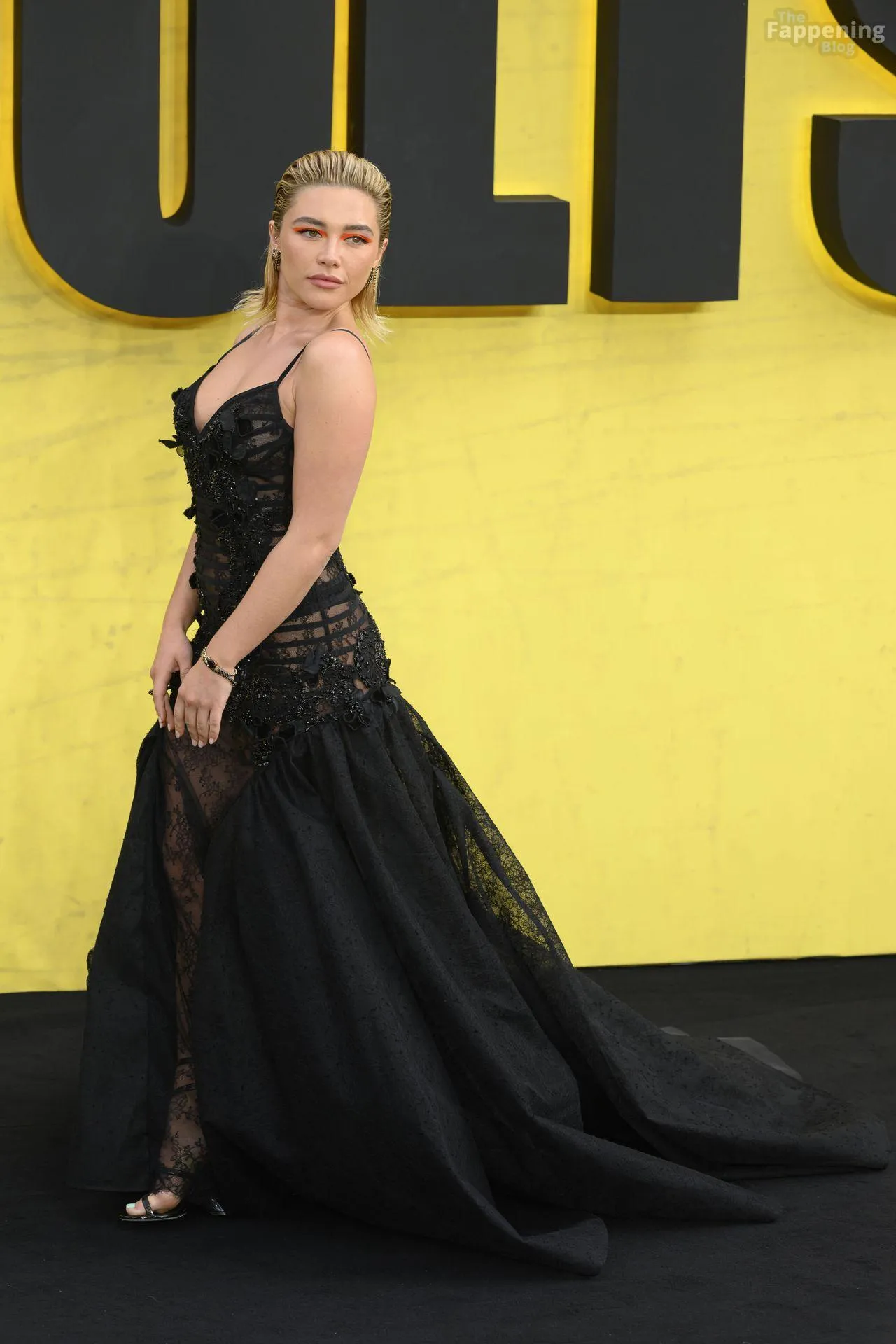 British movie star Florence Pugh, 29, is seen at the Thunderbolts London premiere, rockin’ a romantic, Gothic vibe in a Elie Saab fall 2024 couture fit.