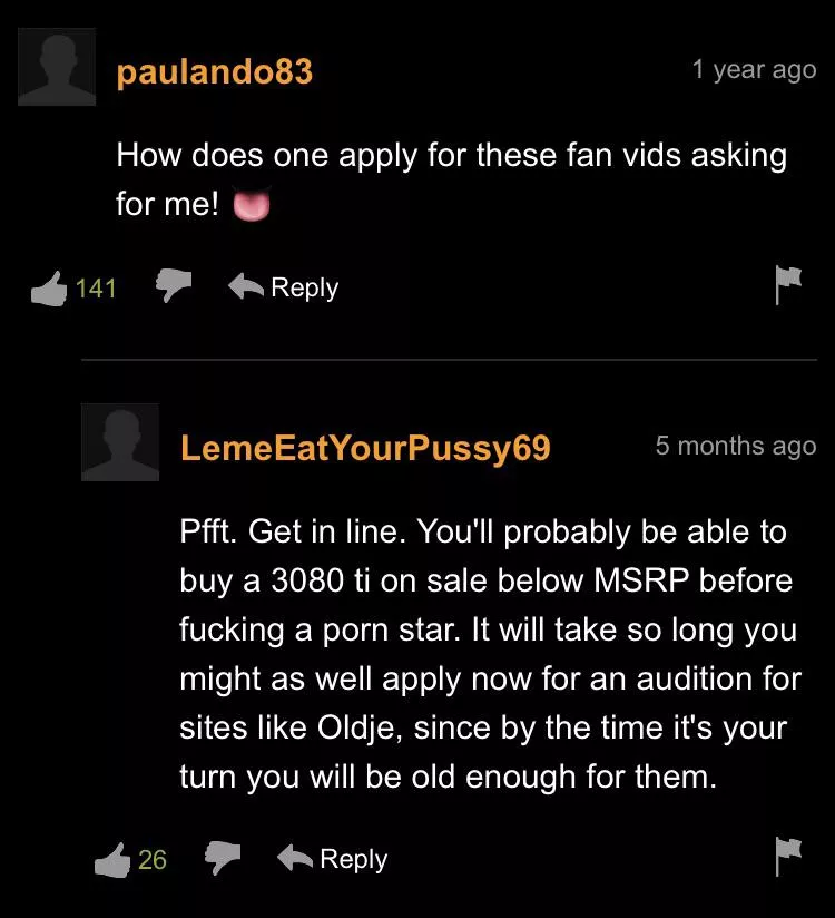"You'll probably be able to buy a 3080 TI below MSRP before fucking a porn star" Not sure if this should go to r/MurderedwithWords nudes