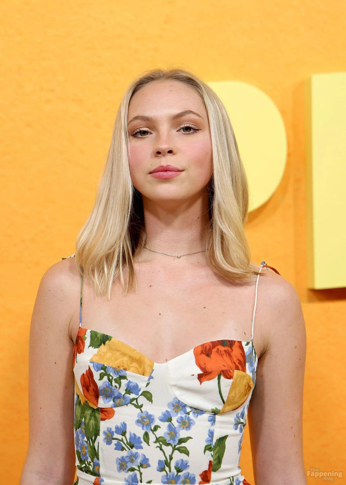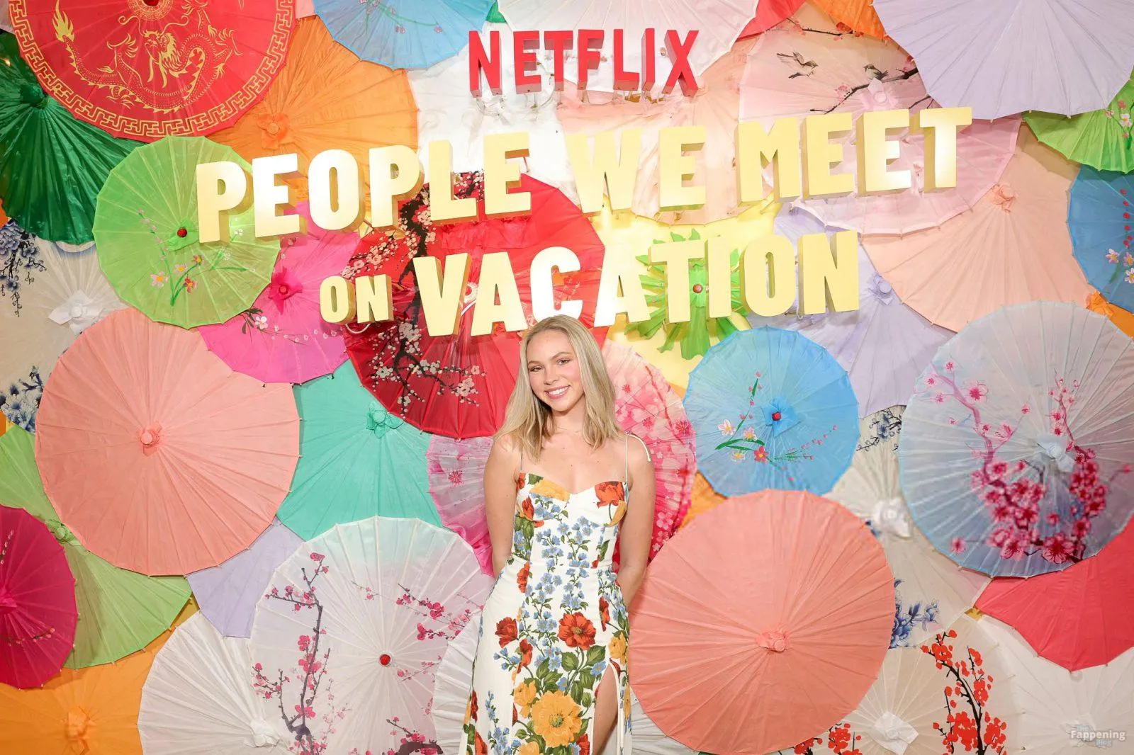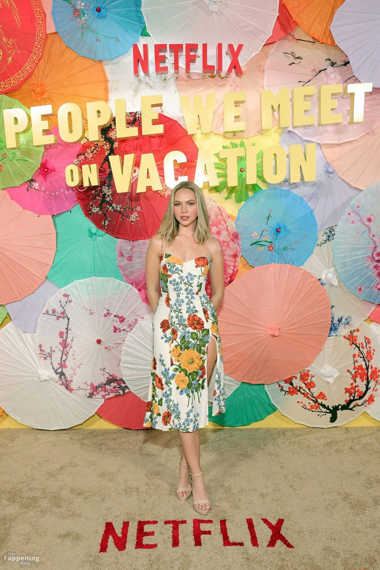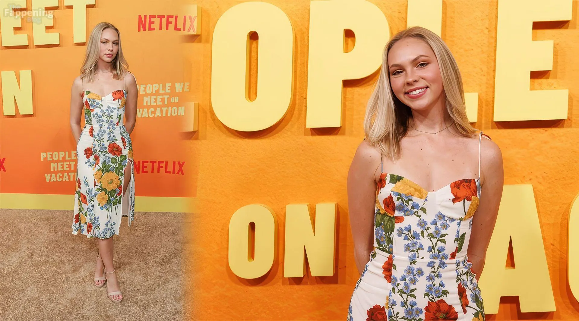 Jordyn Jones attends the “People We Meet On Vacation” premiere in Los Angeles wearing a beautiful floral midi dress.