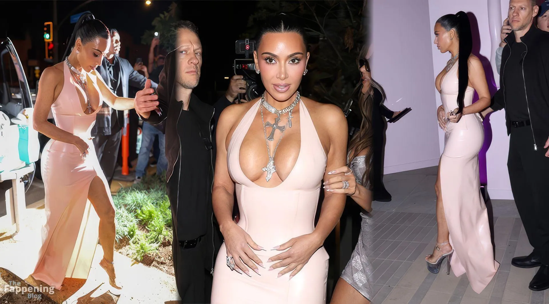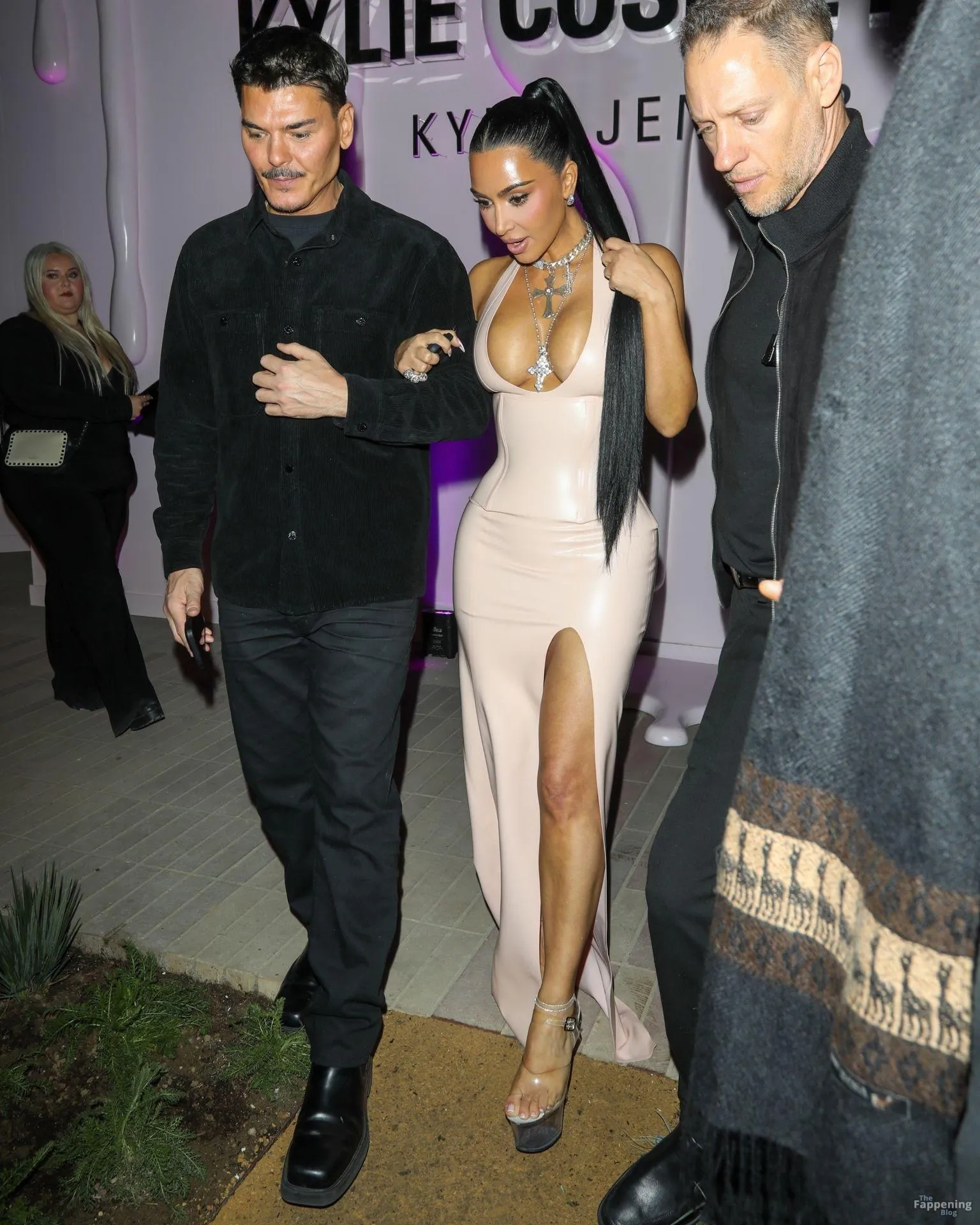 Kim Kardashian showed up at Kylie’s Pop Up Kylie Cosmetics event in West Hollywood, rockin’ a latex dress that had her tits and ass practically burstin’ out.