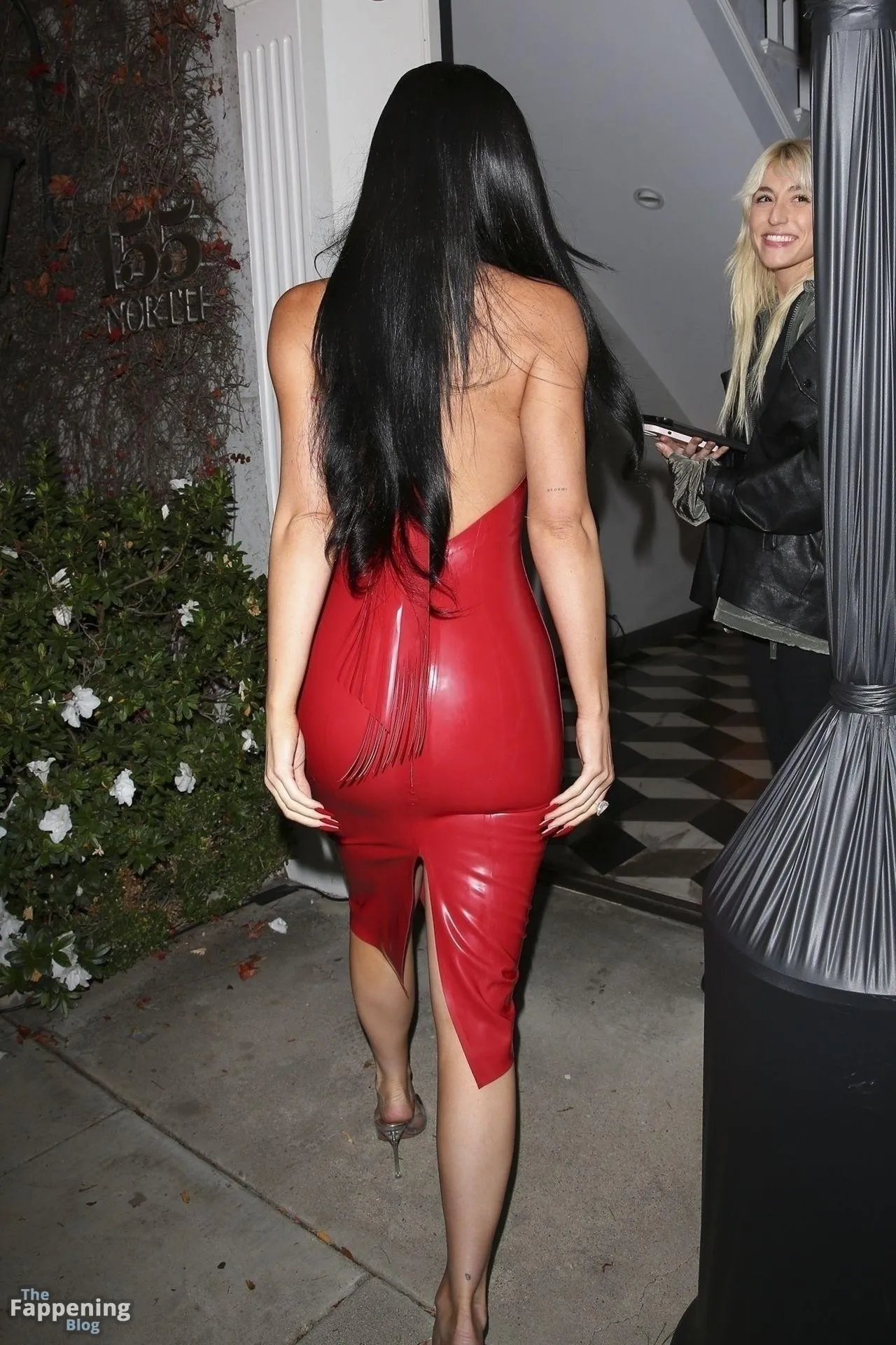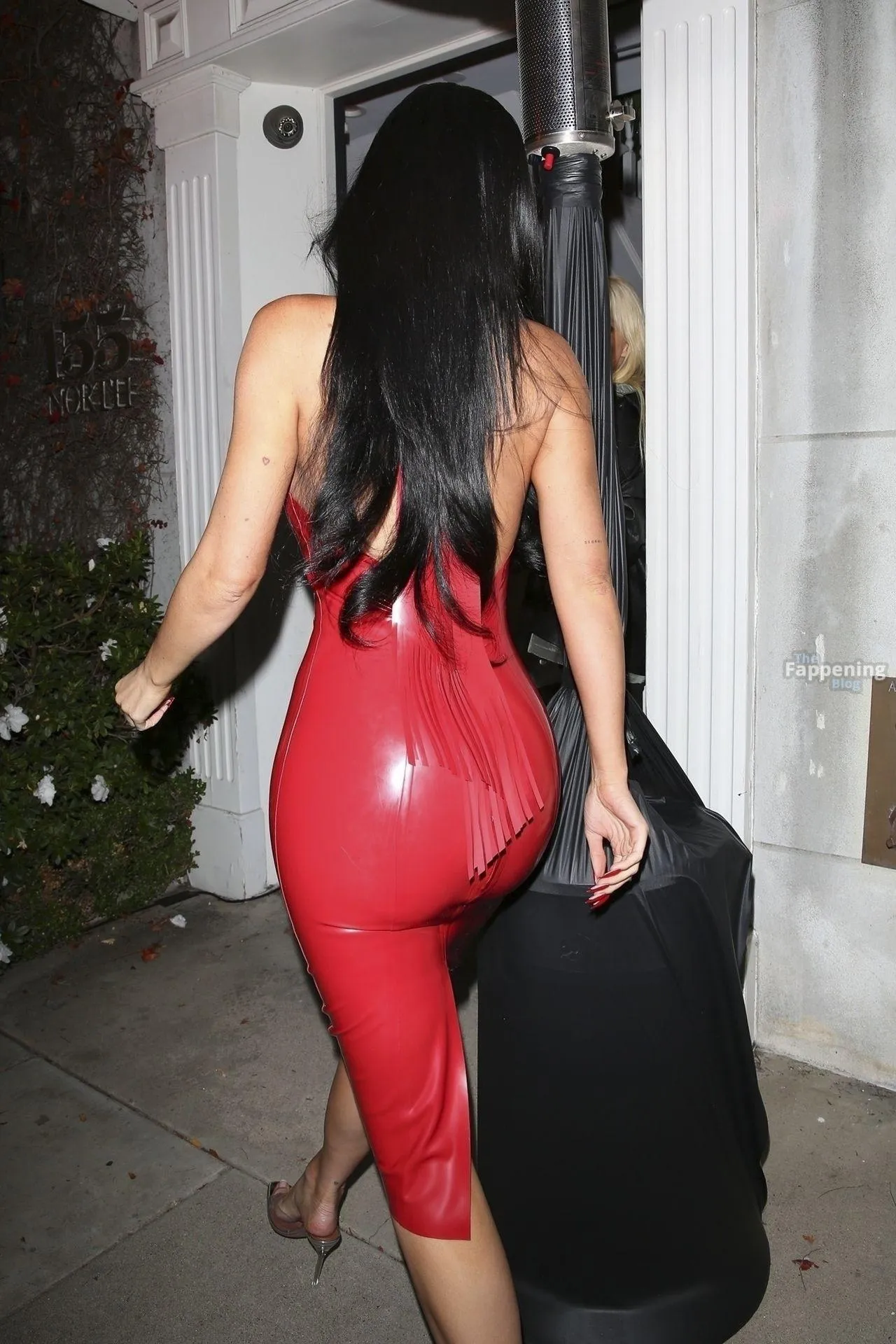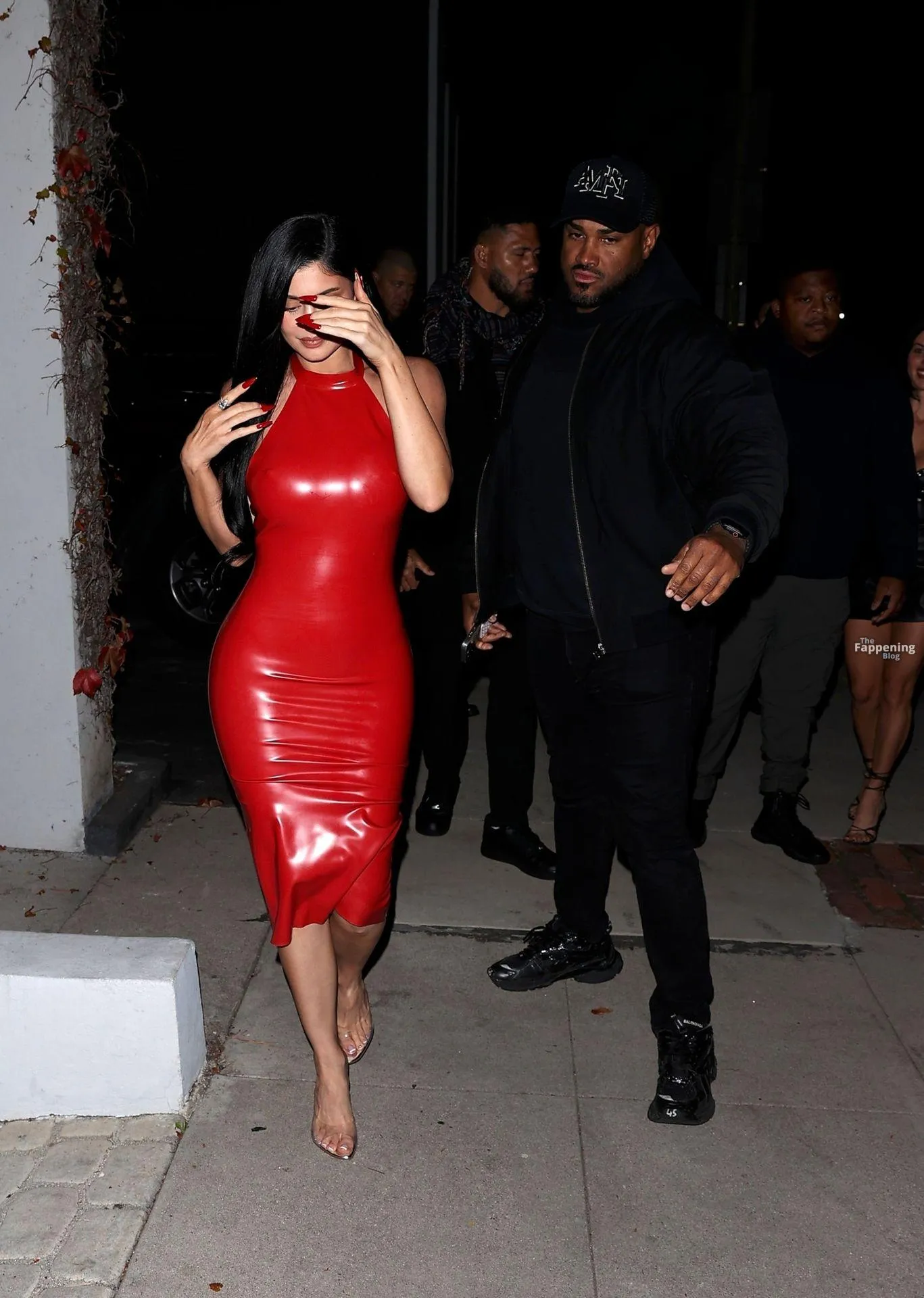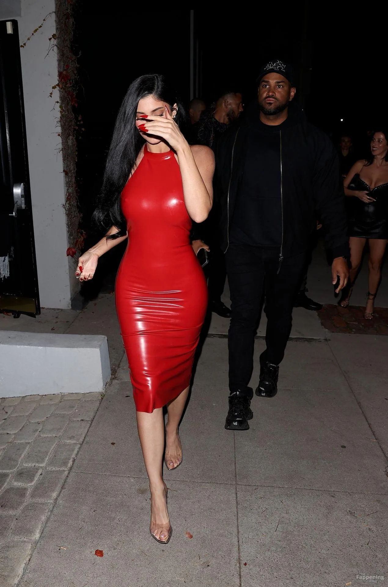Kylie Jenner attended the OBB Media holiday bash in West Hollywood. The model rolled up in a red latex dress without a bra, so her massive tits were pushing hard against the shiny material.
