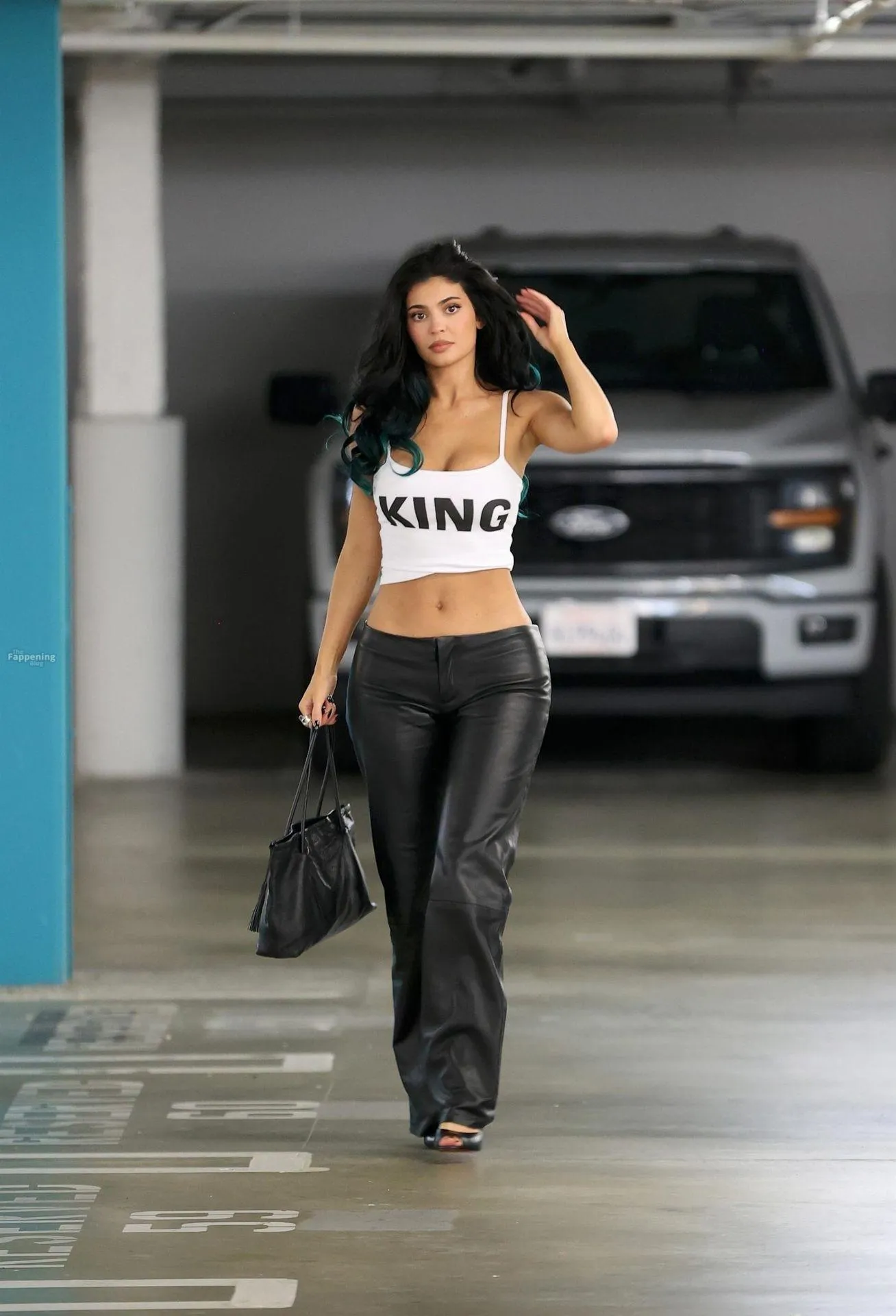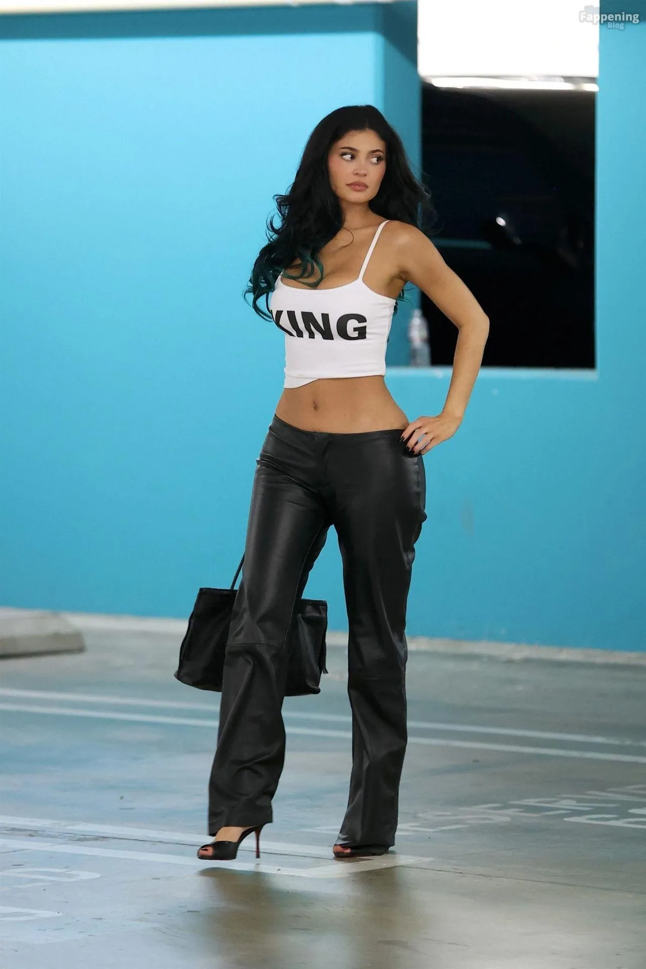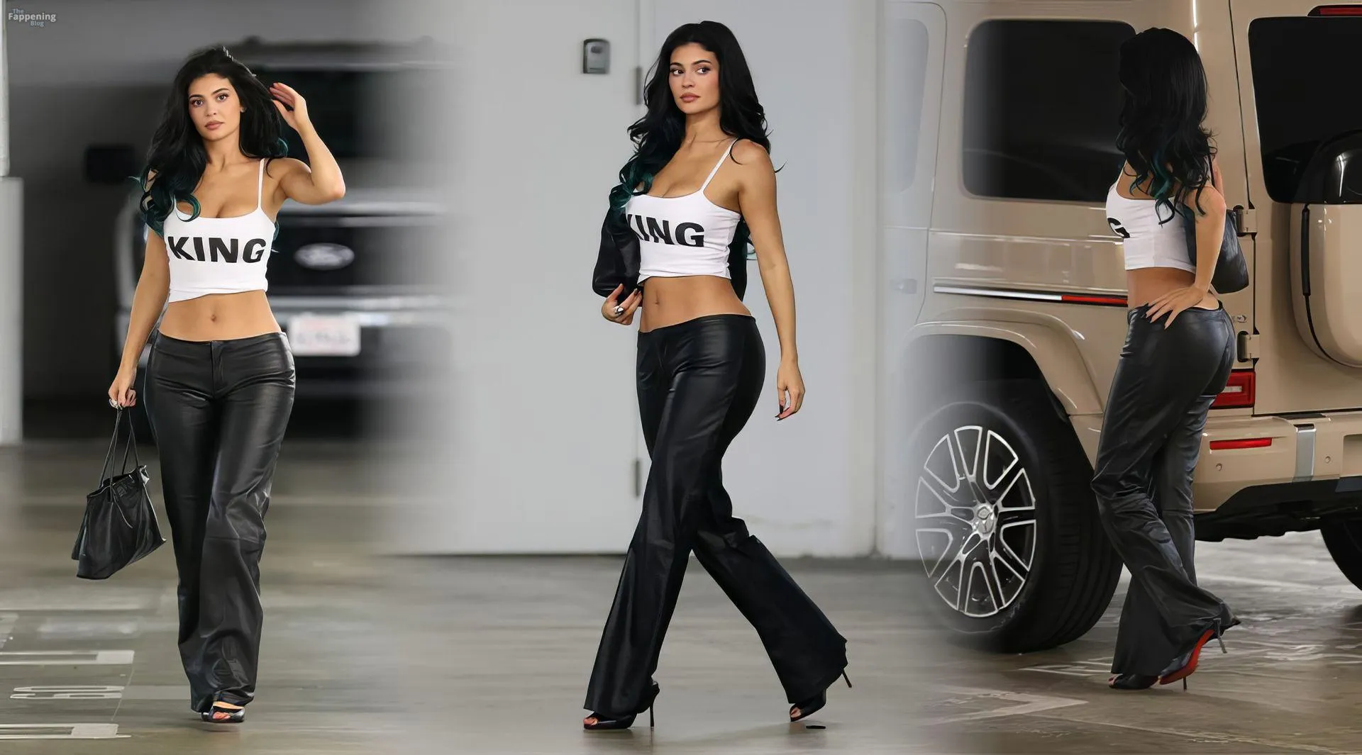 Kylie Jenner was seen in LA, rockin’ a tiny “KING” top and tight leather pants. Cleavage and abs were out there for all to see.