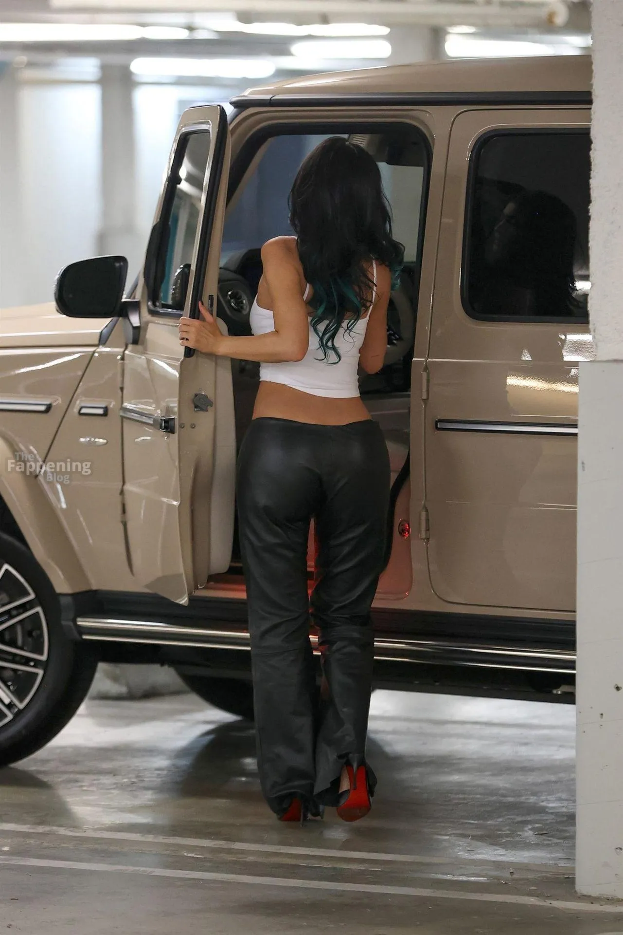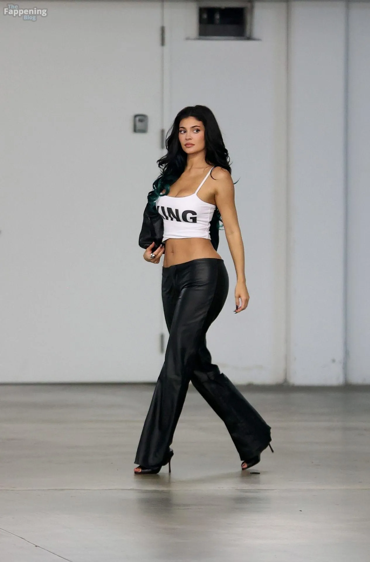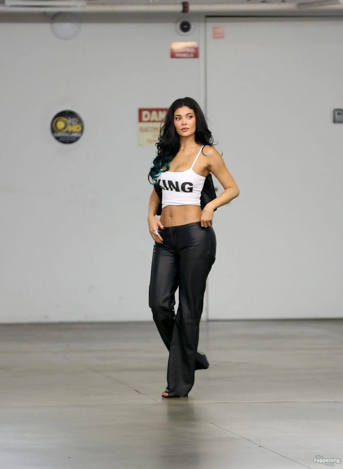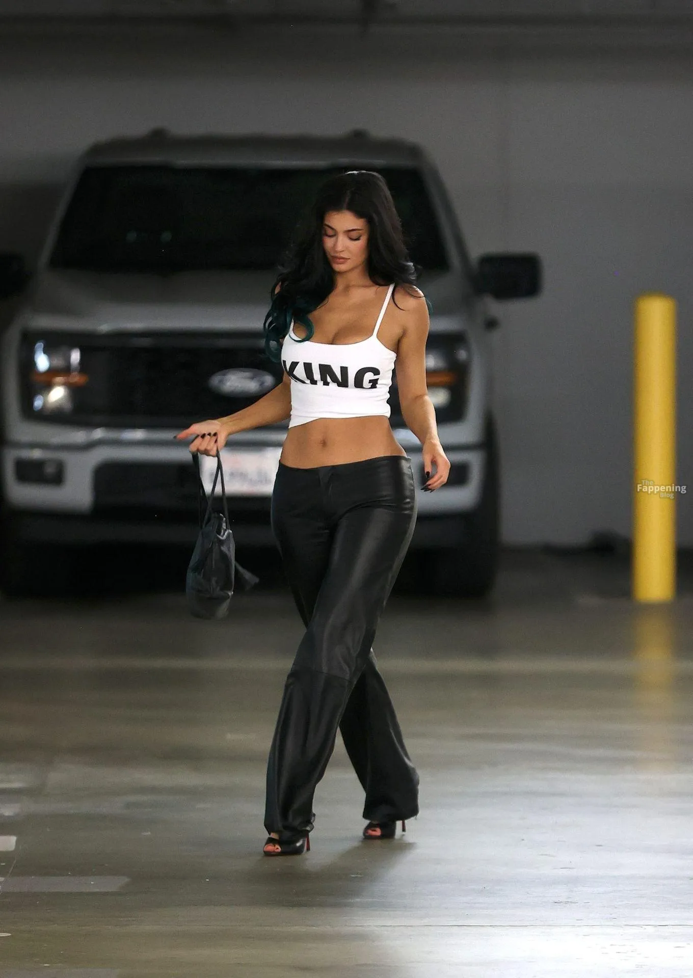 Kylie Jenner was seen in LA, rockin’ a tiny “KING” top and tight leather pants. Cleavage and abs were out there for all to see.