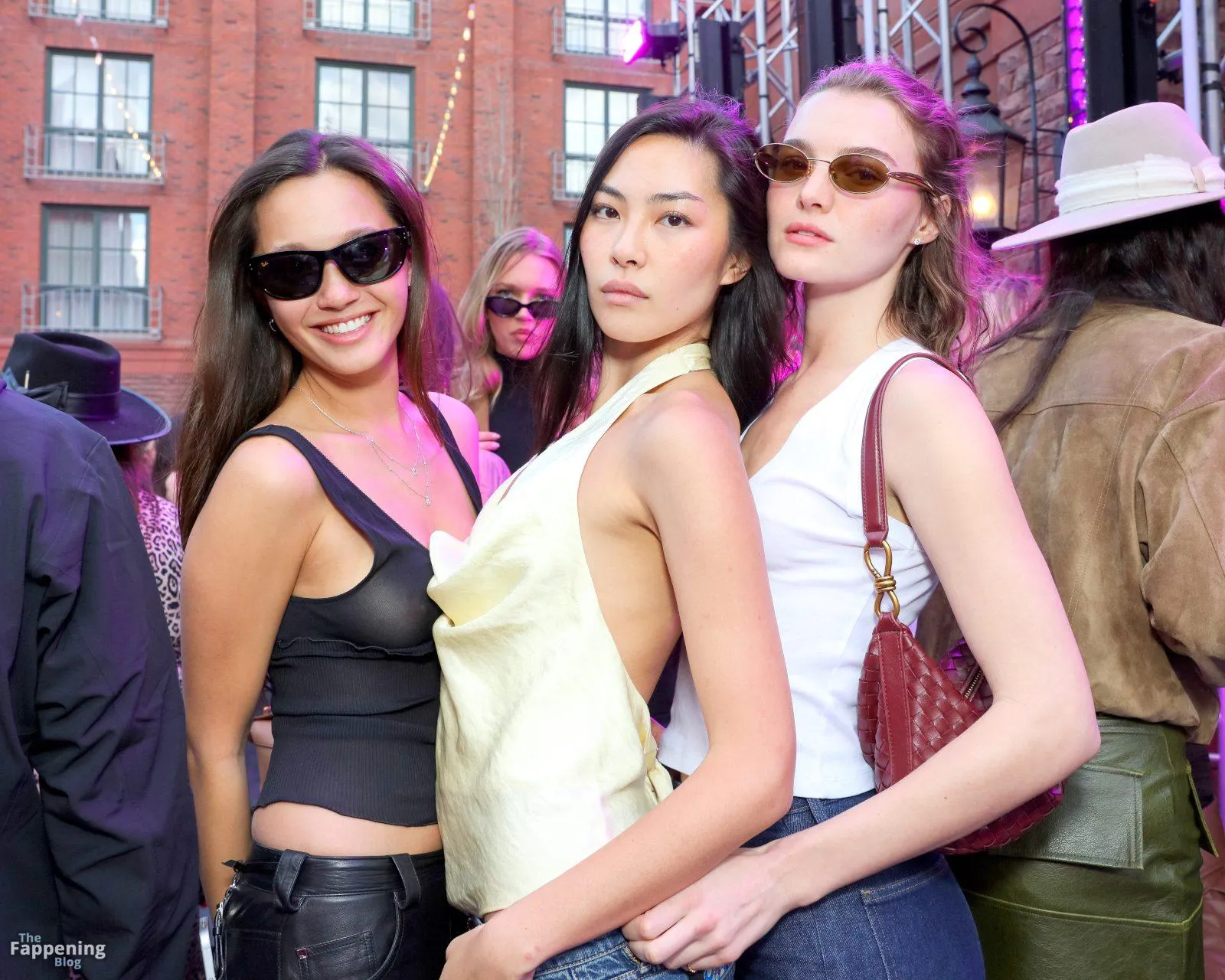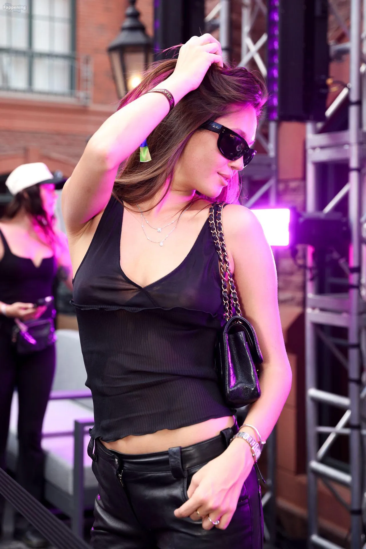 Braless Lily Chee flaunts her perky nipples in a totally see-through top and tight leather pants.