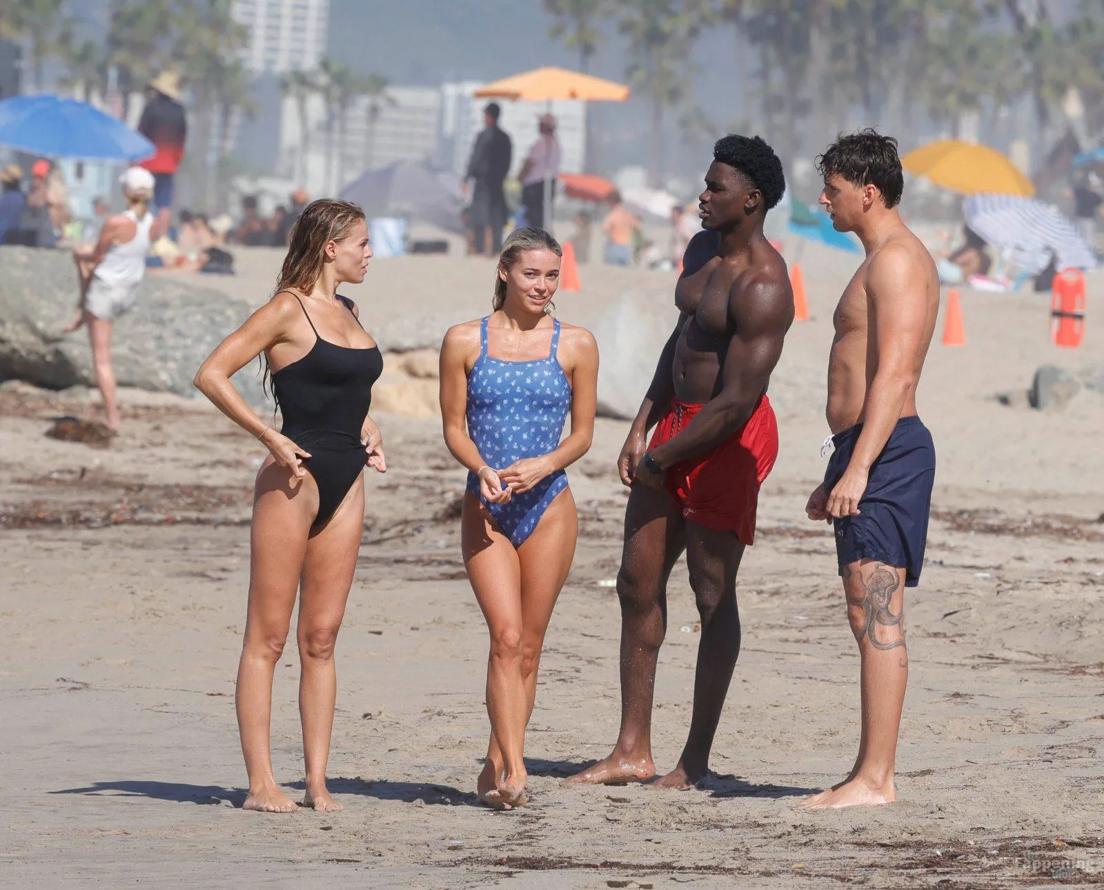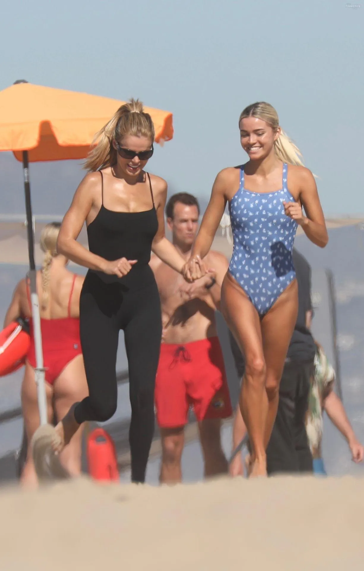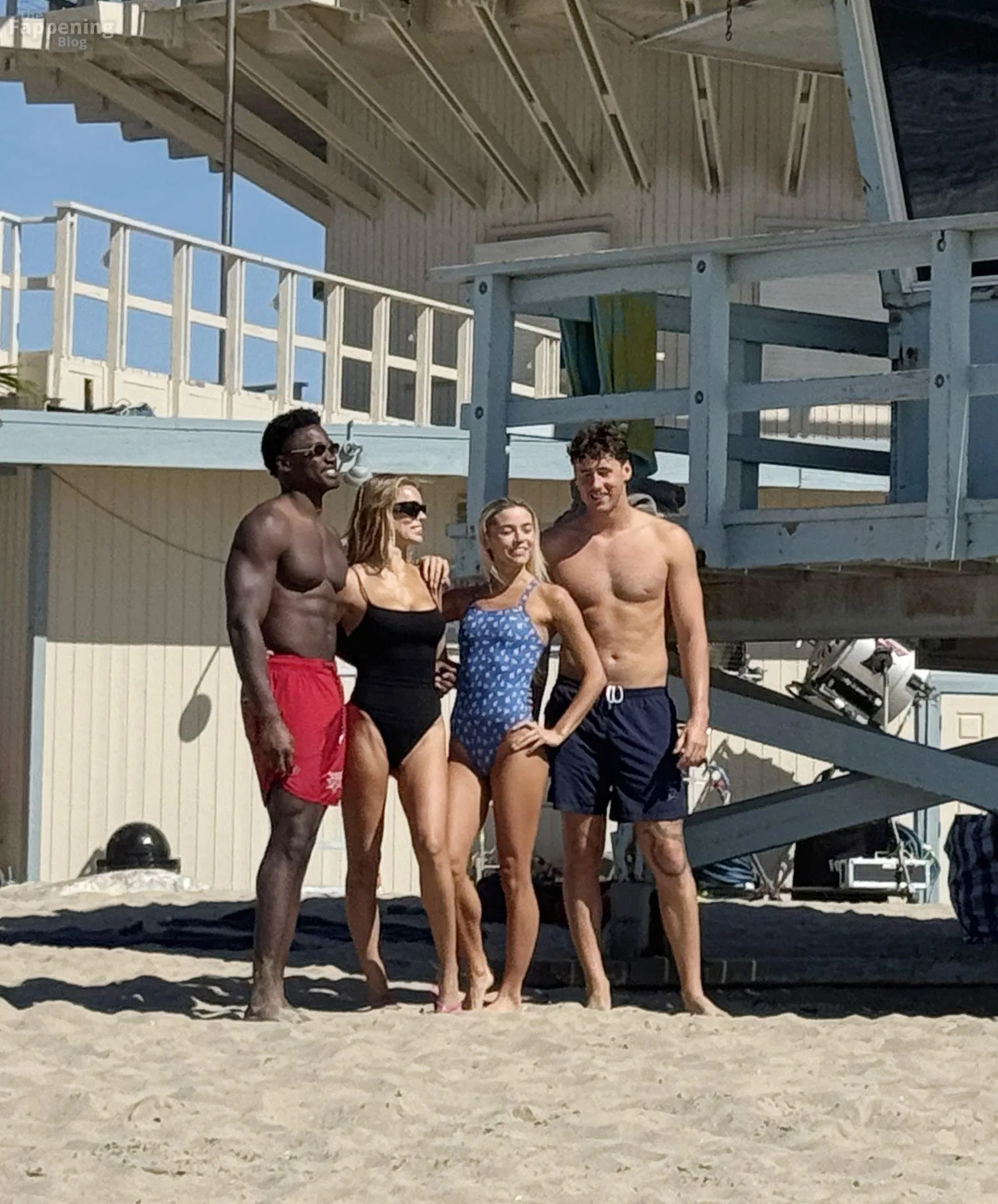 Livvy Dunne and Brooks Nader trained on the beach in Los Angeles for the “Baywatch” reboot during an intense workout. Livvy wore a blue polka-dot swimsuit, while Brooks wore a black catsuit.