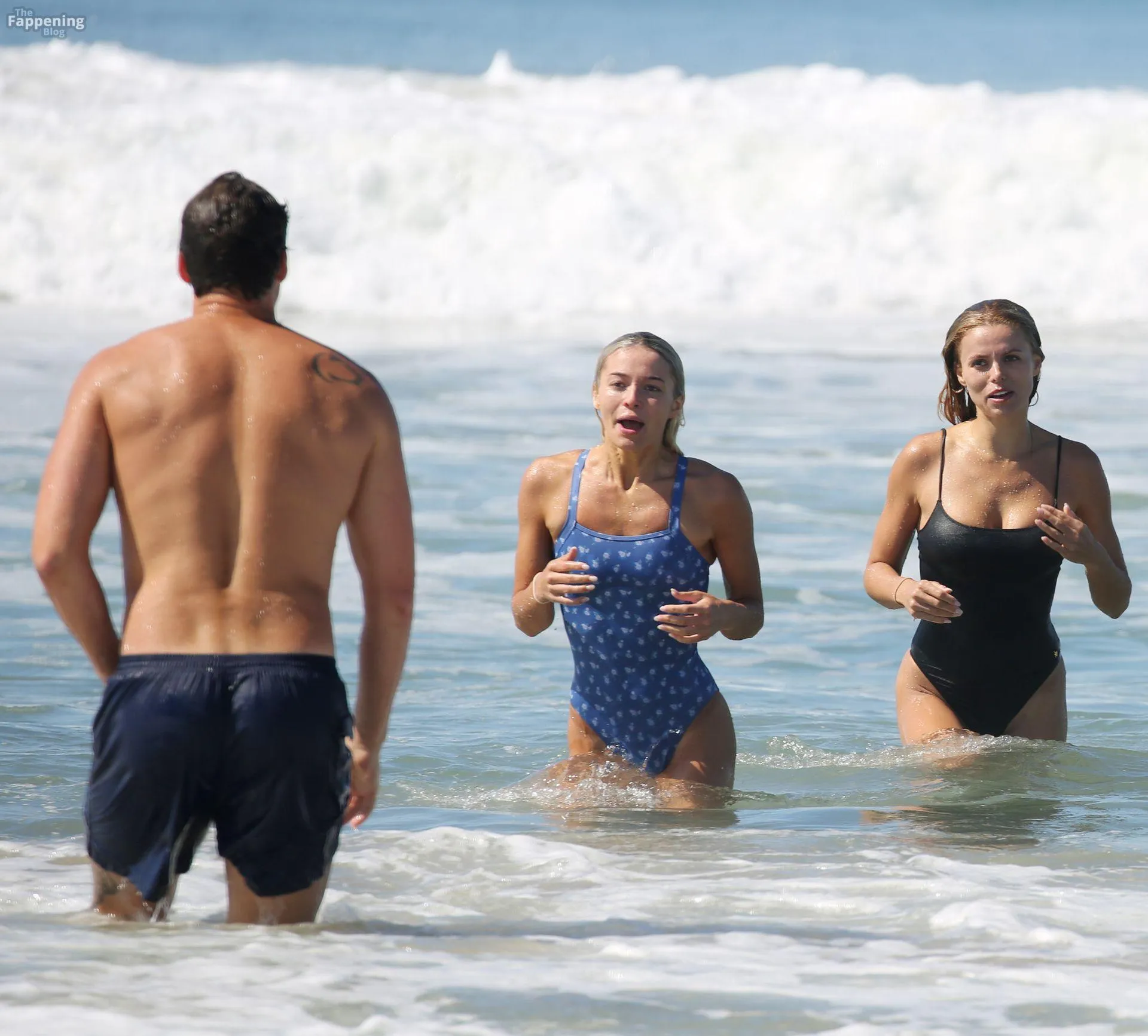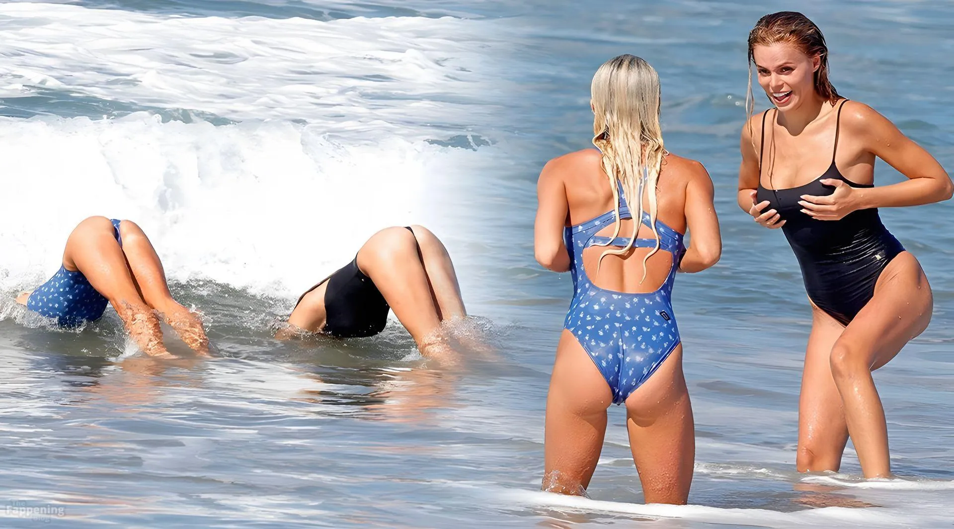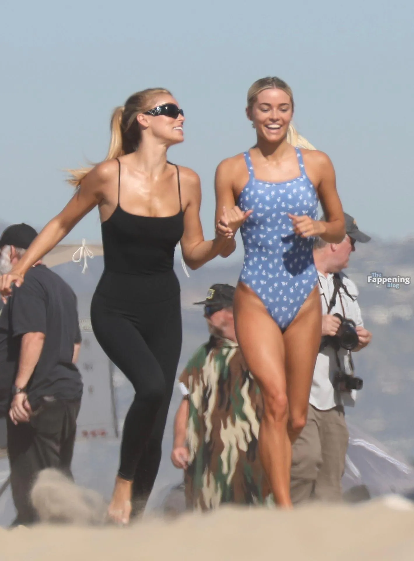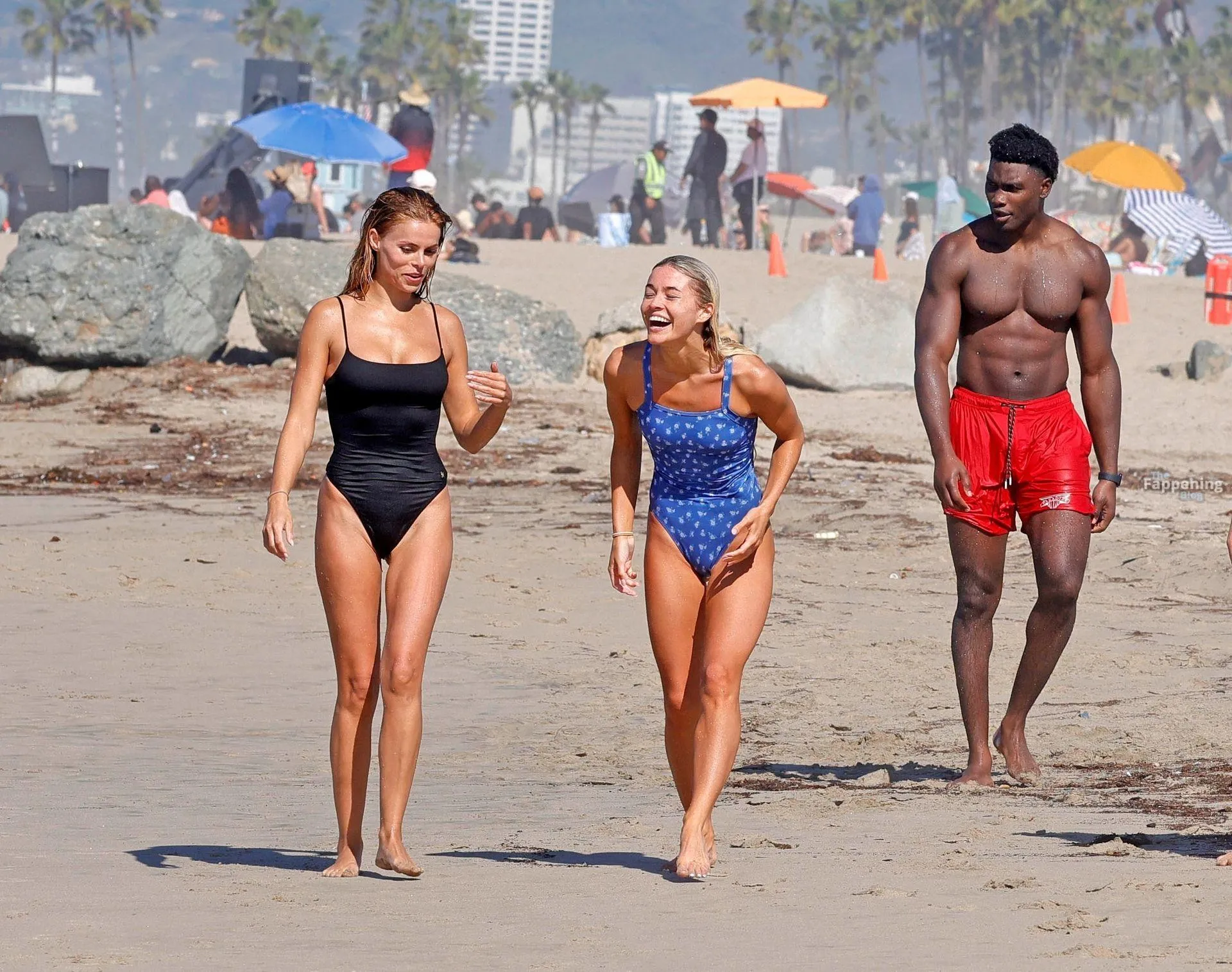 Livvy Dunne and Brooks Nader trained on the beach in Los Angeles for the “Baywatch” reboot during an intense workout. Livvy wore a blue polka-dot swimsuit, while Brooks wore a black catsuit.