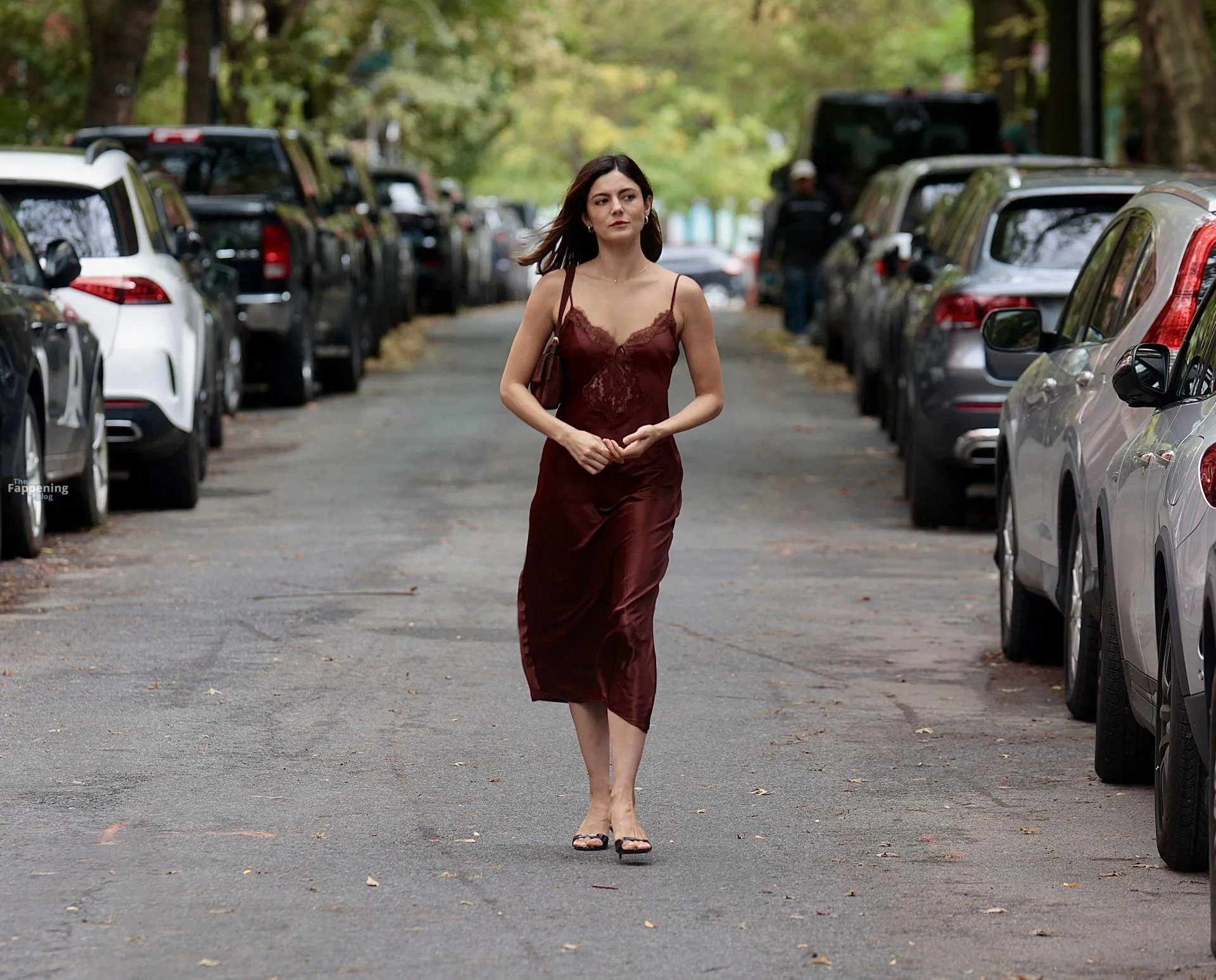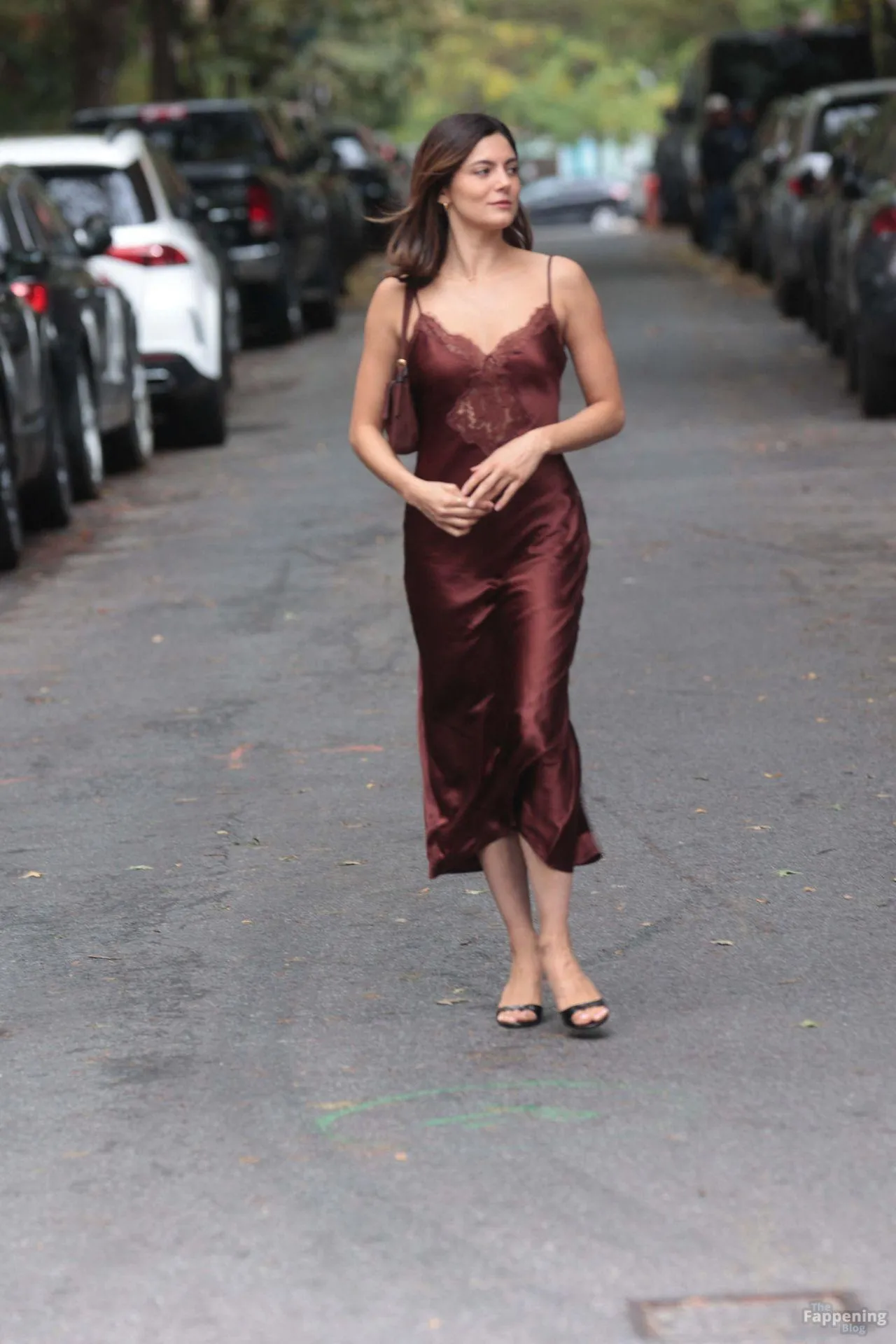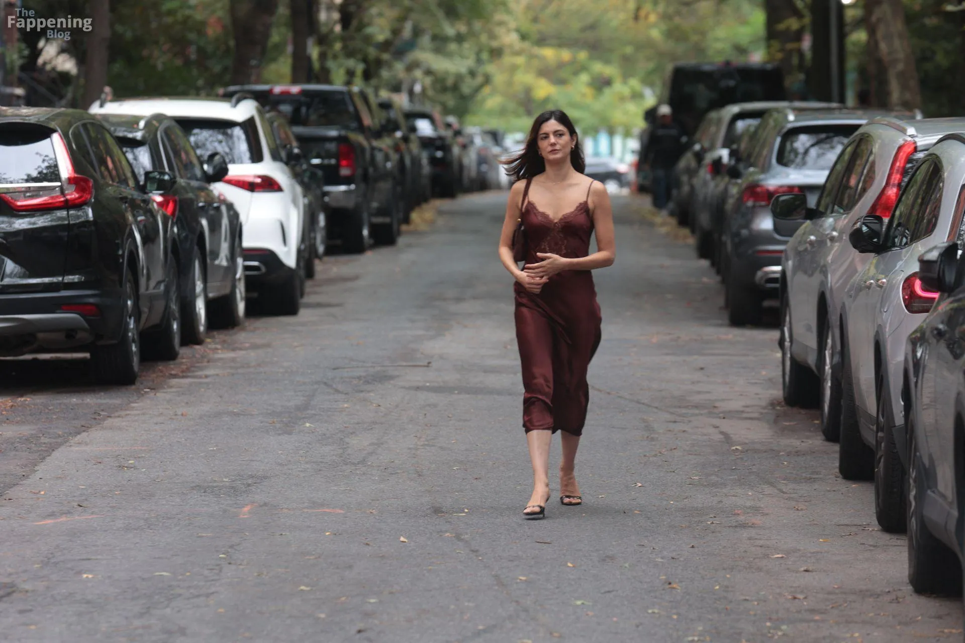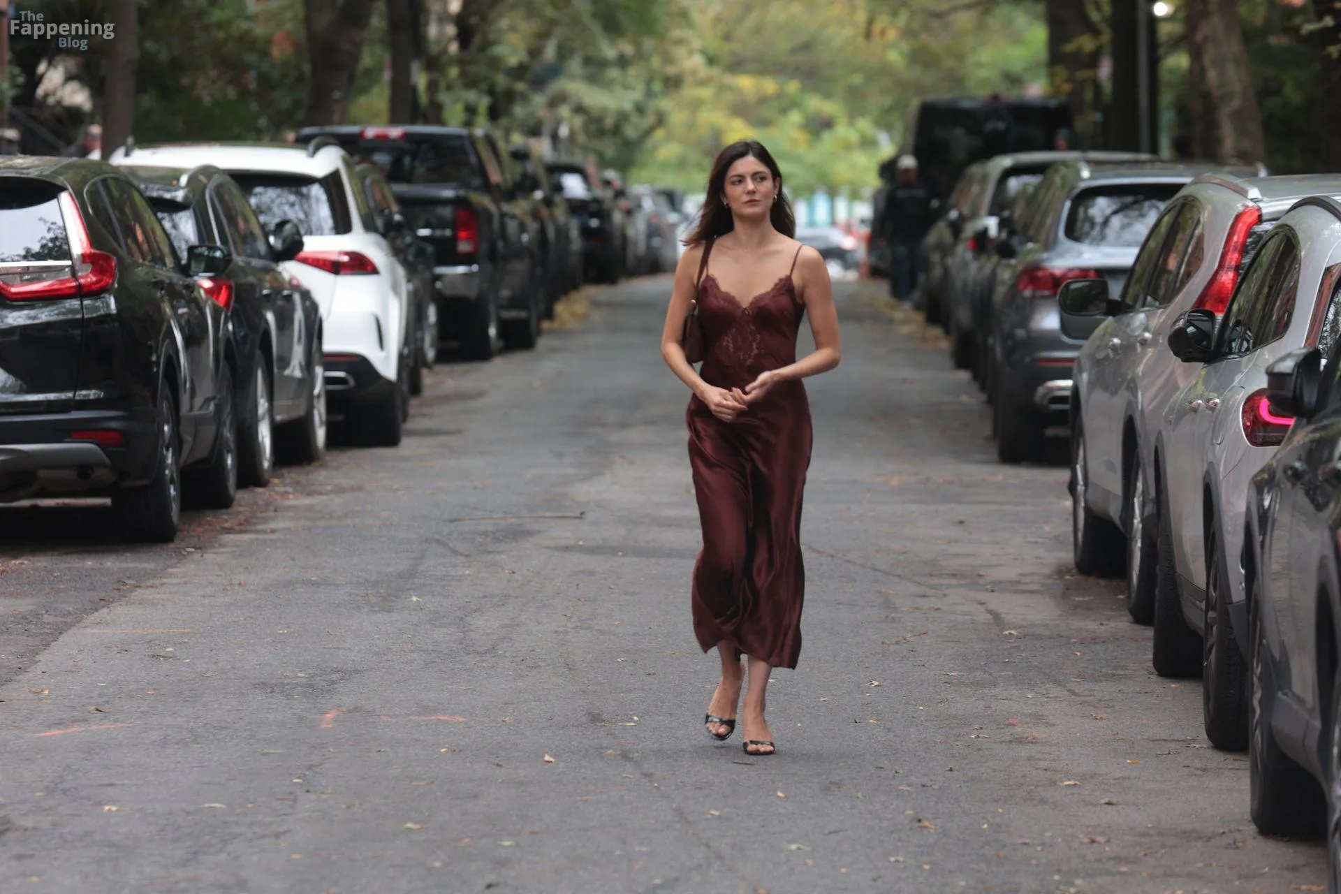 Monica Barbaro was on NYC streets, rockin’ a slinky red slip dress that hugged her fogire and showed off her cleavage for One Night Only.