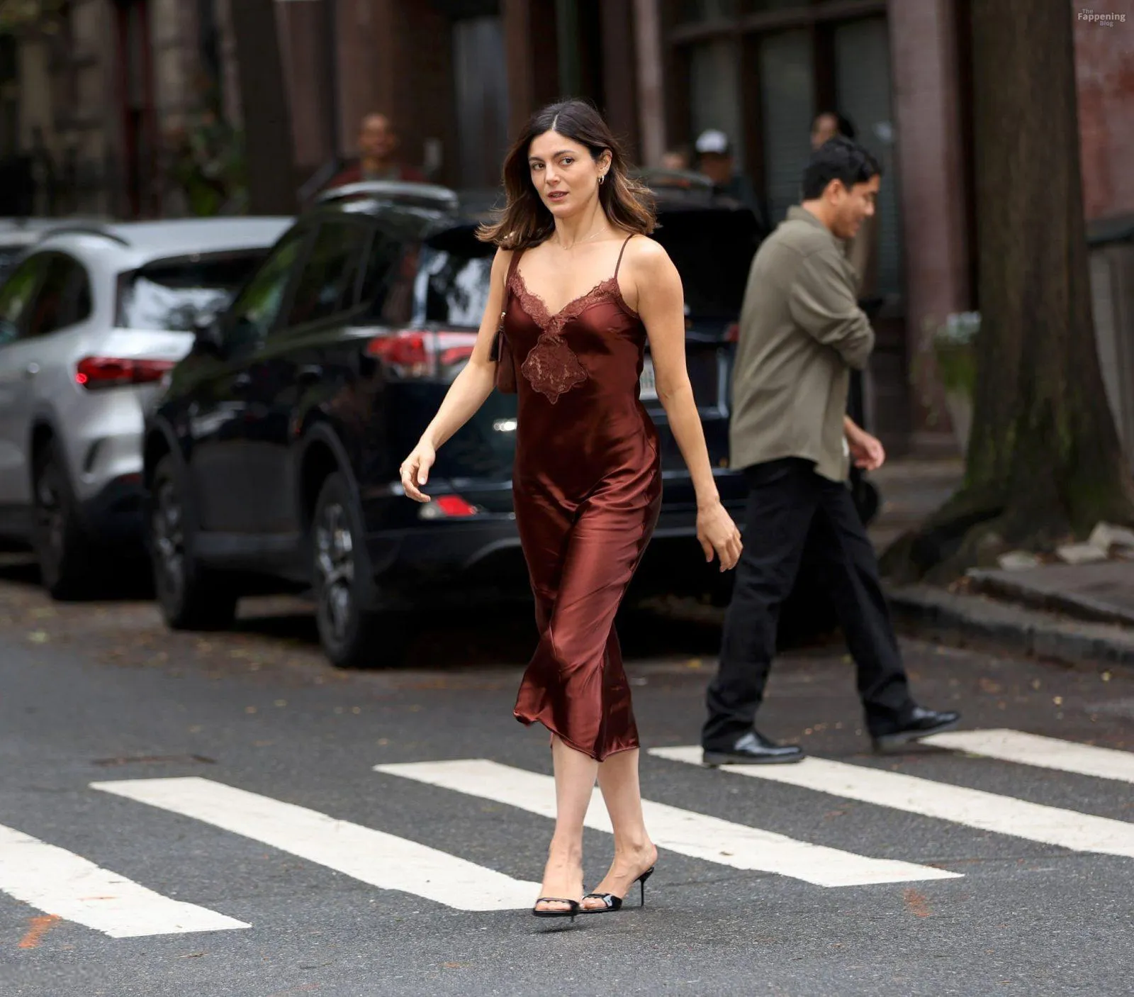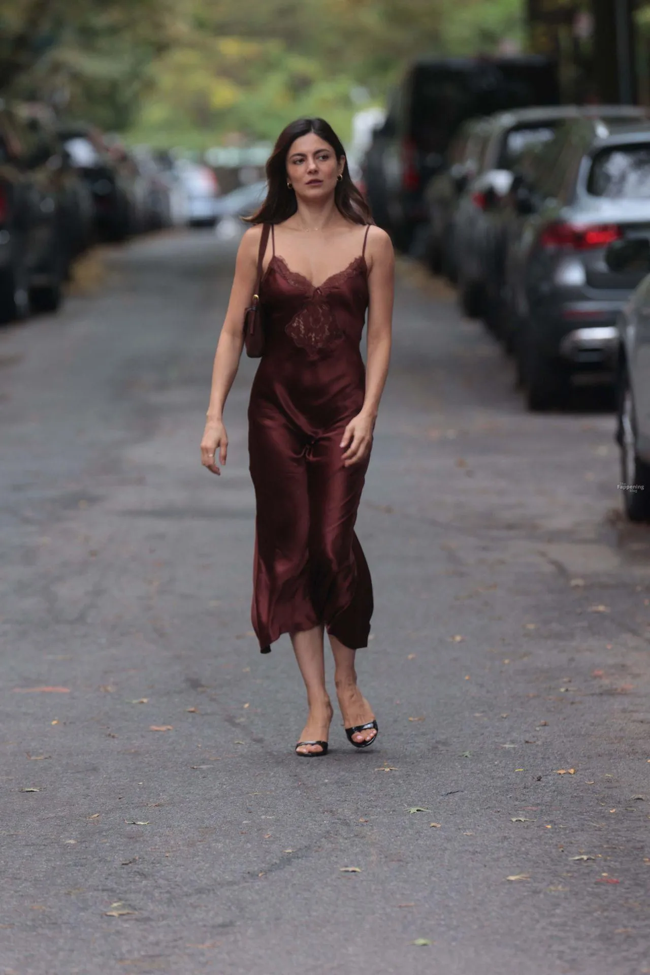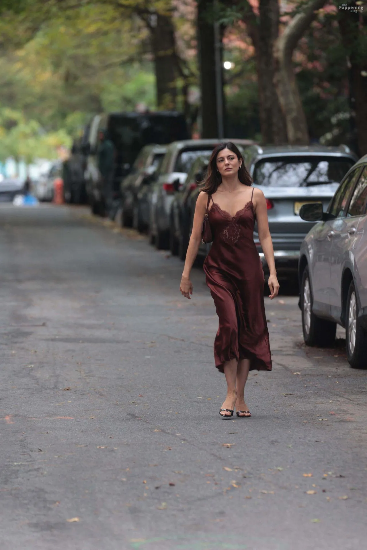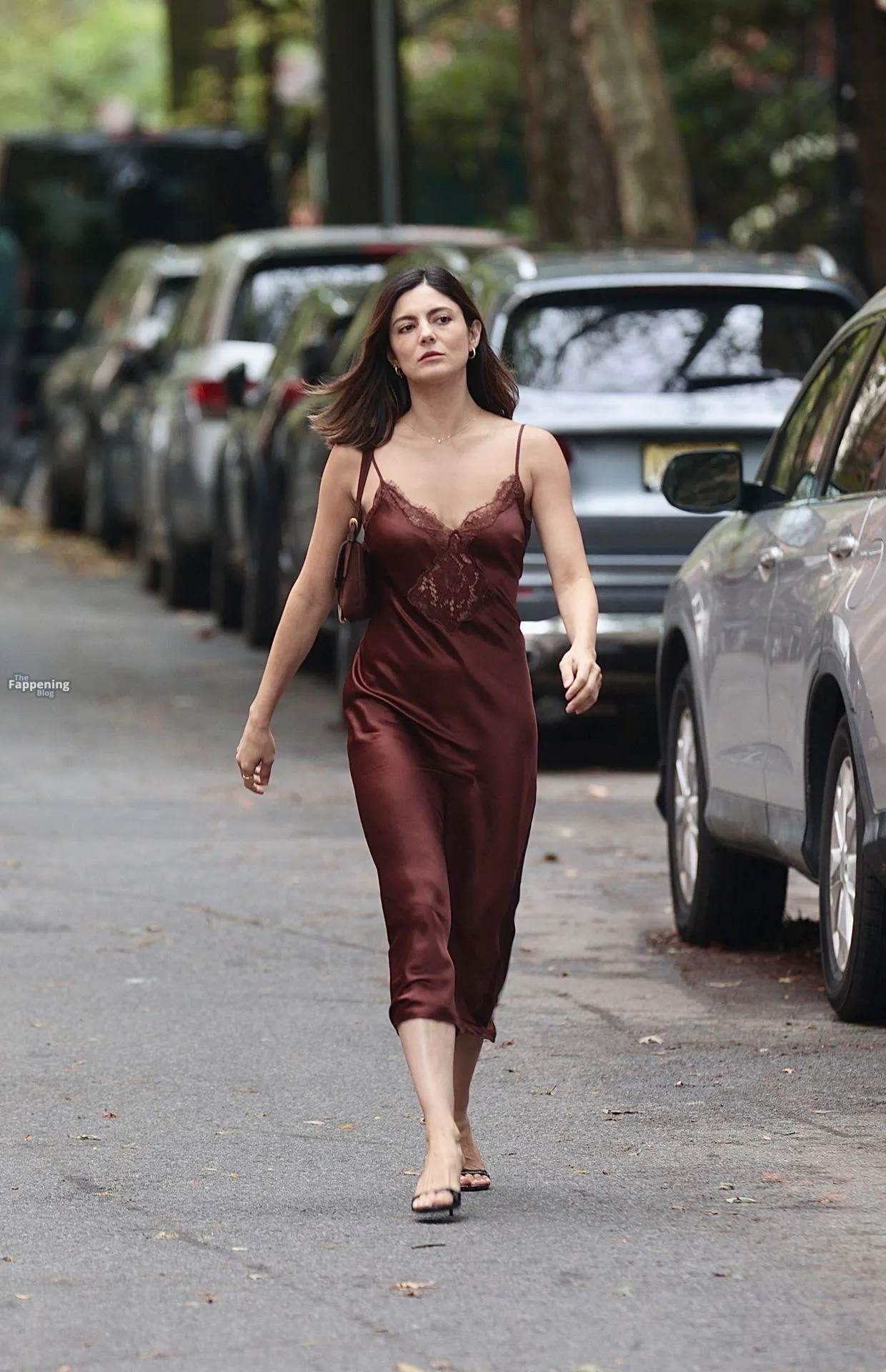 Monica Barbaro was on NYC streets, rockin’ a slinky red slip dress that hugged her fogire and showed off her cleavage for One Night Only.