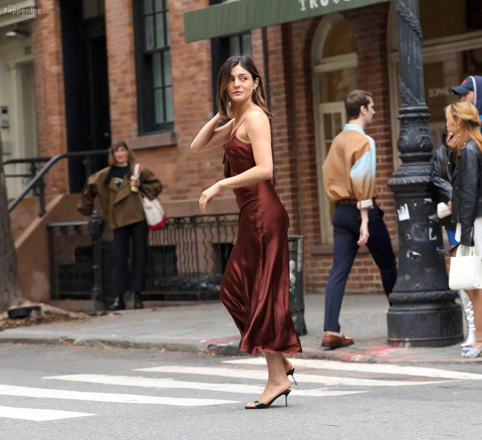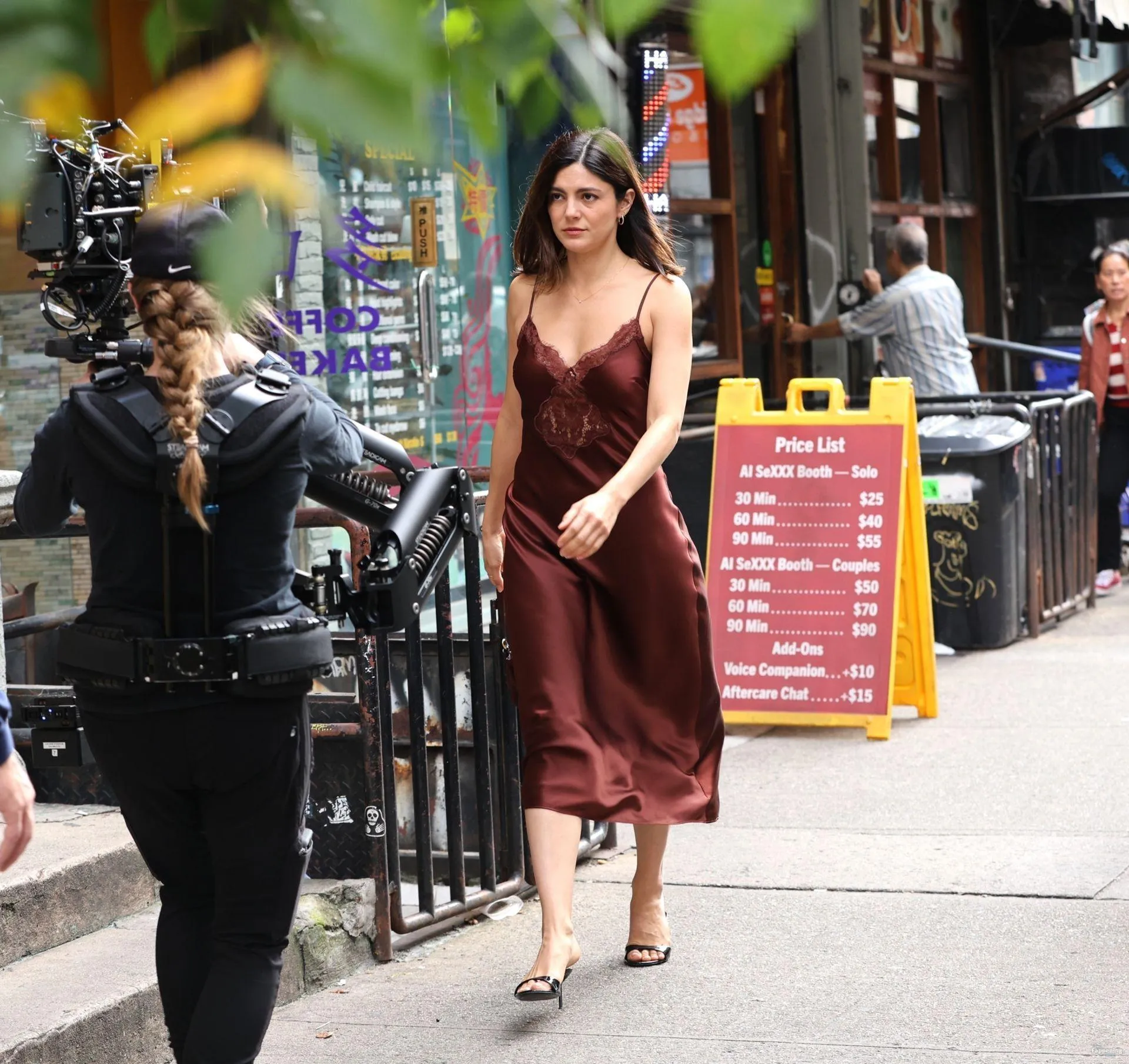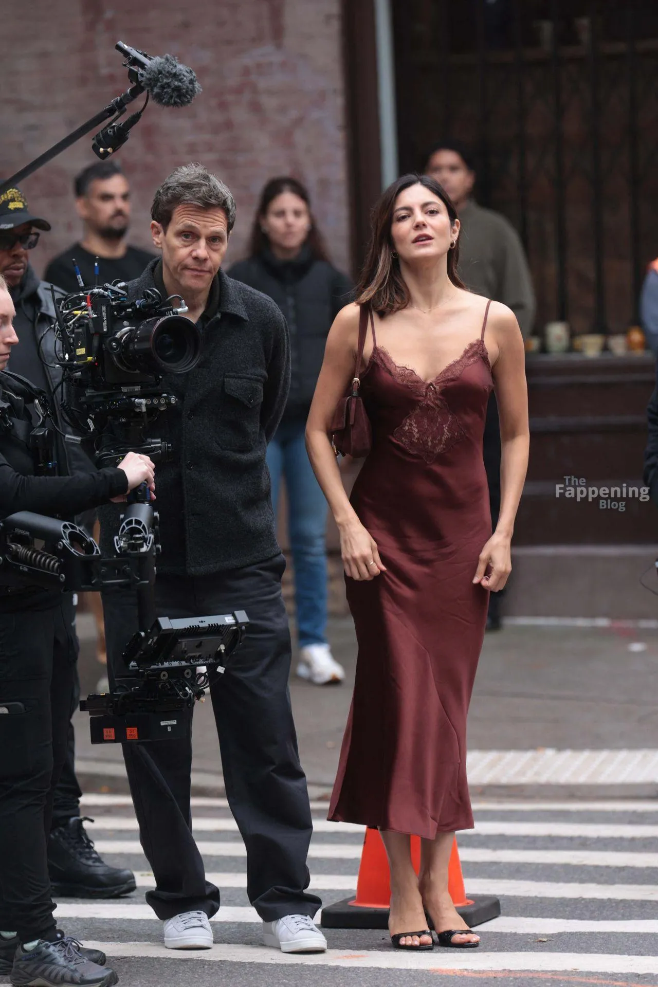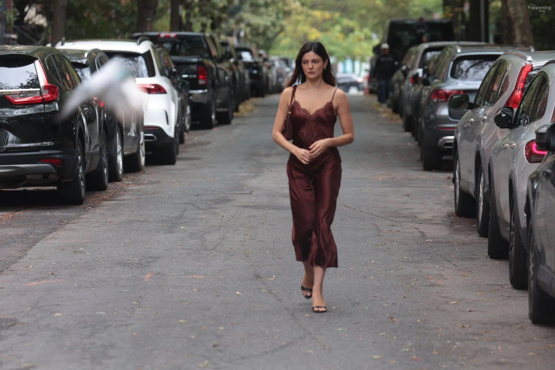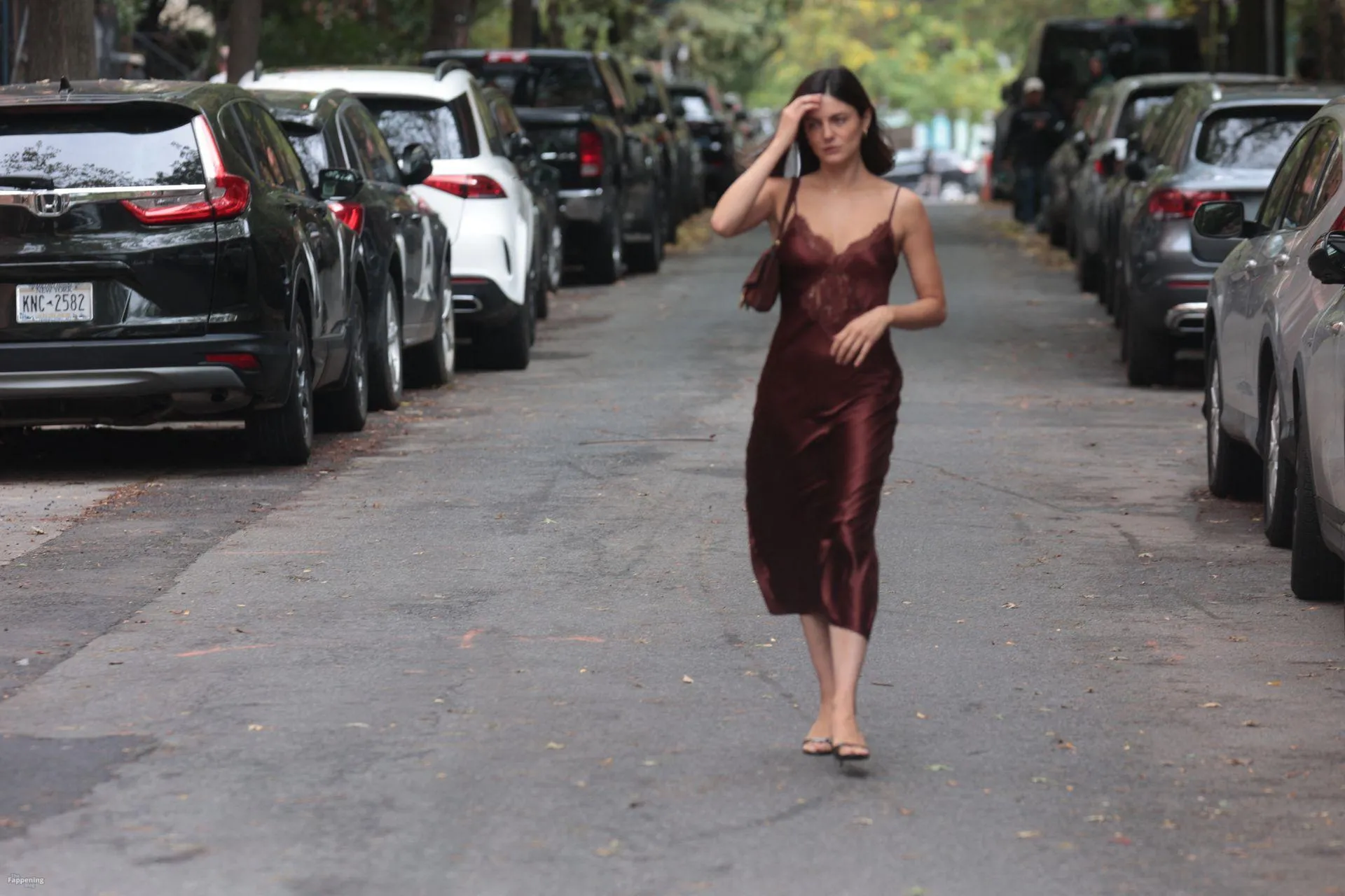 Monica Barbaro was on NYC streets, rockin’ a slinky red slip dress that hugged her fogire and showed off her cleavage for One Night Only.