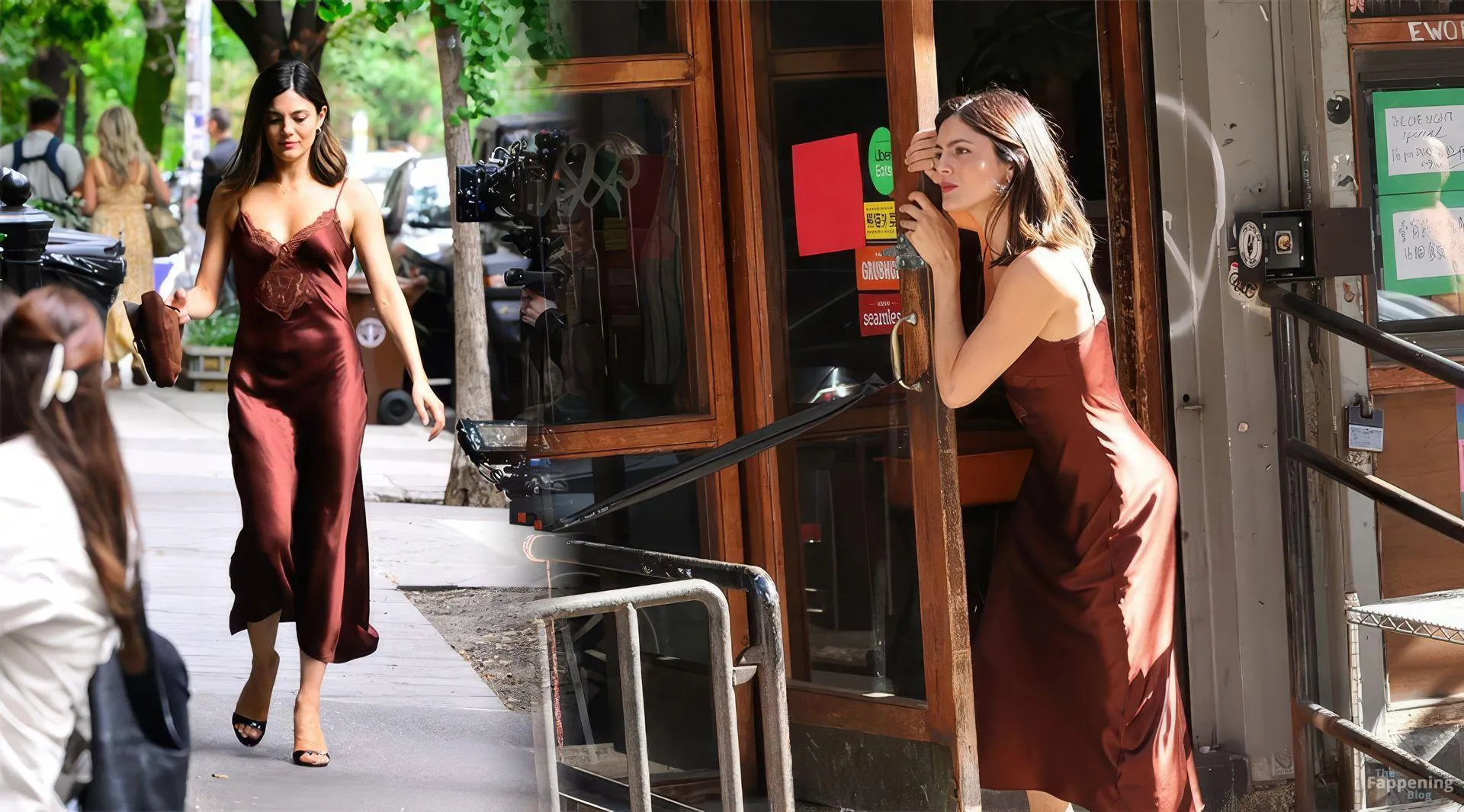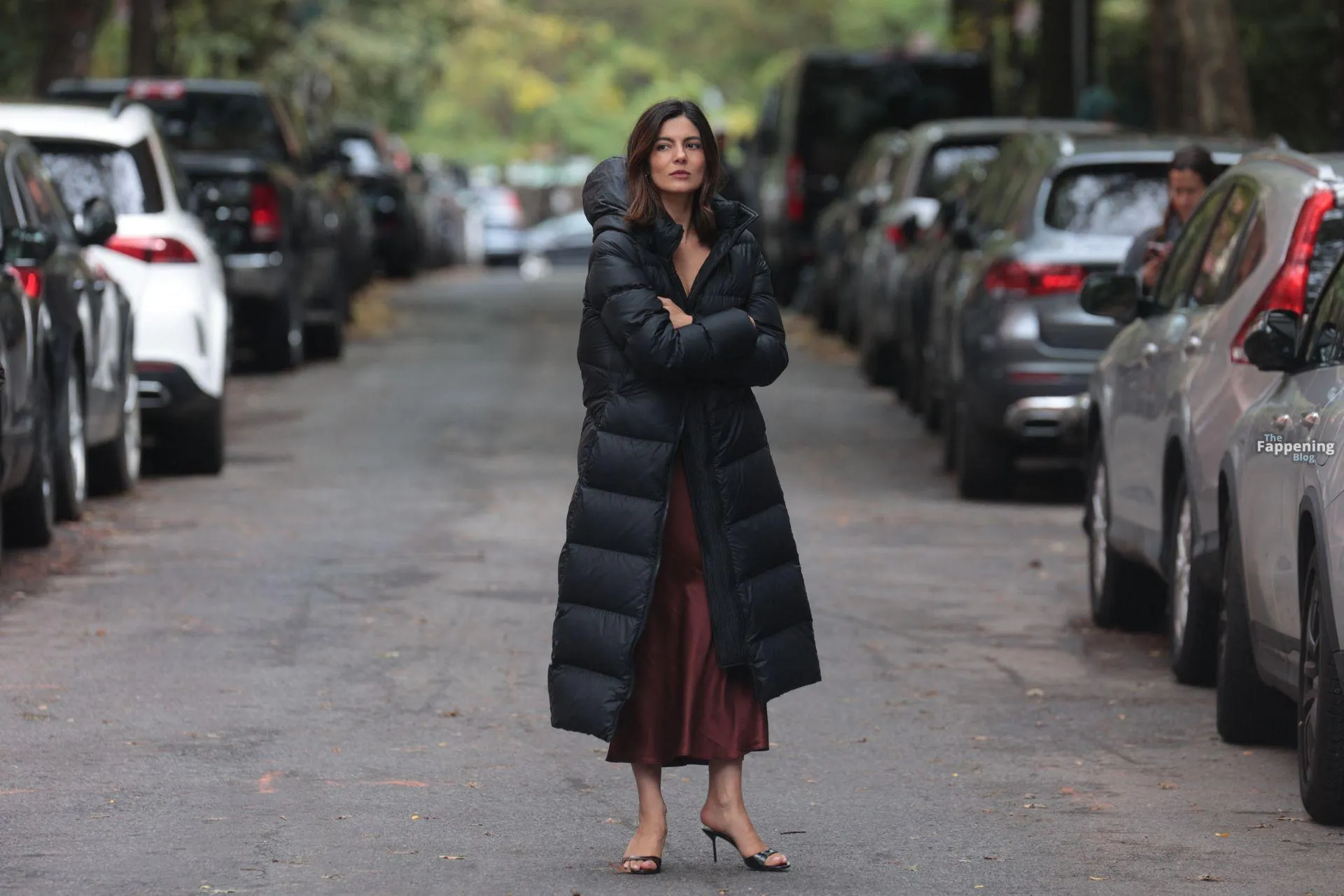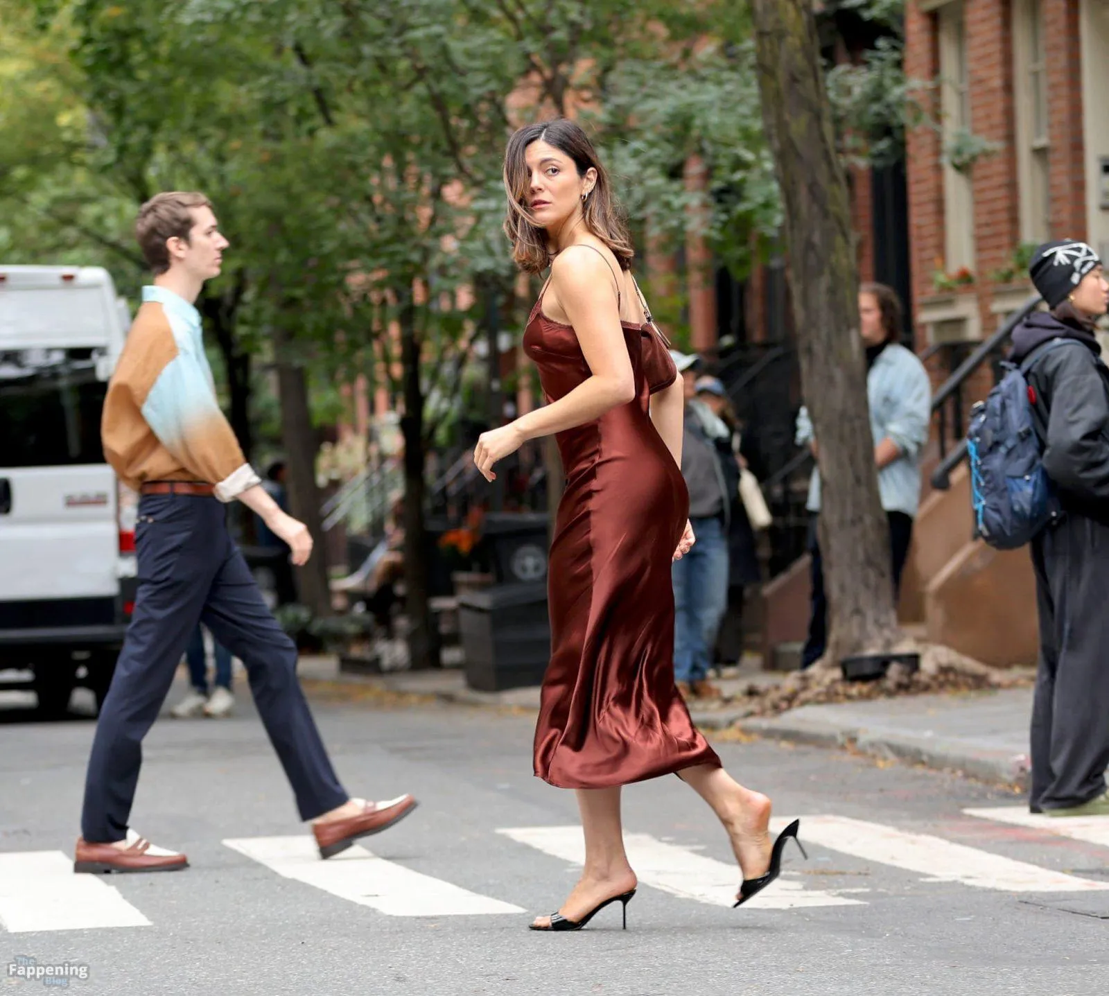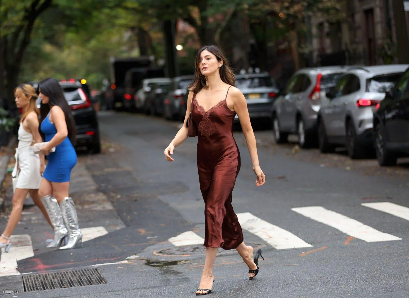 Monica Barbaro was on NYC streets, rockin’ a slinky red slip dress that hugged her fogire and showed off her cleavage for One Night Only.