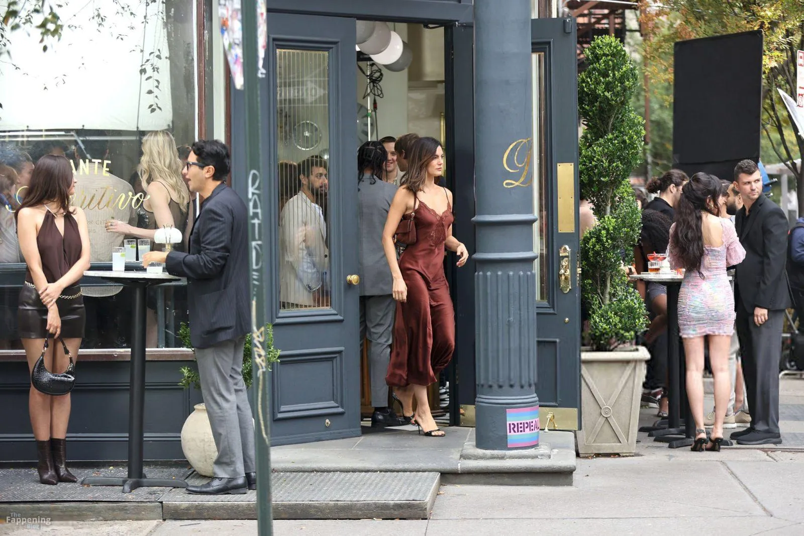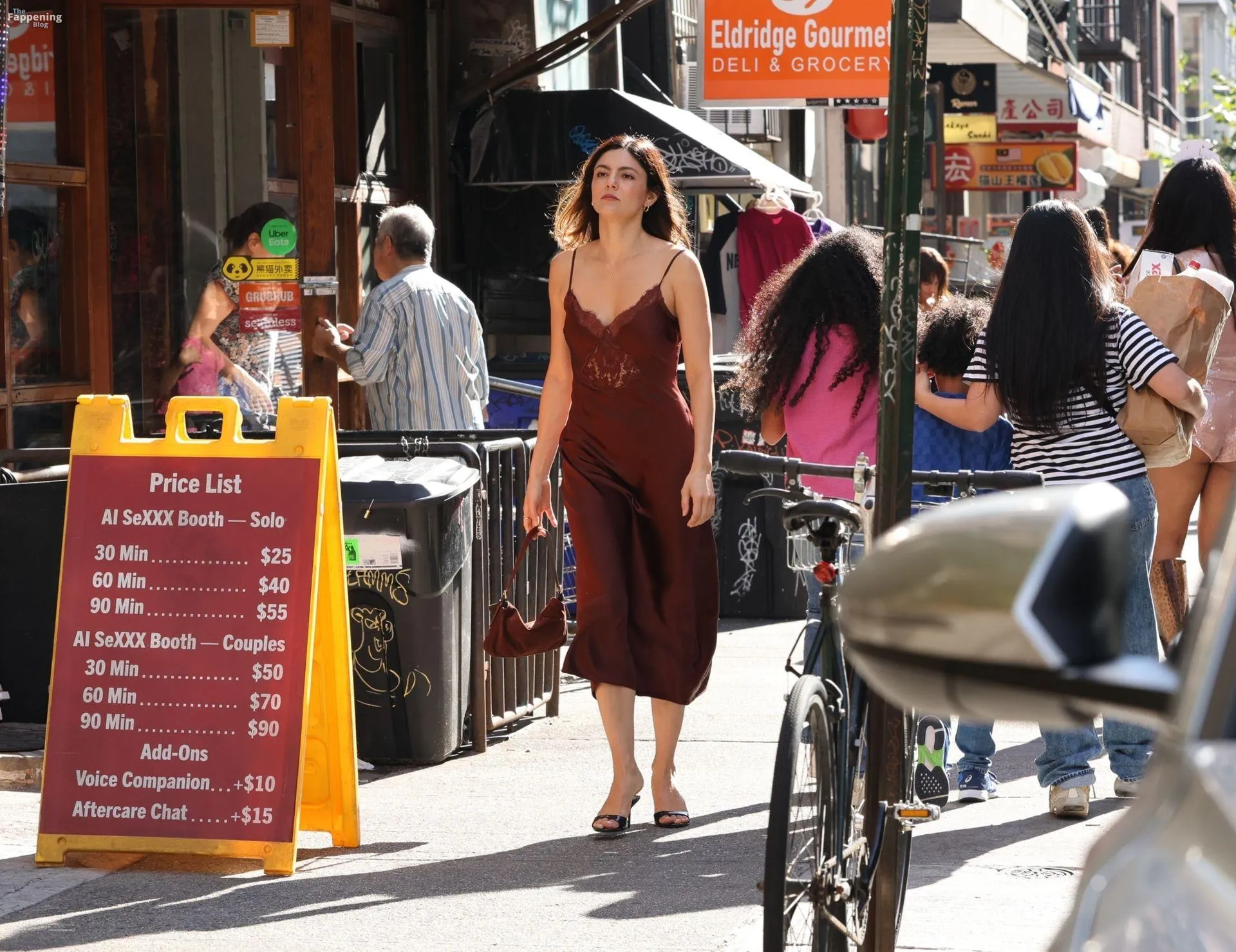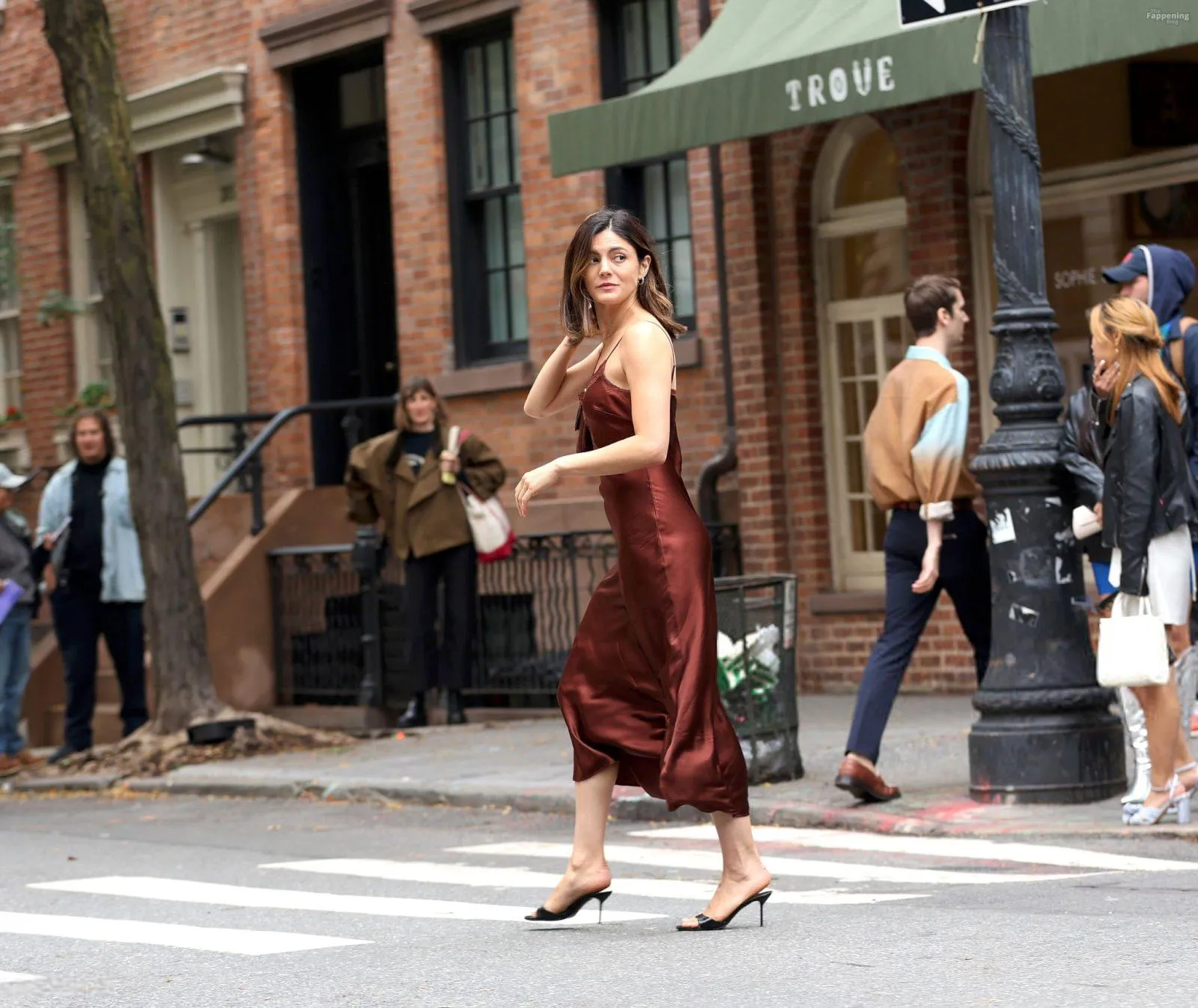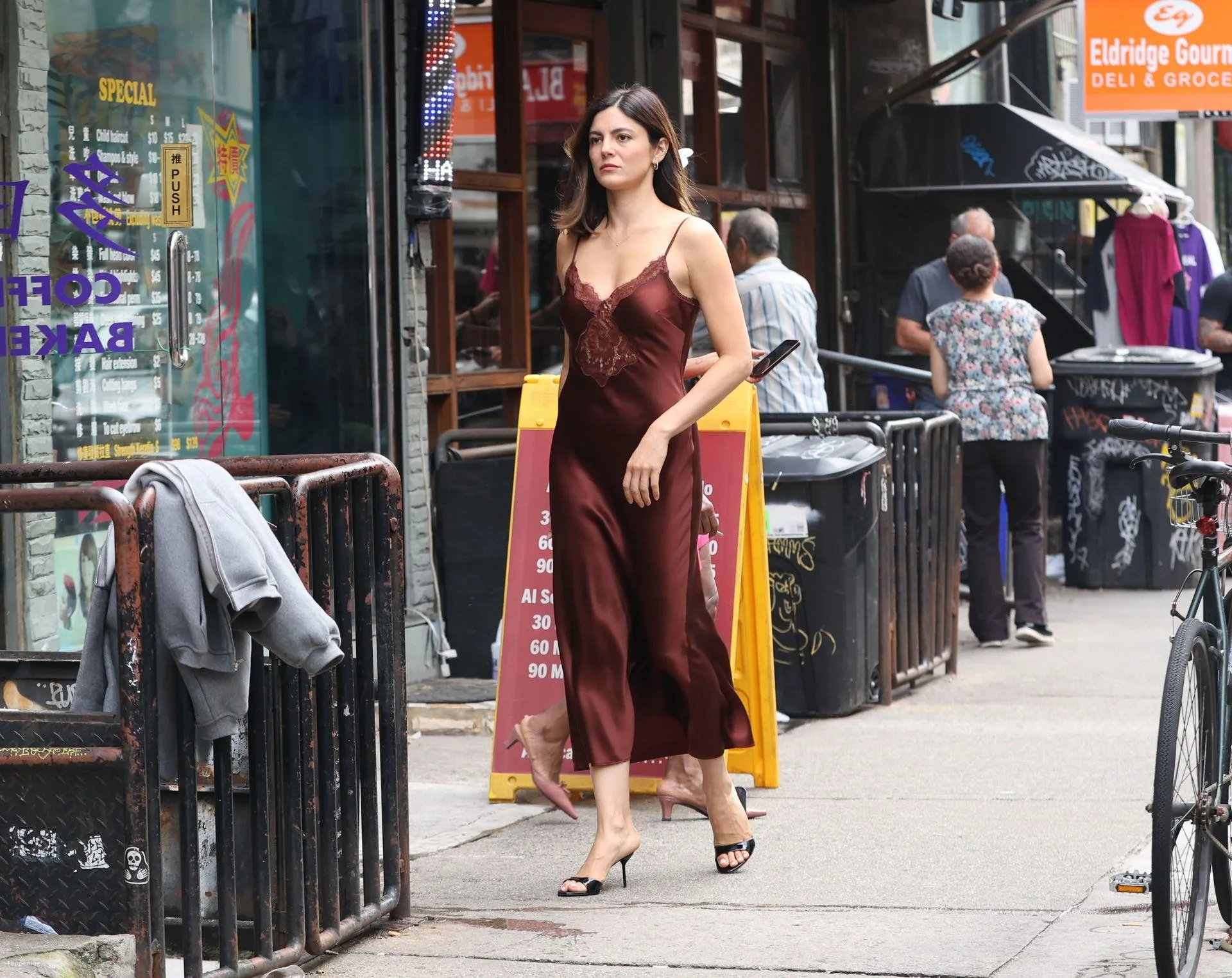 Monica Barbaro was on NYC streets, rockin’ a slinky red slip dress that hugged her fogire and showed off her cleavage for One Night Only.