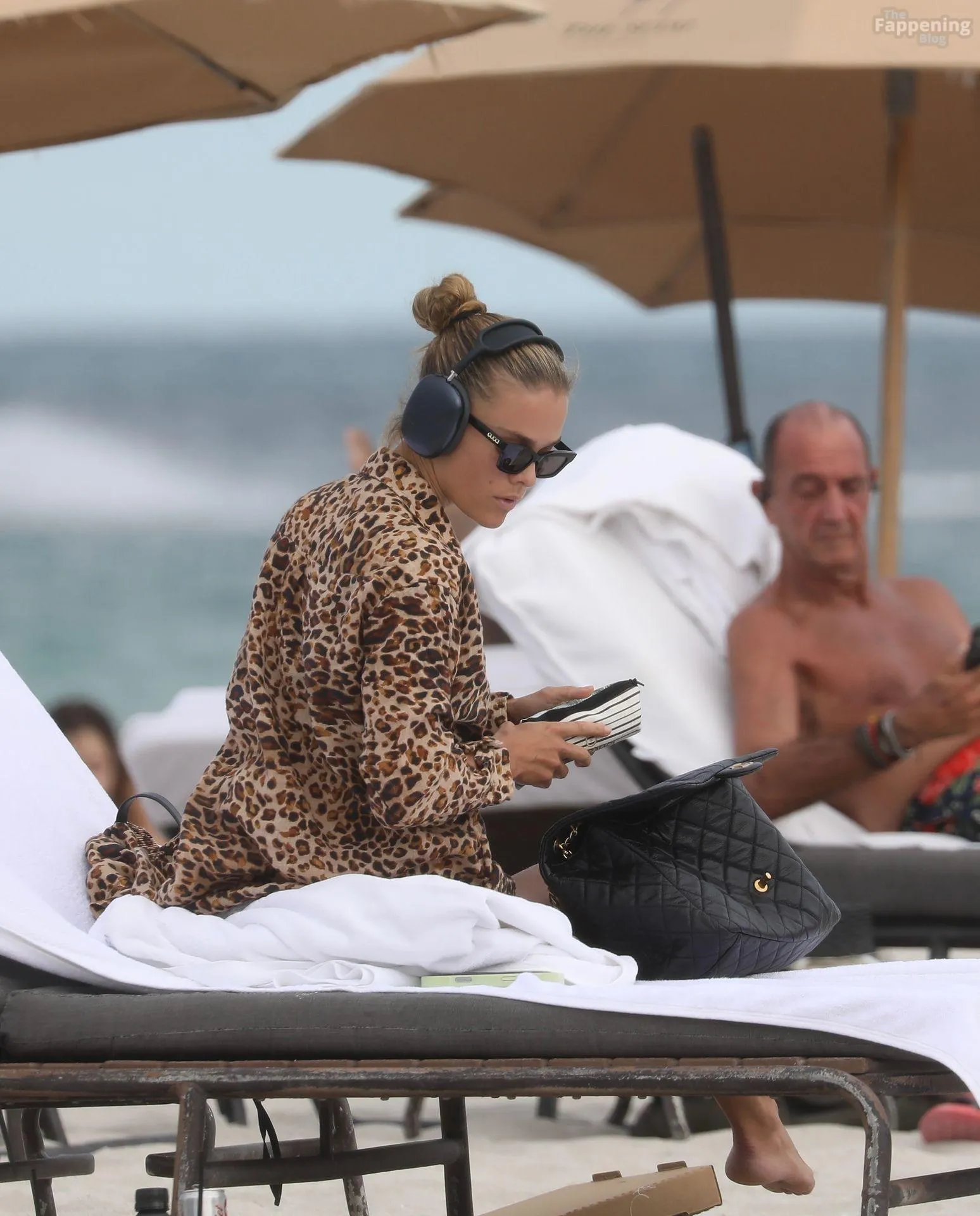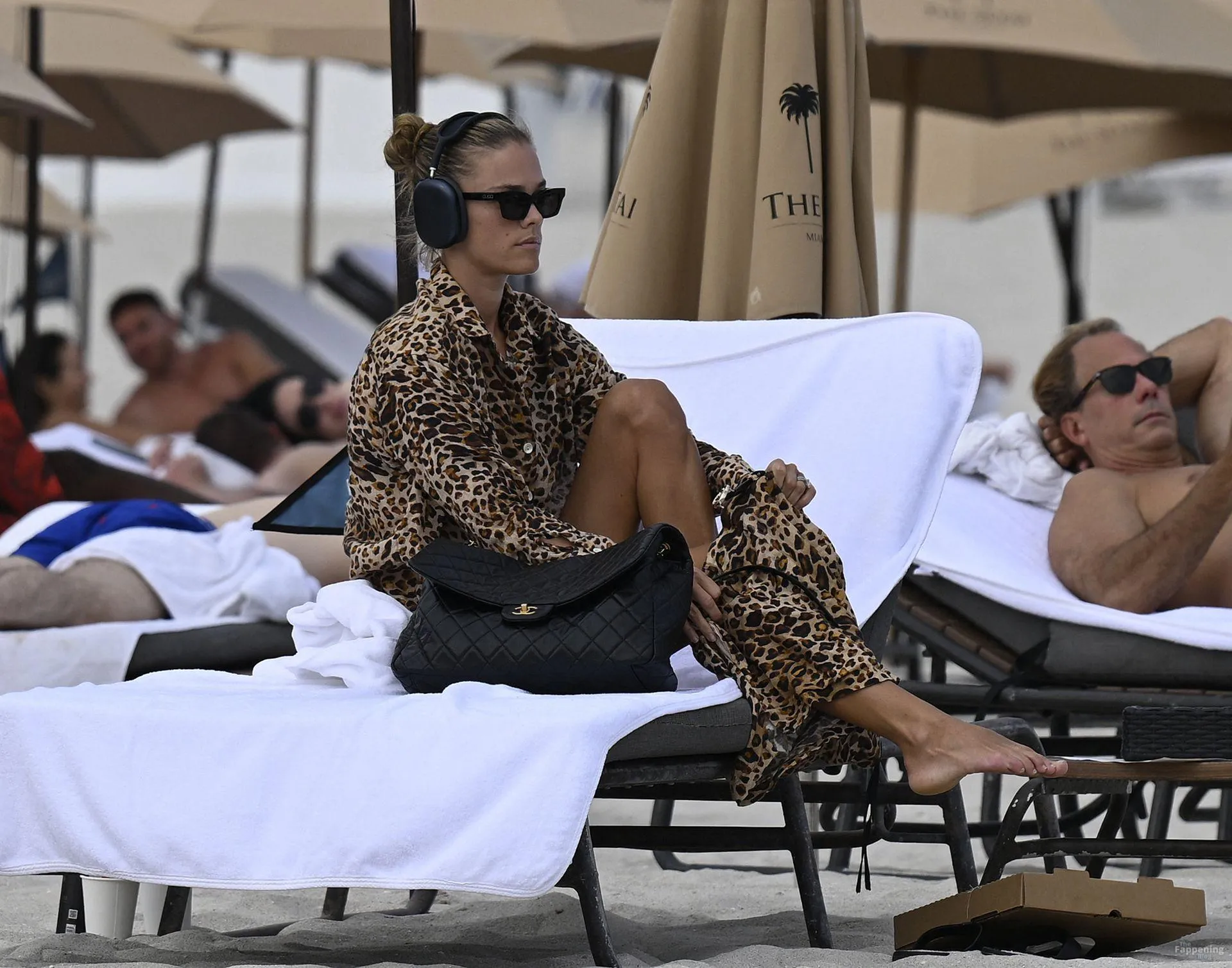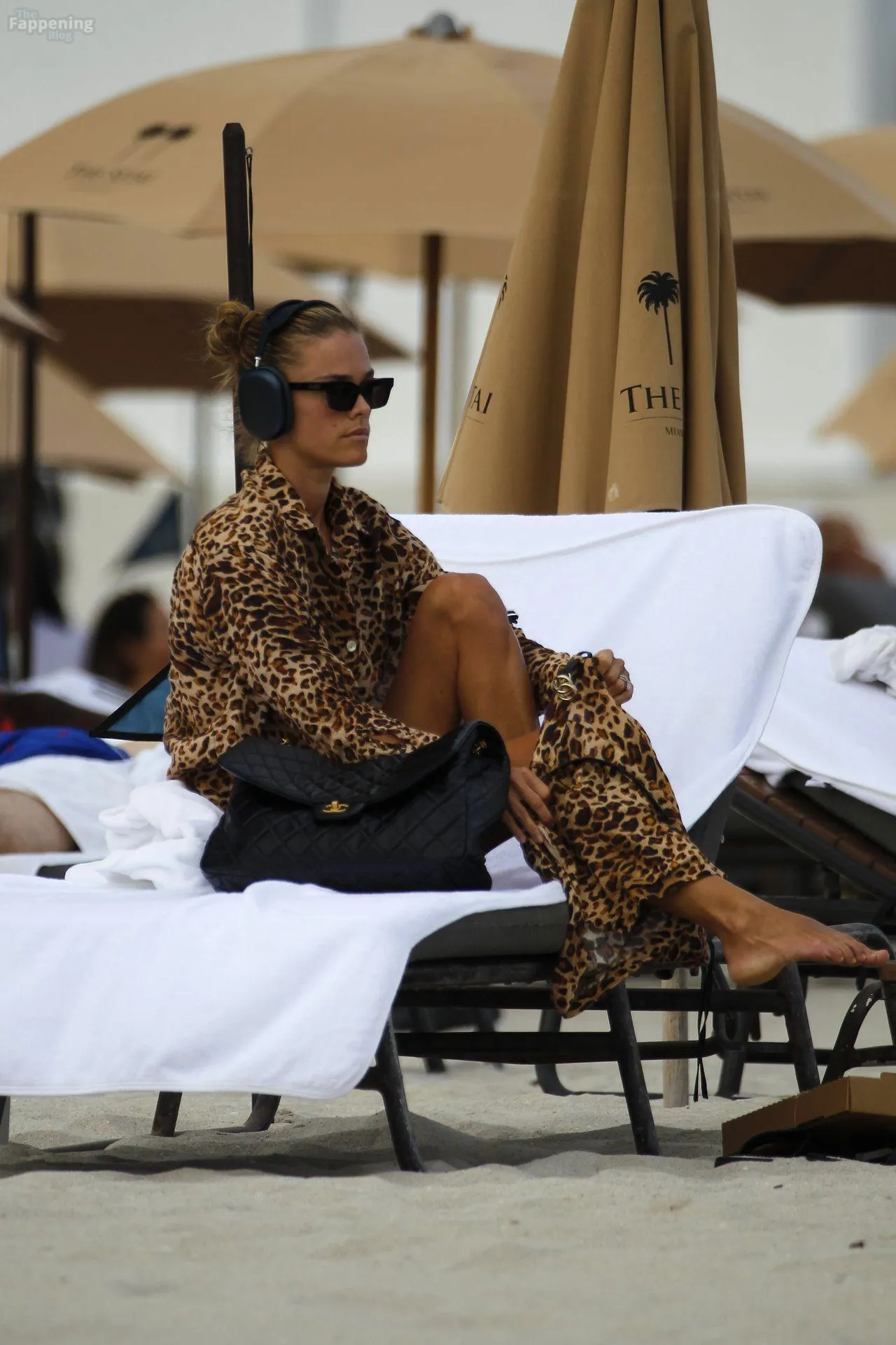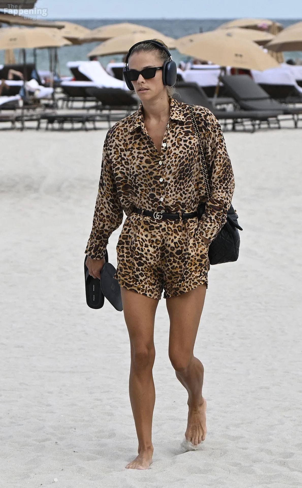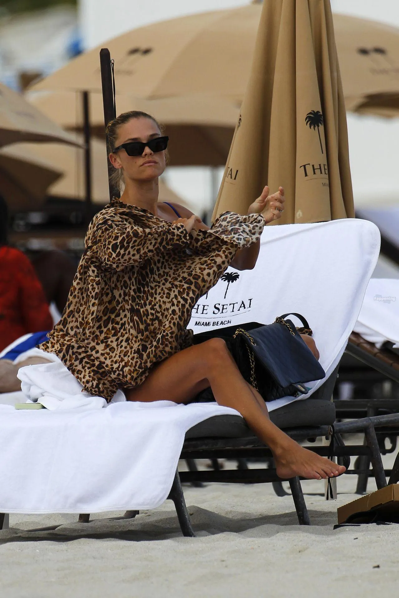 Danish model Nina Agdal was spotted soakin’ up the sun on Miami Beach, rockin’ a blue bikini before changing into a chic leopard print outfit.