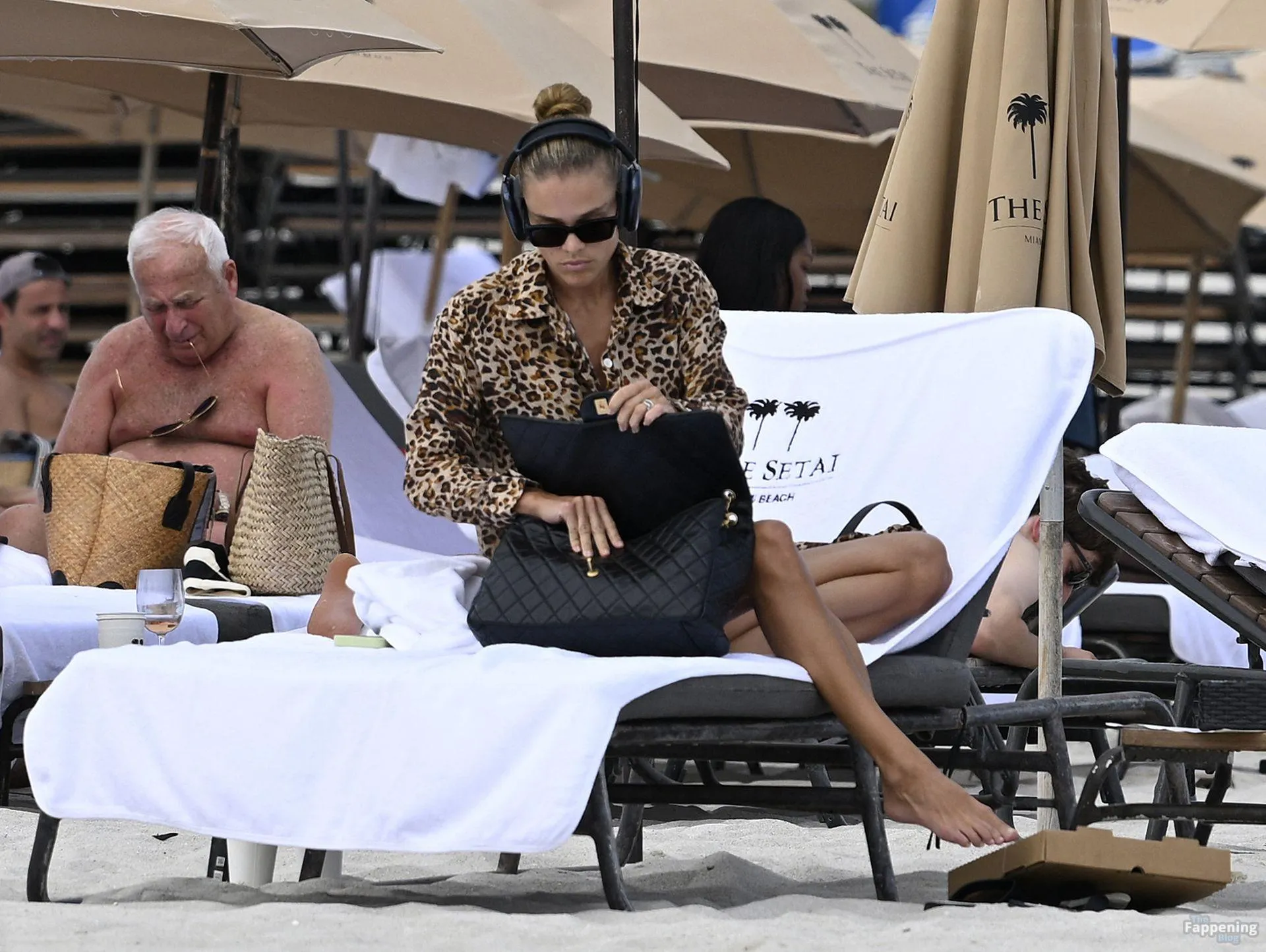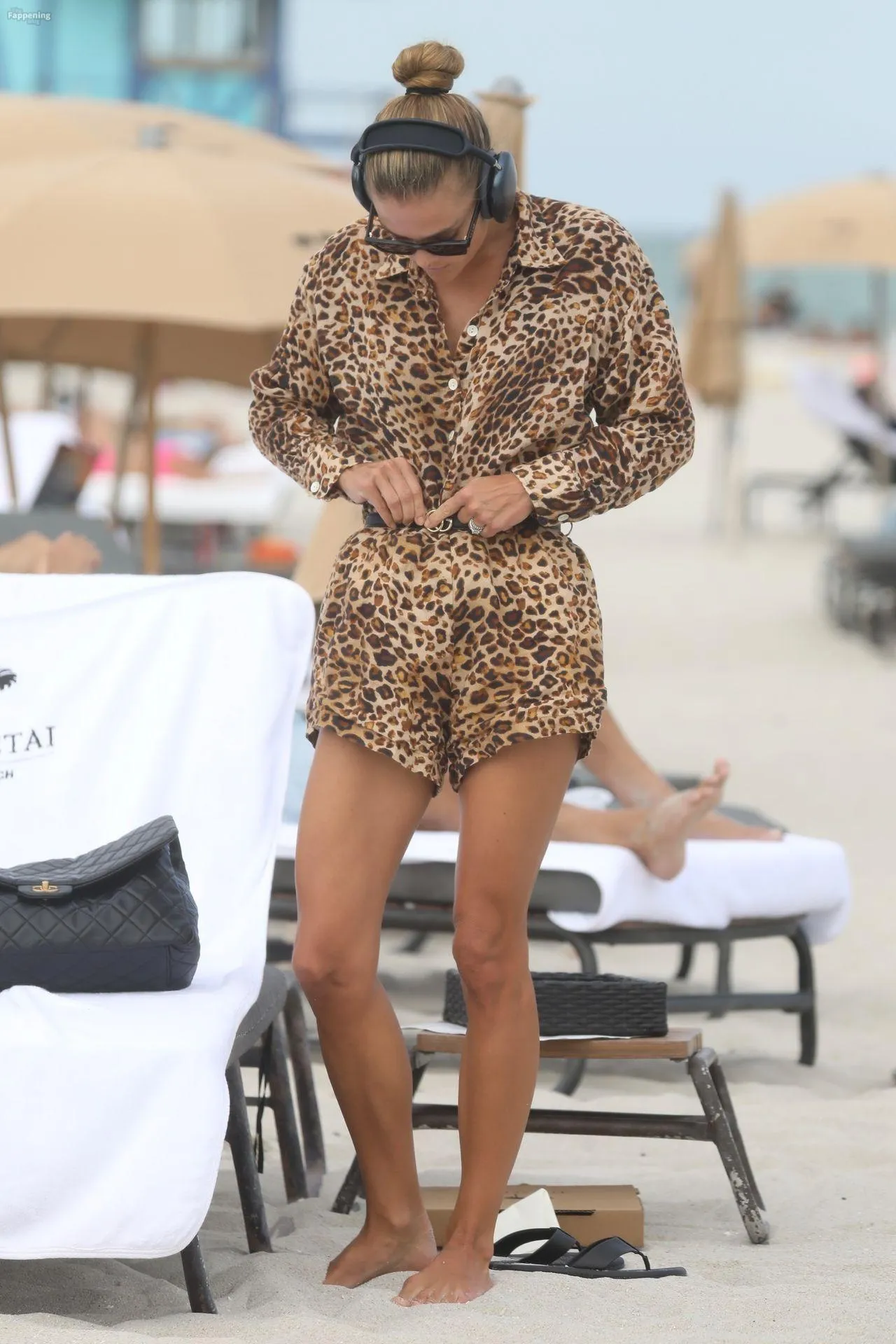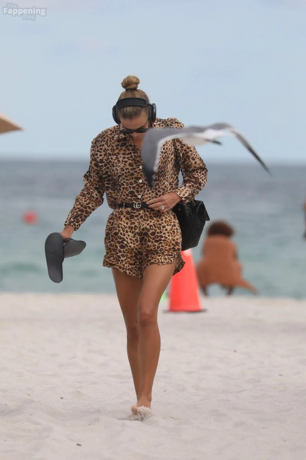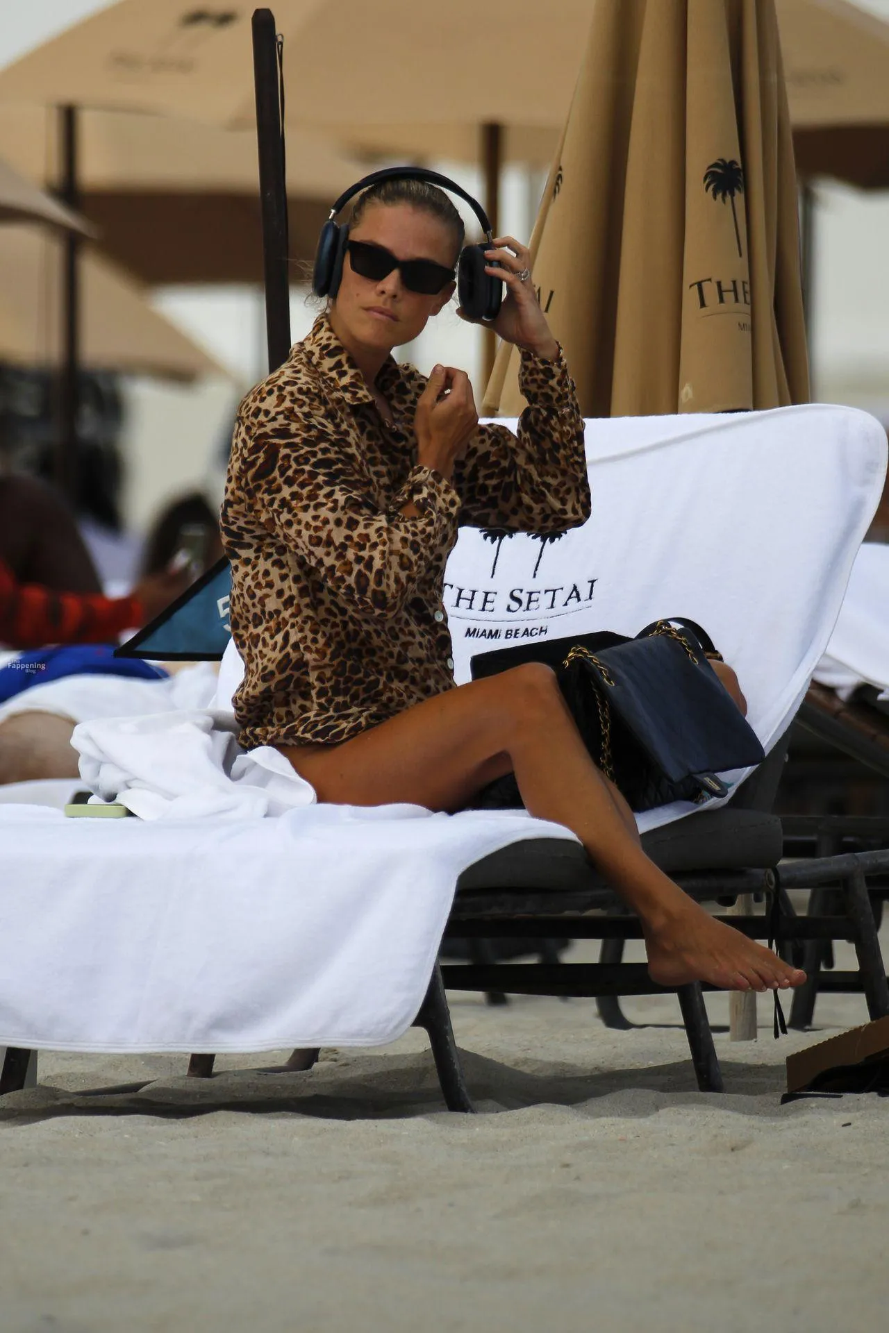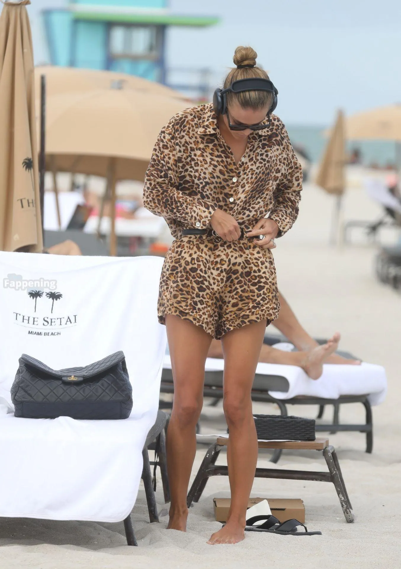 Danish model Nina Agdal was spotted soakin’ up the sun on Miami Beach, rockin’ a blue bikini before changing into a chic leopard print outfit.