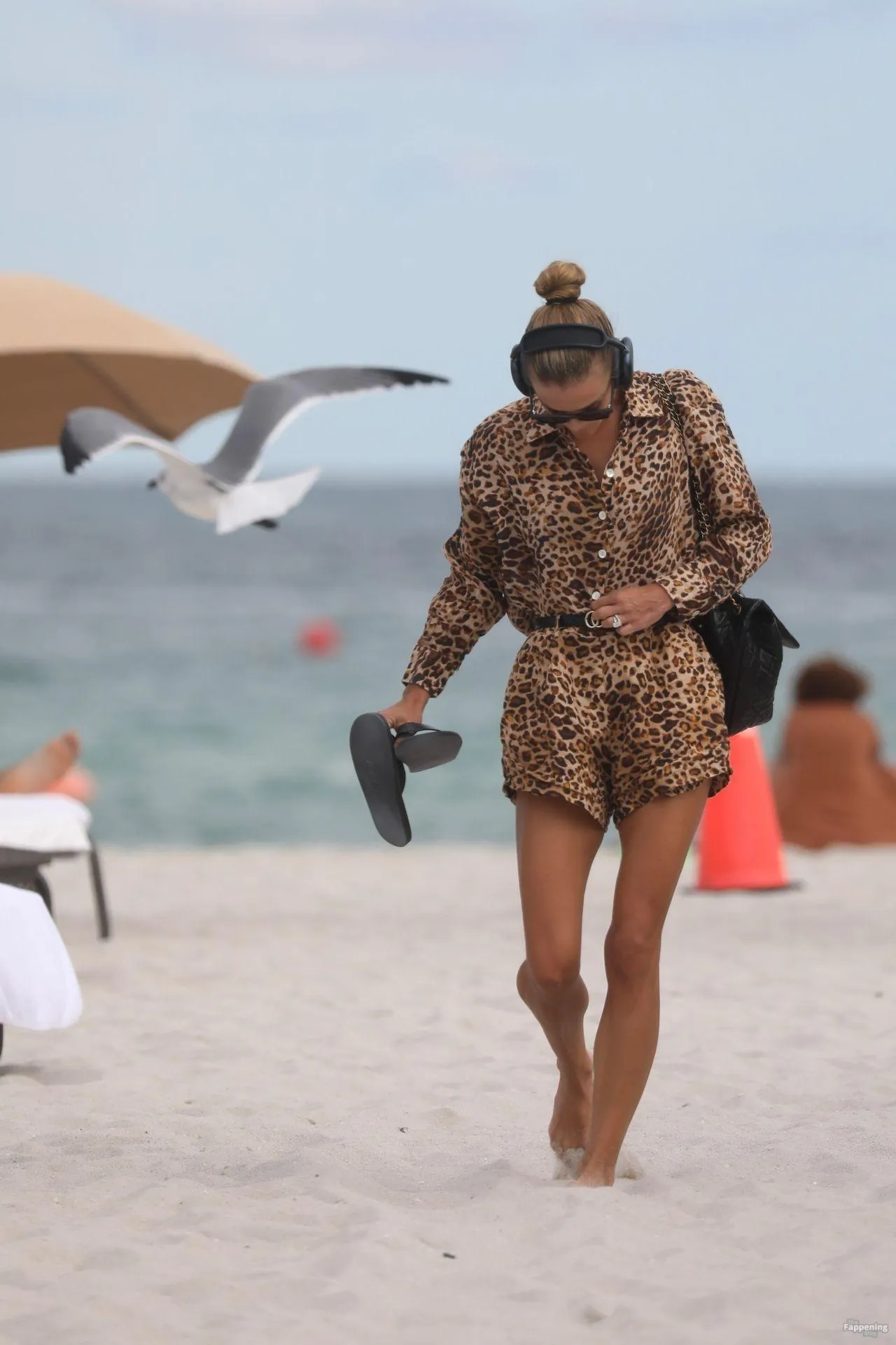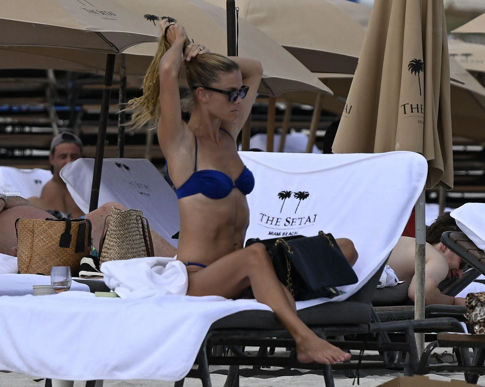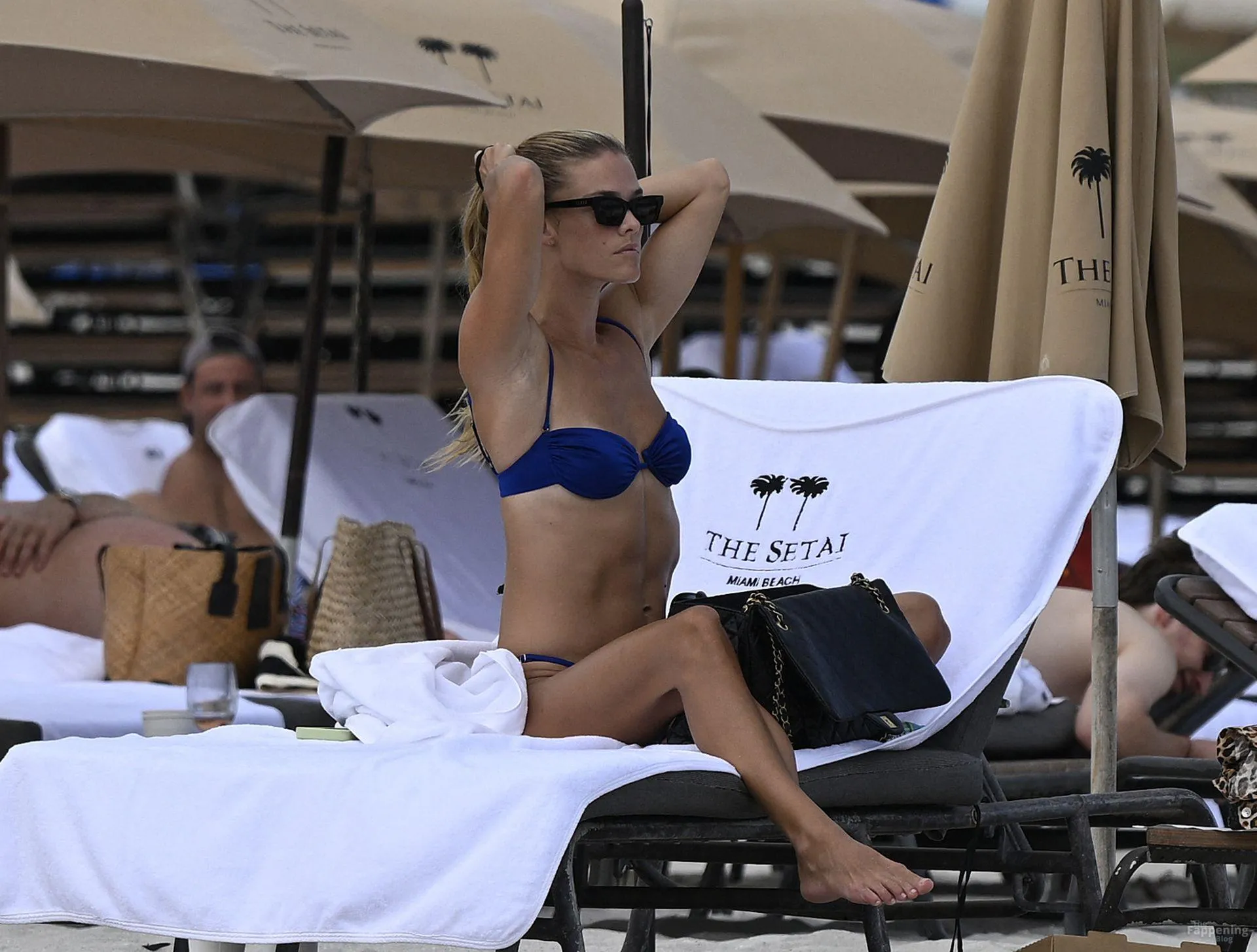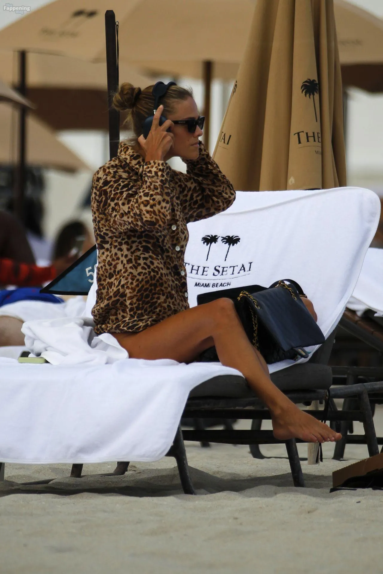 Danish model Nina Agdal was spotted soakin’ up the sun on Miami Beach, rockin’ a blue bikini before changing into a chic leopard print outfit.