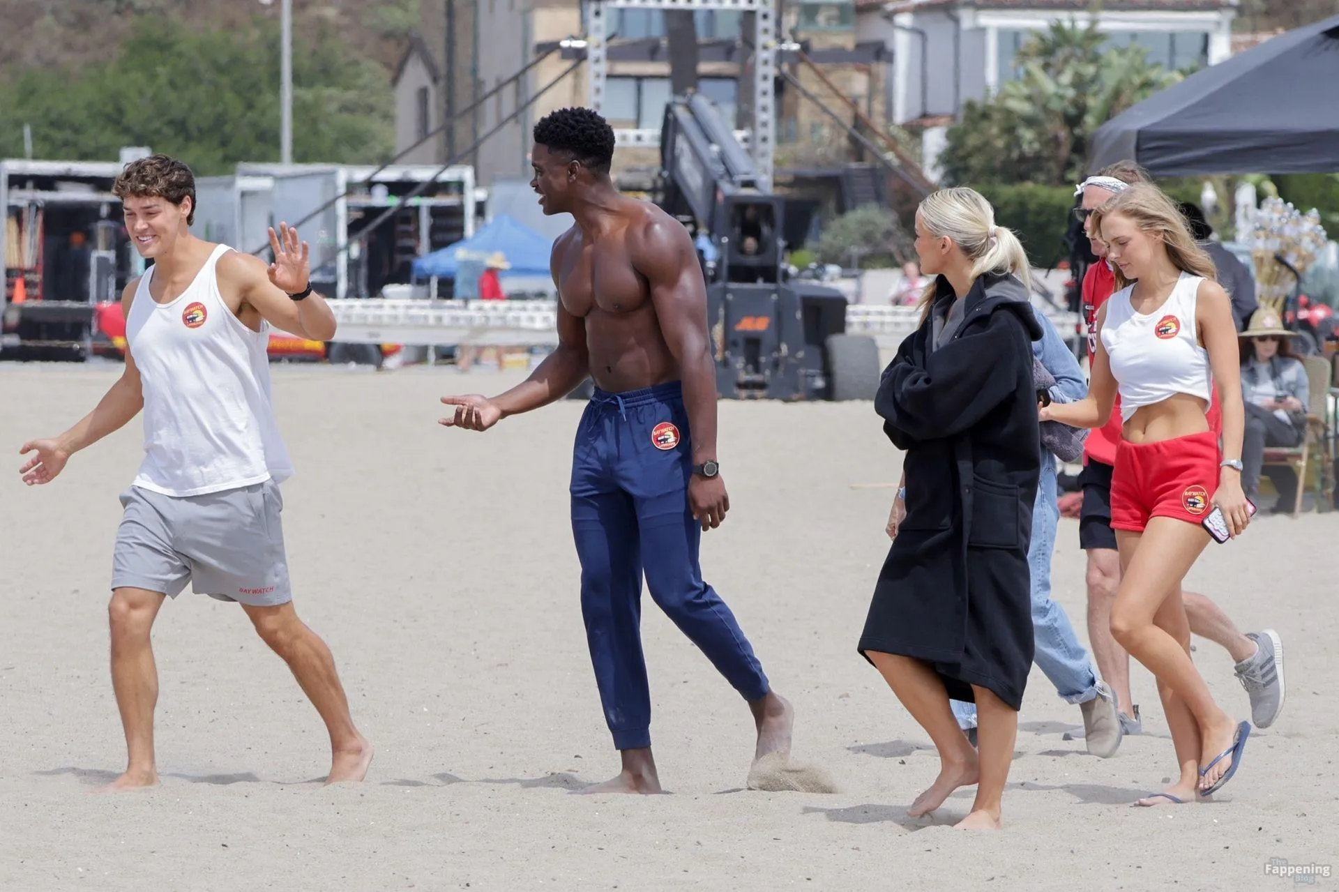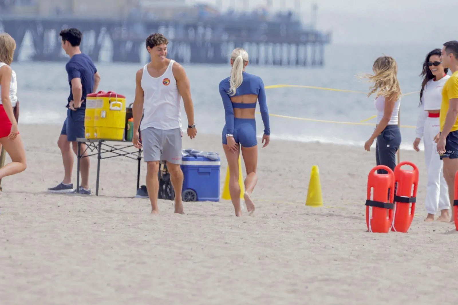 The cast of the “Baywatch” reboot, Olivia Dunne, Noah Beck, Jessica Belkin, Thaddeus LaGrone, and Shay Mitchell kept the energy high between filming scenes in Santa Monica, showing off playful and gymnastic moves on the sand. Dressed in their signature lifeguard looks, the group laughed and stretched between takes, bringing a fun, carefree vibe to the set.