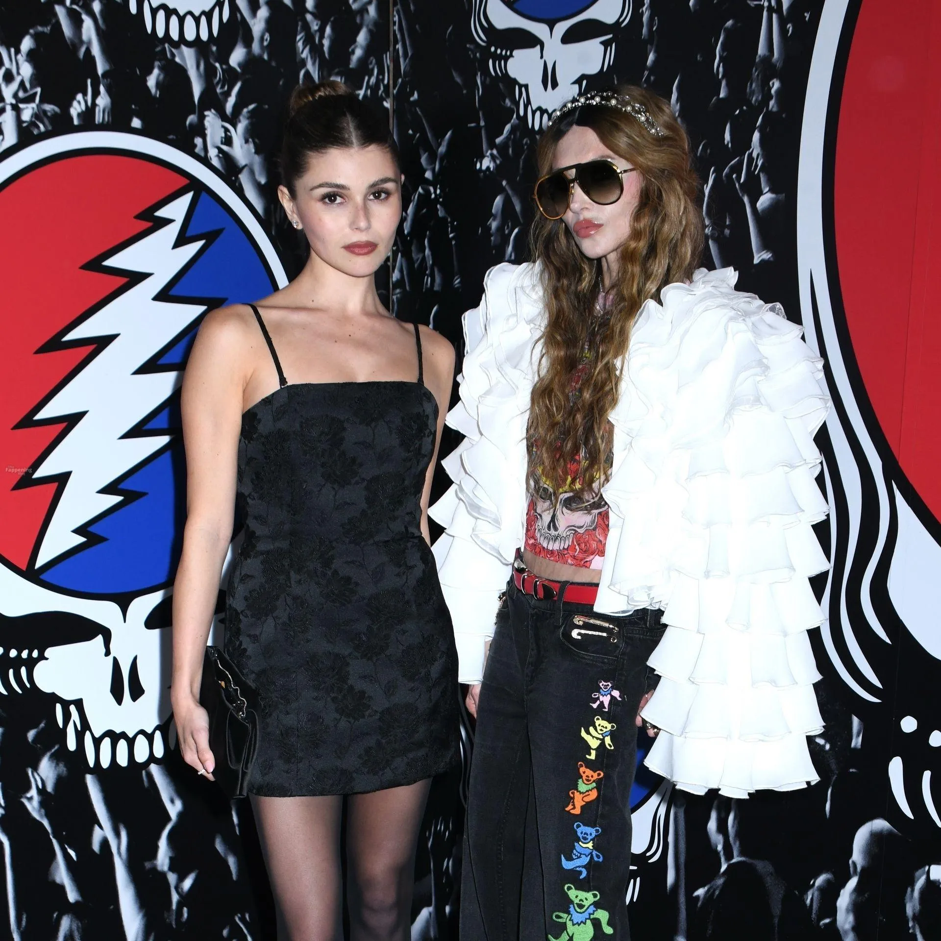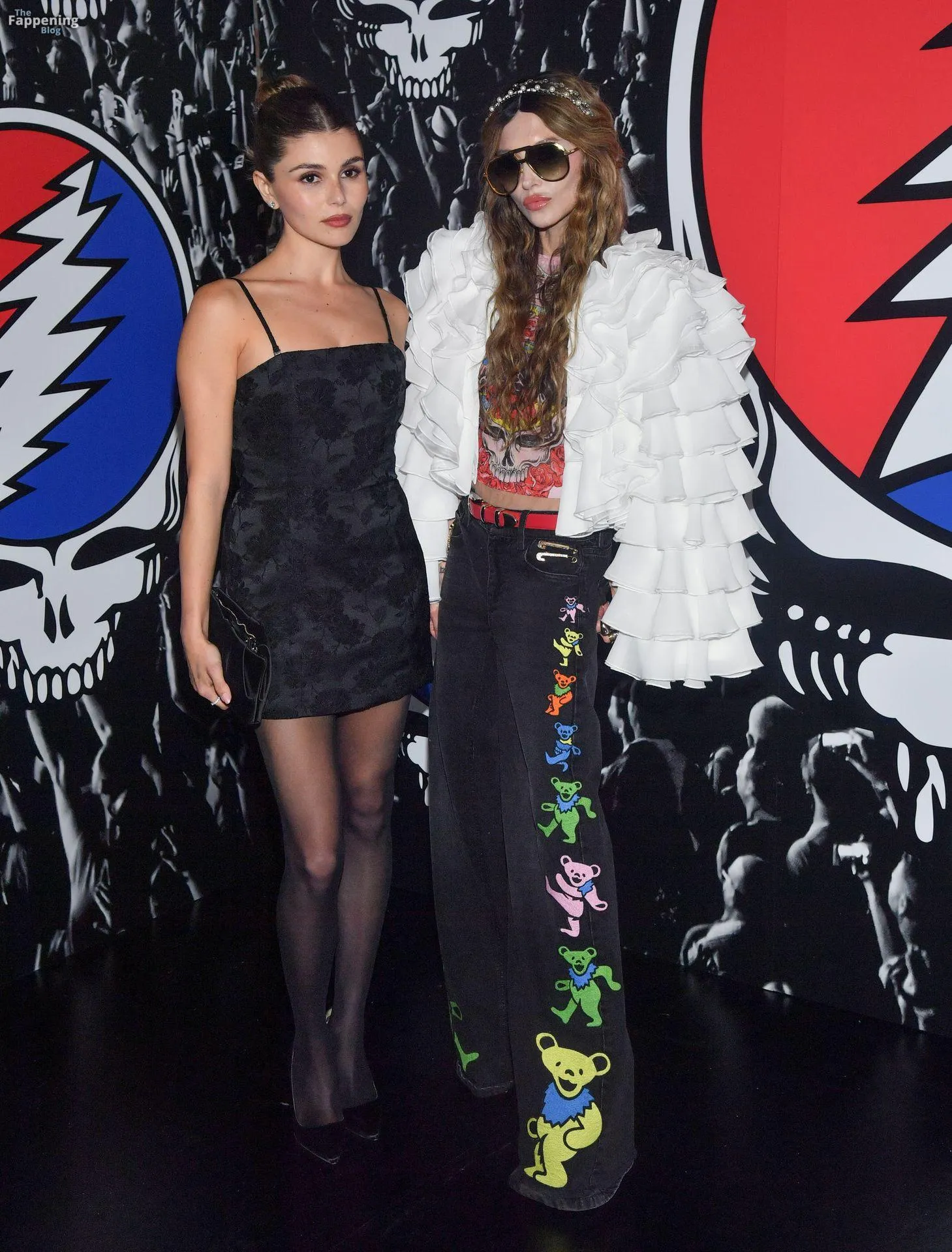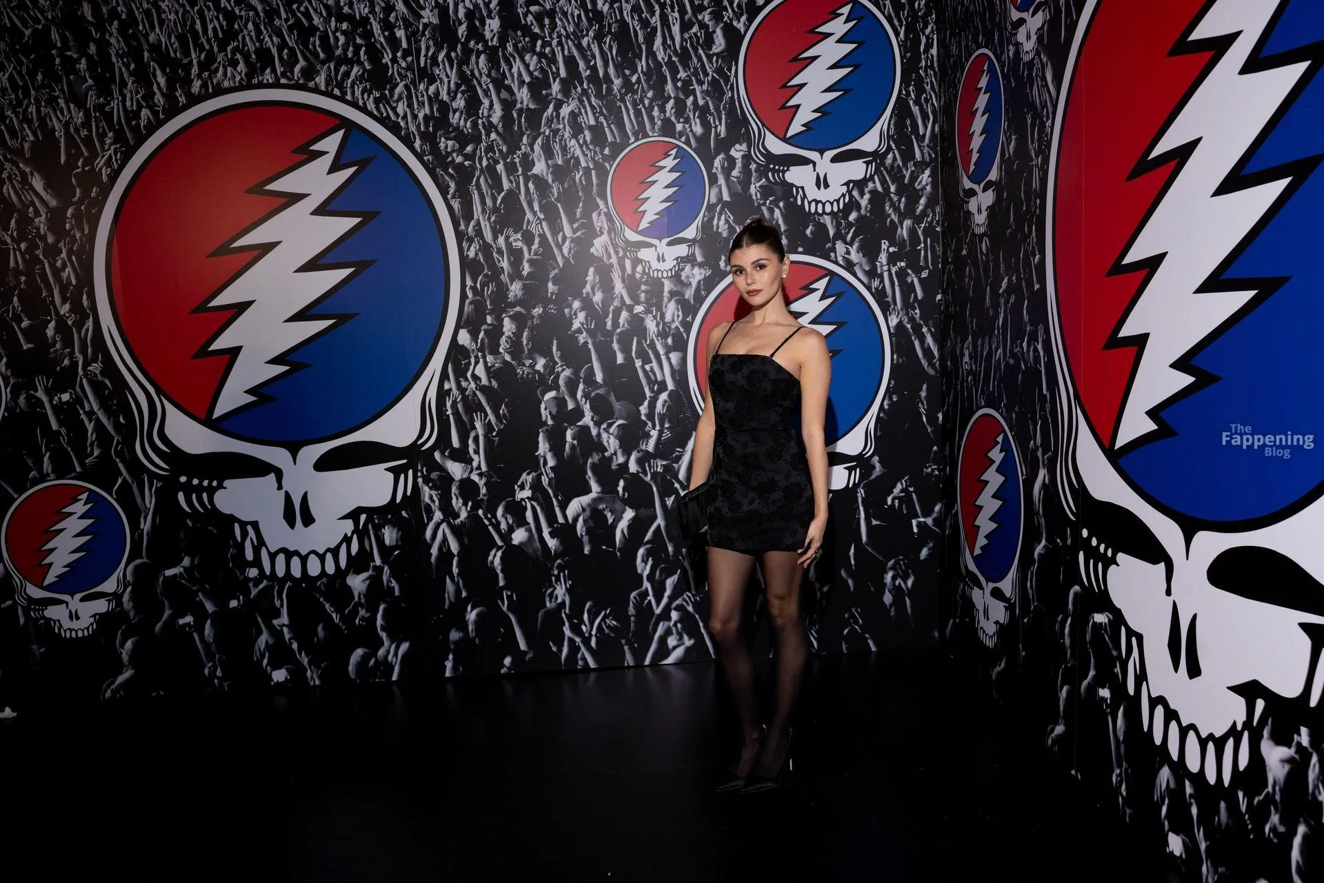 Olivia Jade Giannulli shows off her sexy legs in a black mini dress and sheer tights at the Alice + Olivia x Grateful Dead launch party in NYC.