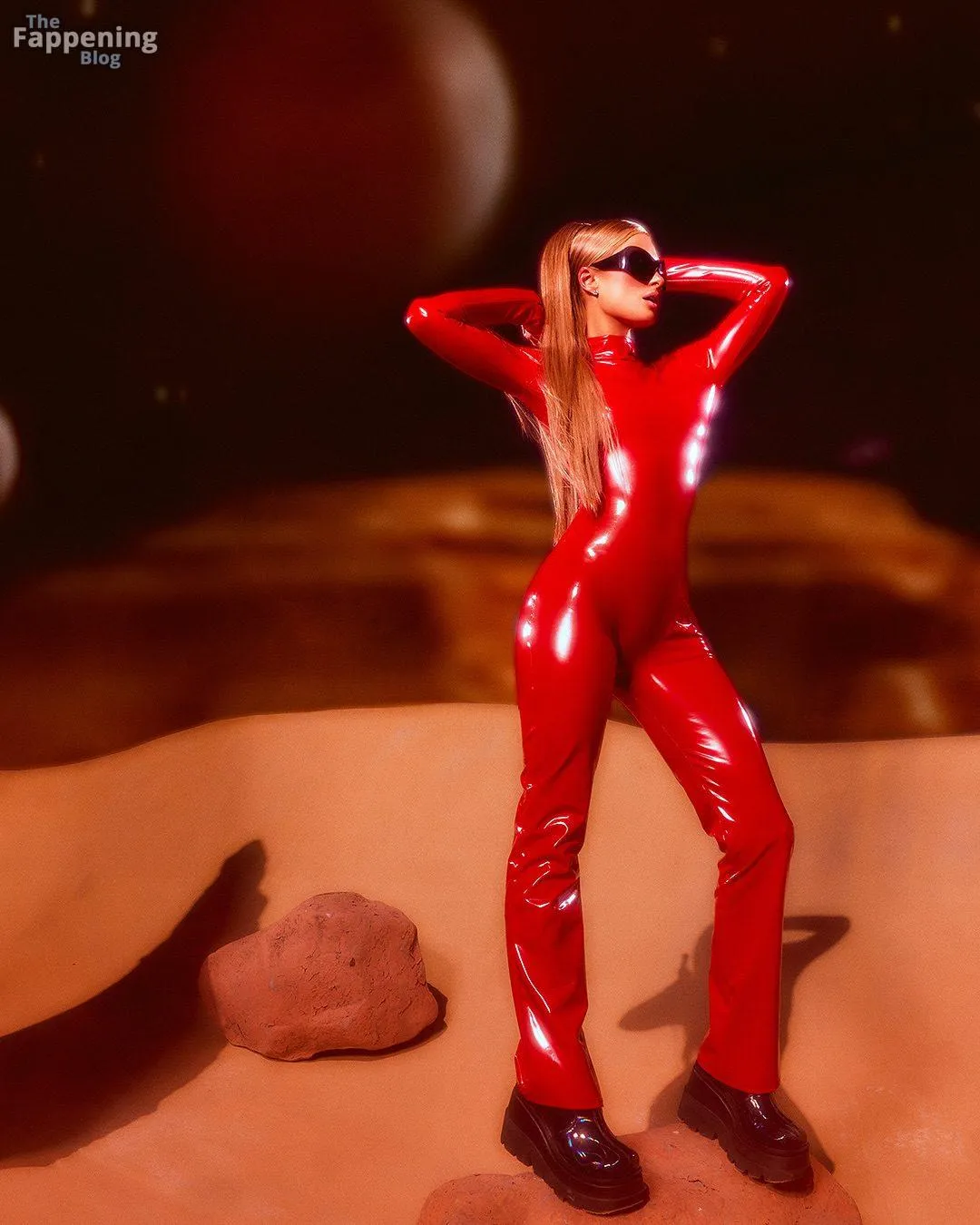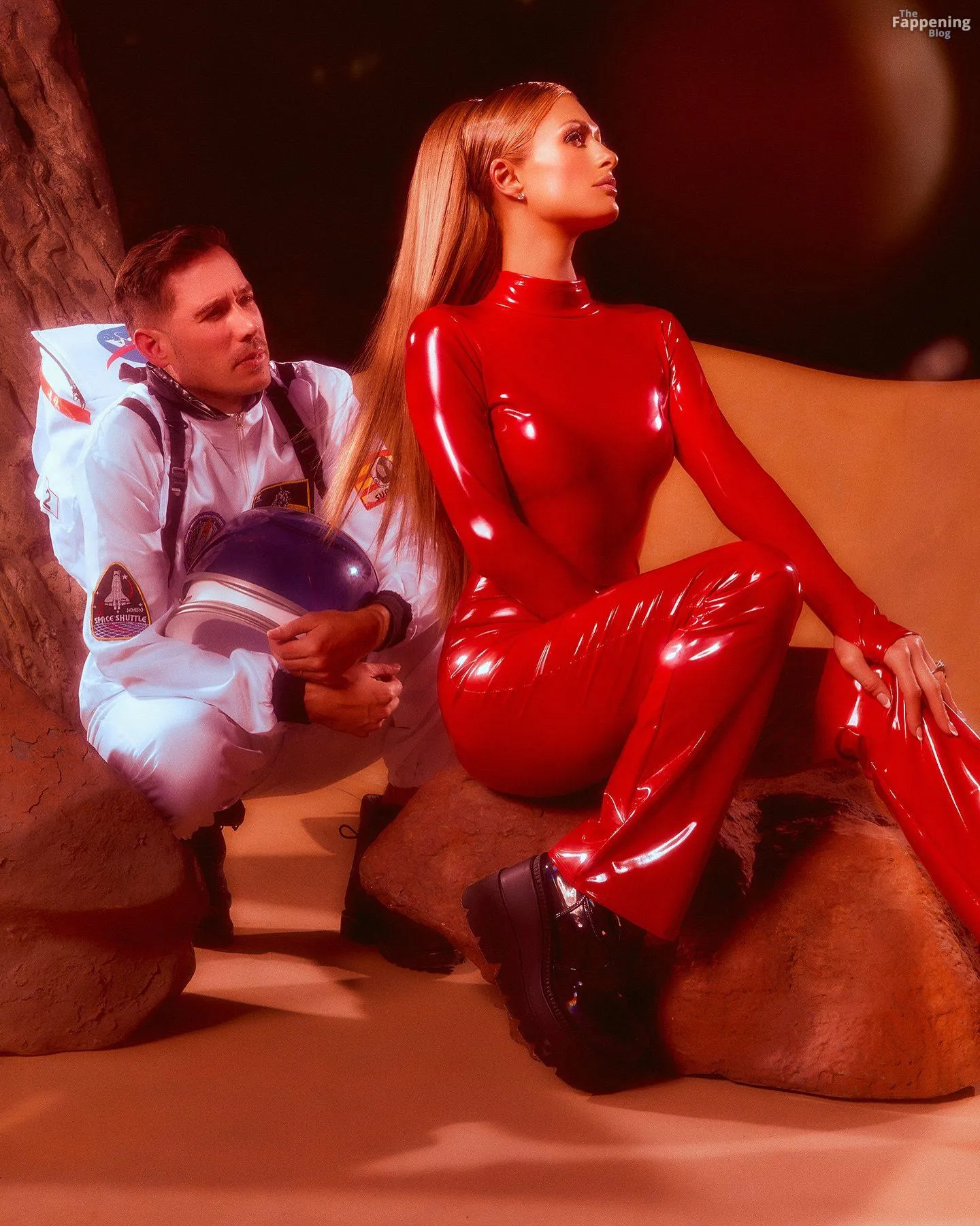 Paris Hilton poses in a red latex outfit for the “Oops!… I Did It Again” shoot.