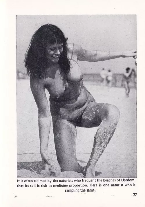"It is often claimed by the naturists who frequent the beaches of Usedom that its soil is rich in medicine proportion. Here is one naturist who is sampling the same." (H&E Apr 1973. Usedom is located in East Germany)