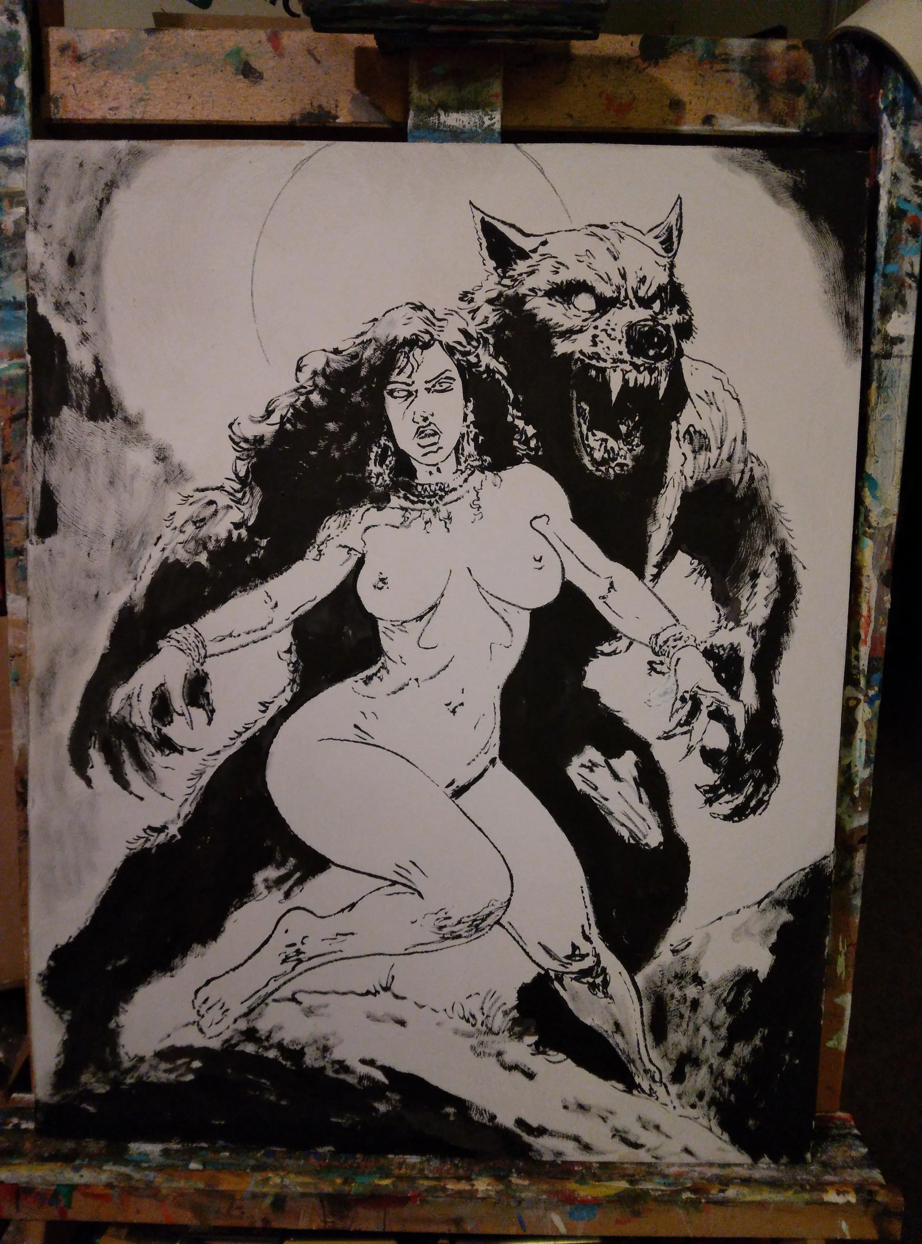 "Werewolf Queen", painting in progress, ink on 16x20 Gessoed Hardboard, my work nudes