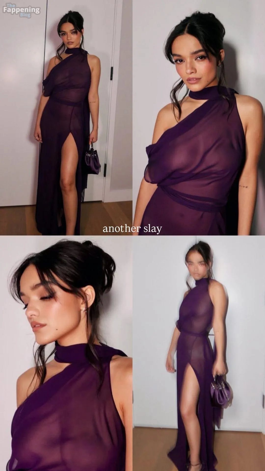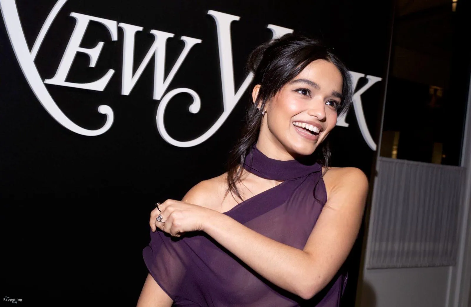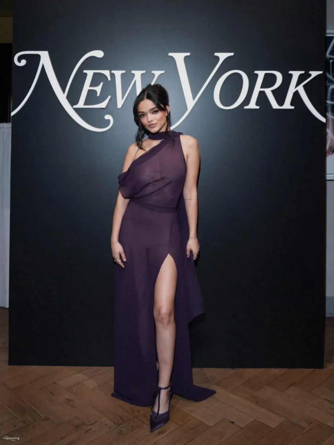 Rachel Zegler is seen at the NYMag Culturati Cocktail red carpet. She rolled up braless in a sheer purple gown that showin’ her sexy tits with pasties.