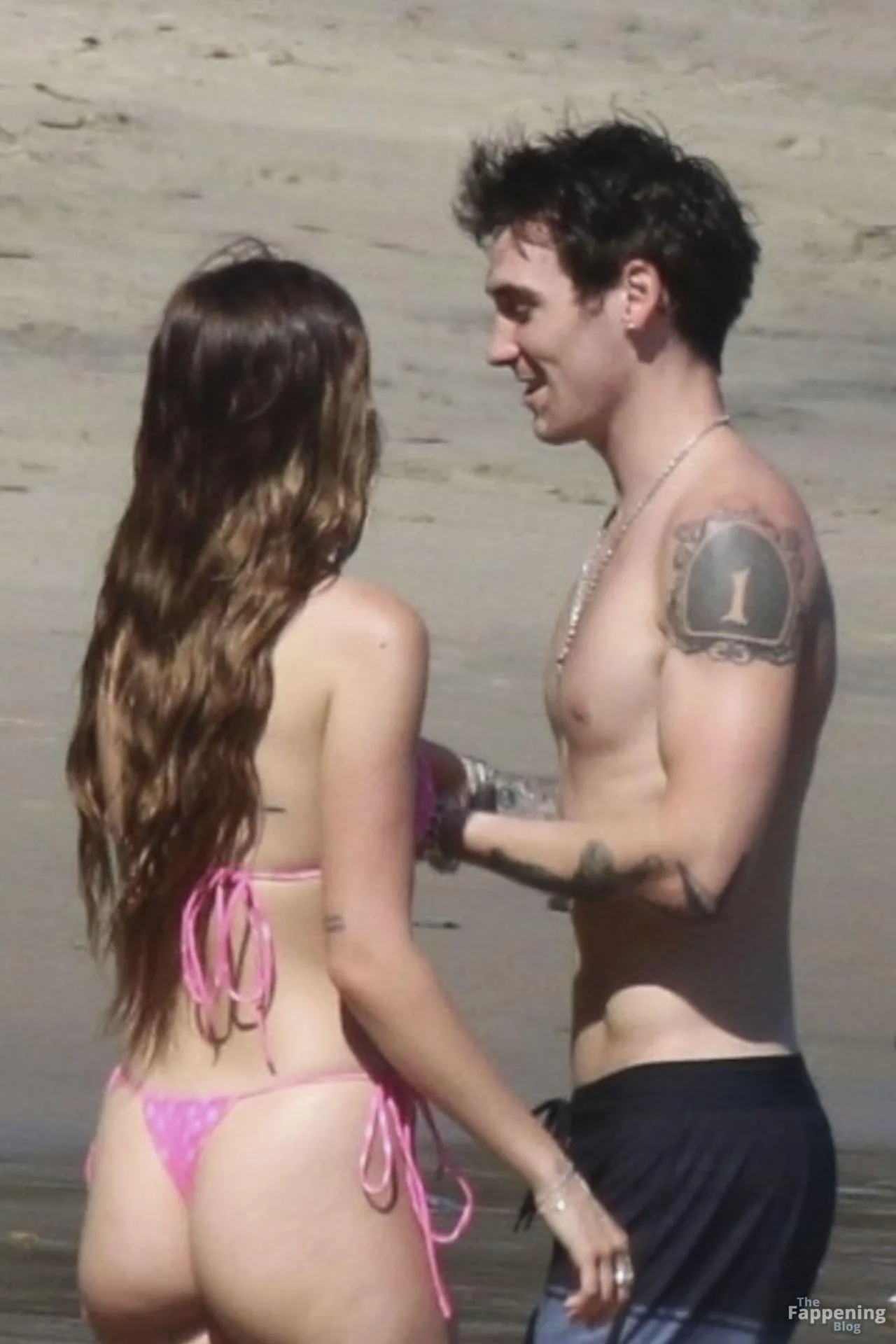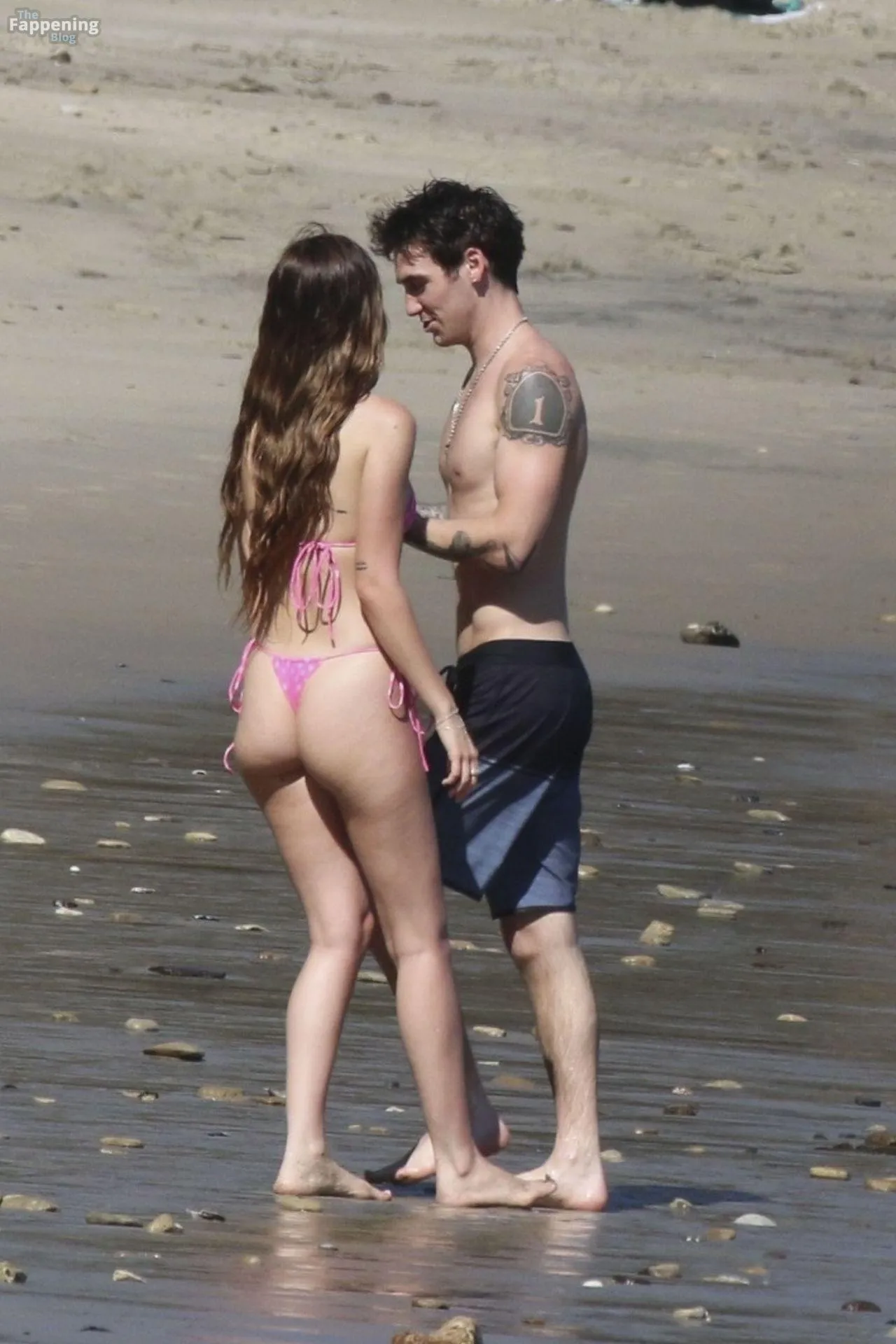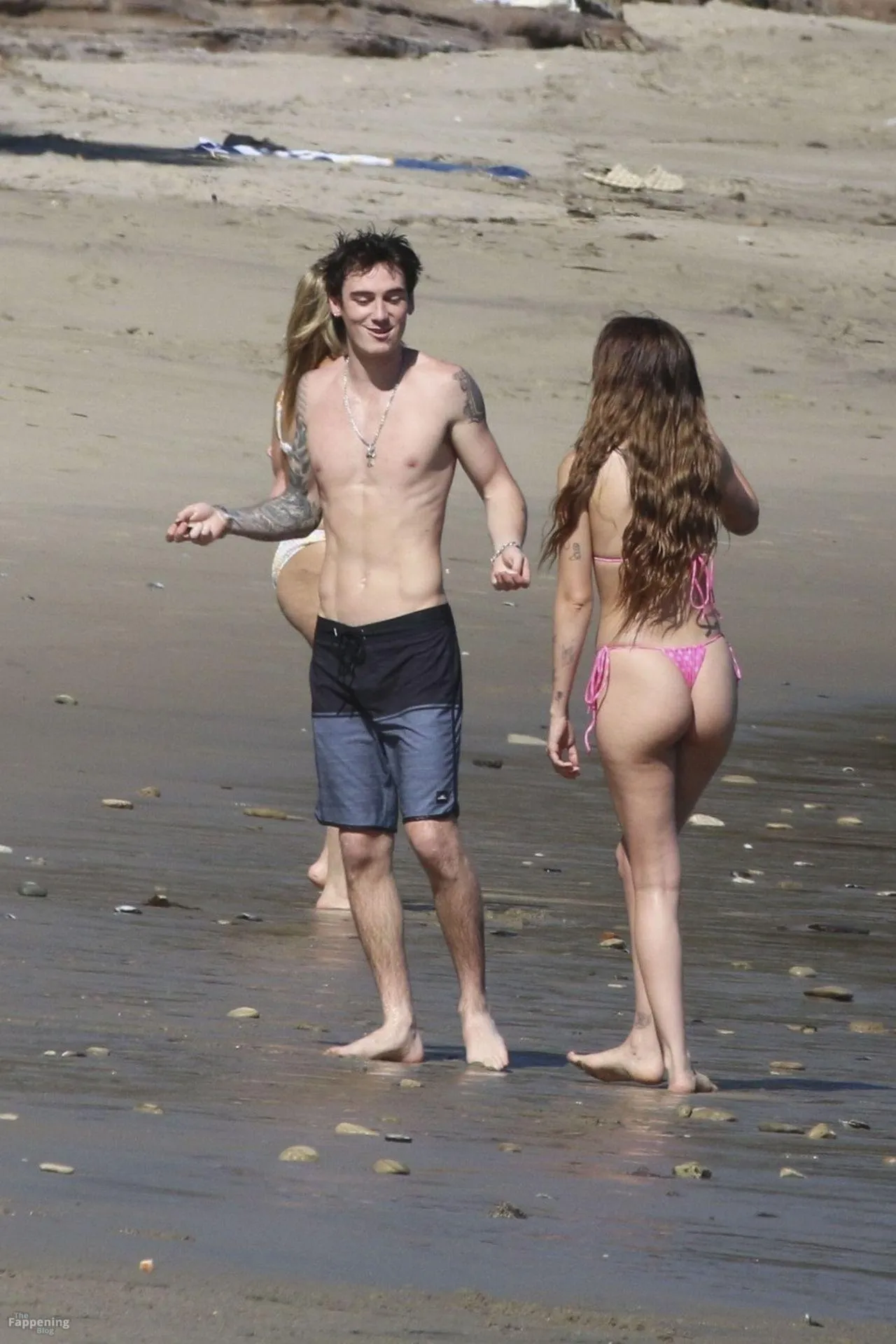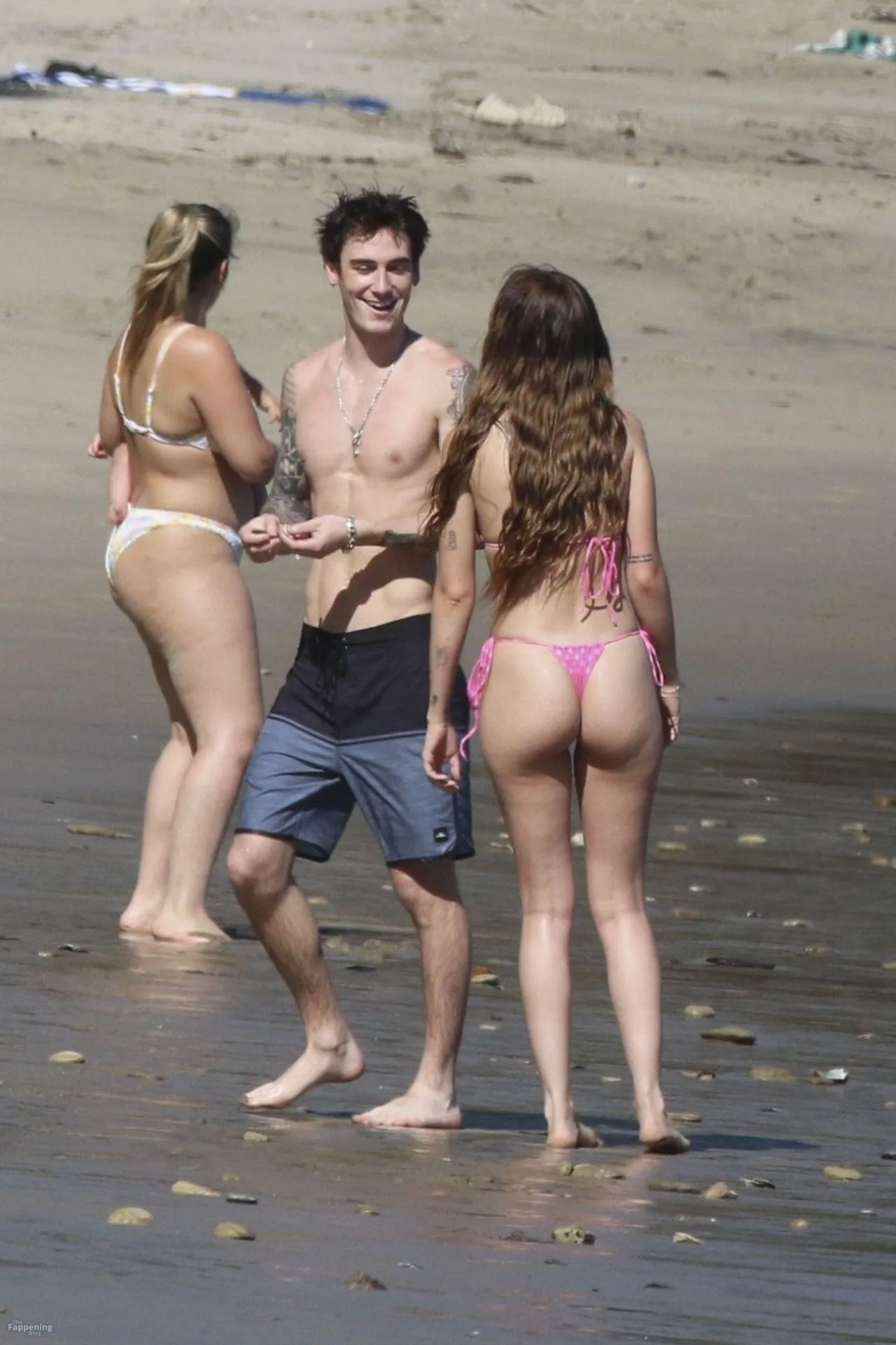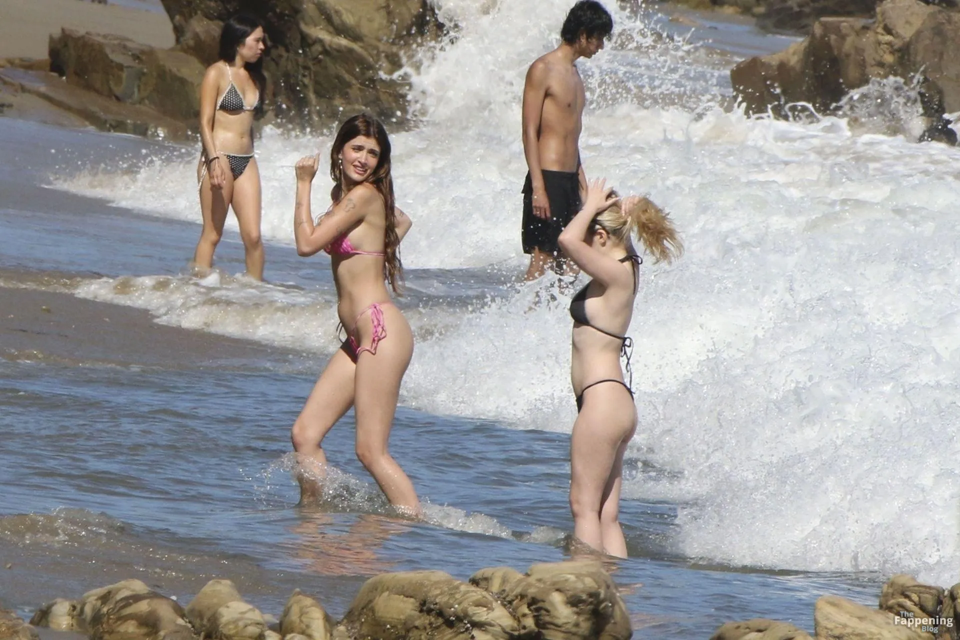 Model Sami Sheen is seen looking stunning in a pink thong bikini while picking up shells and enjoying a sunny day on the beach with believed to be boyfriend and friends in Malibu, California.