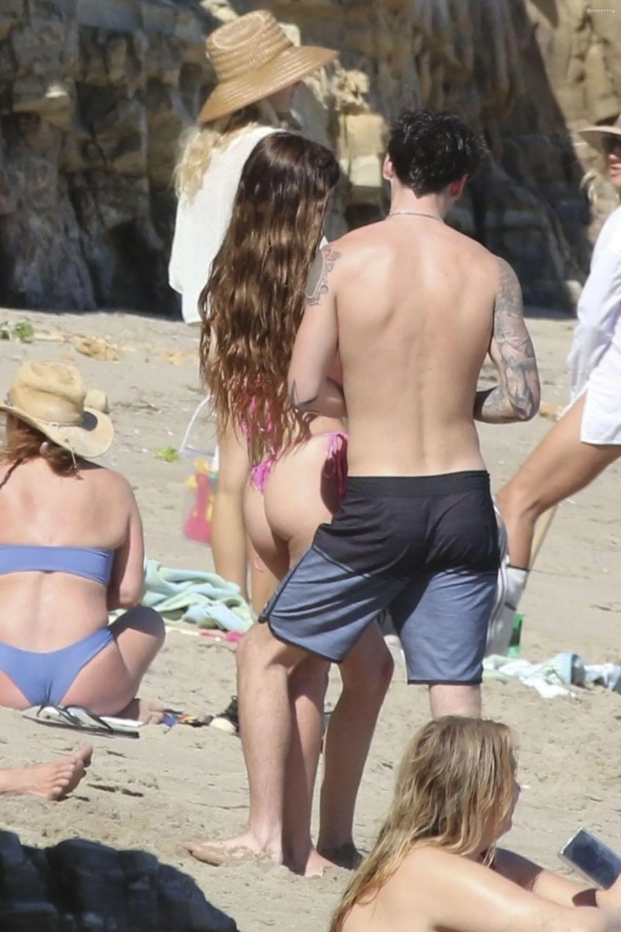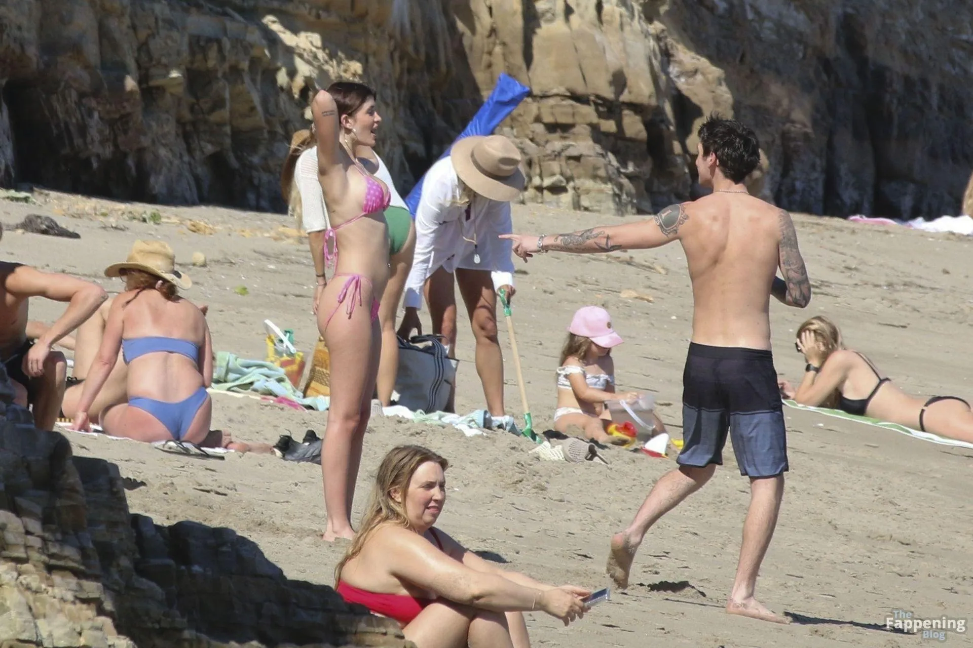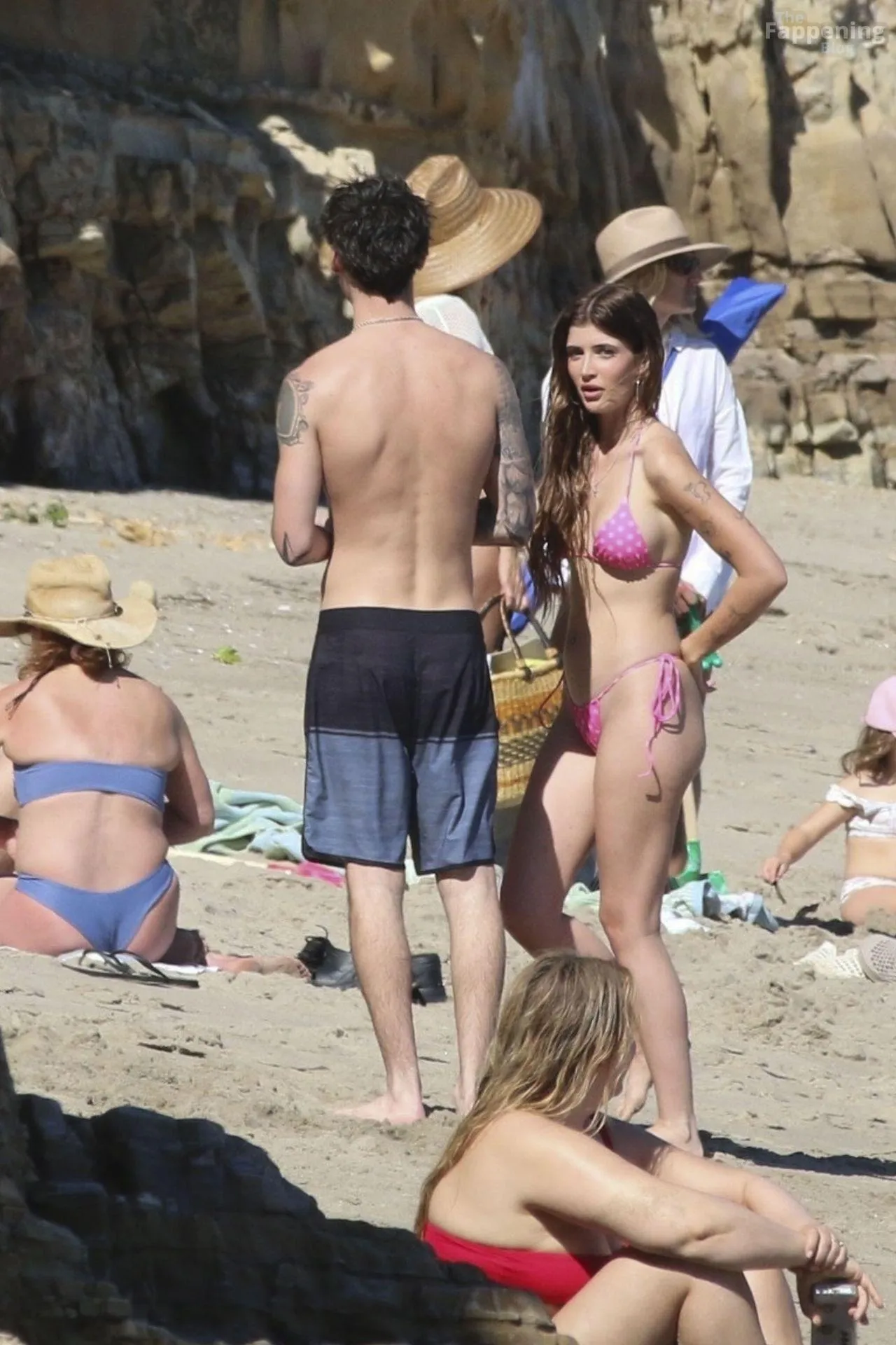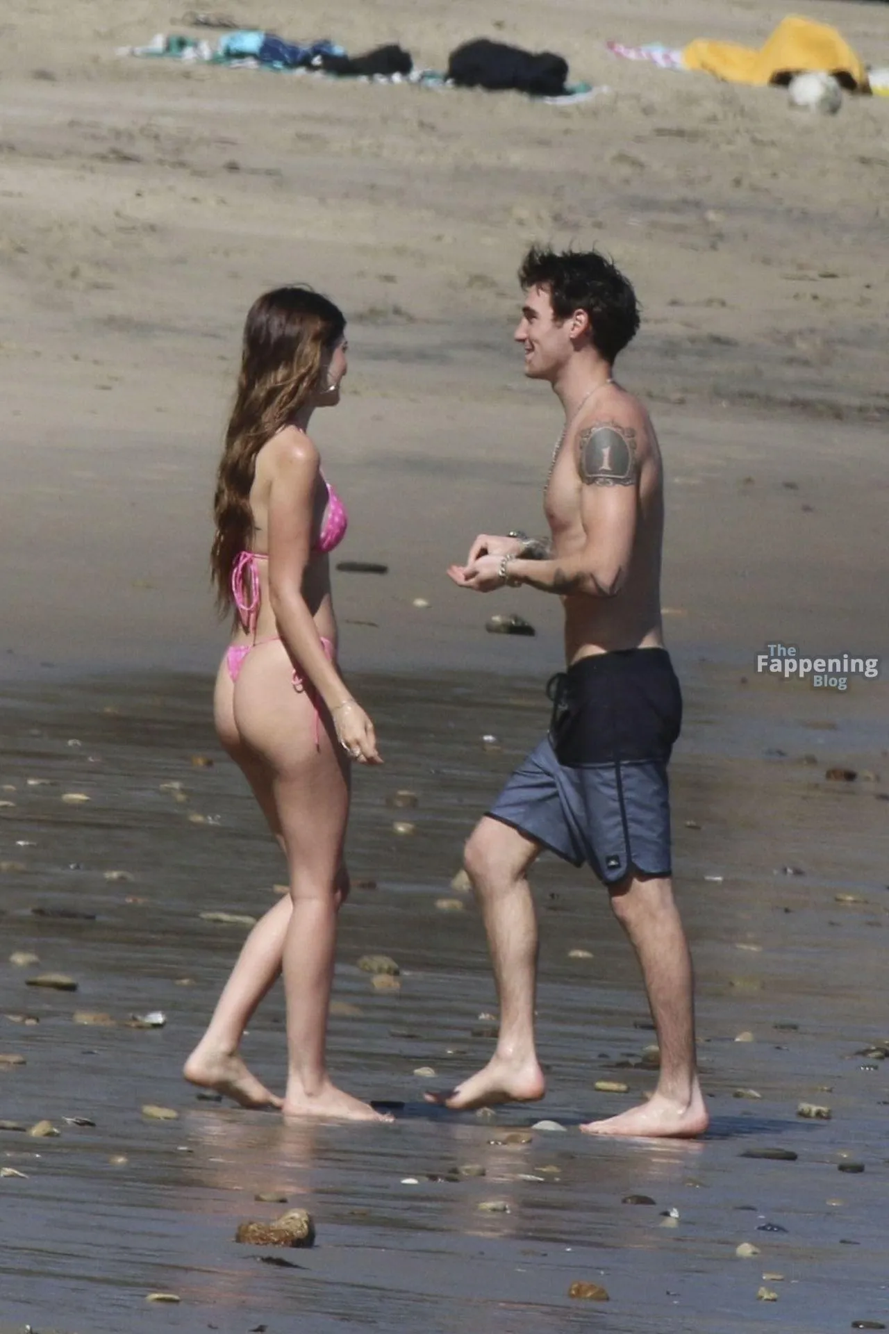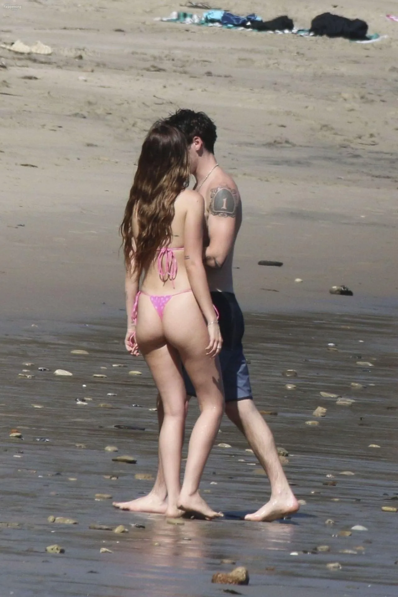 Model Sami Sheen is seen looking stunning in a pink thong bikini while picking up shells and enjoying a sunny day on the beach with believed to be boyfriend and friends in Malibu, California.