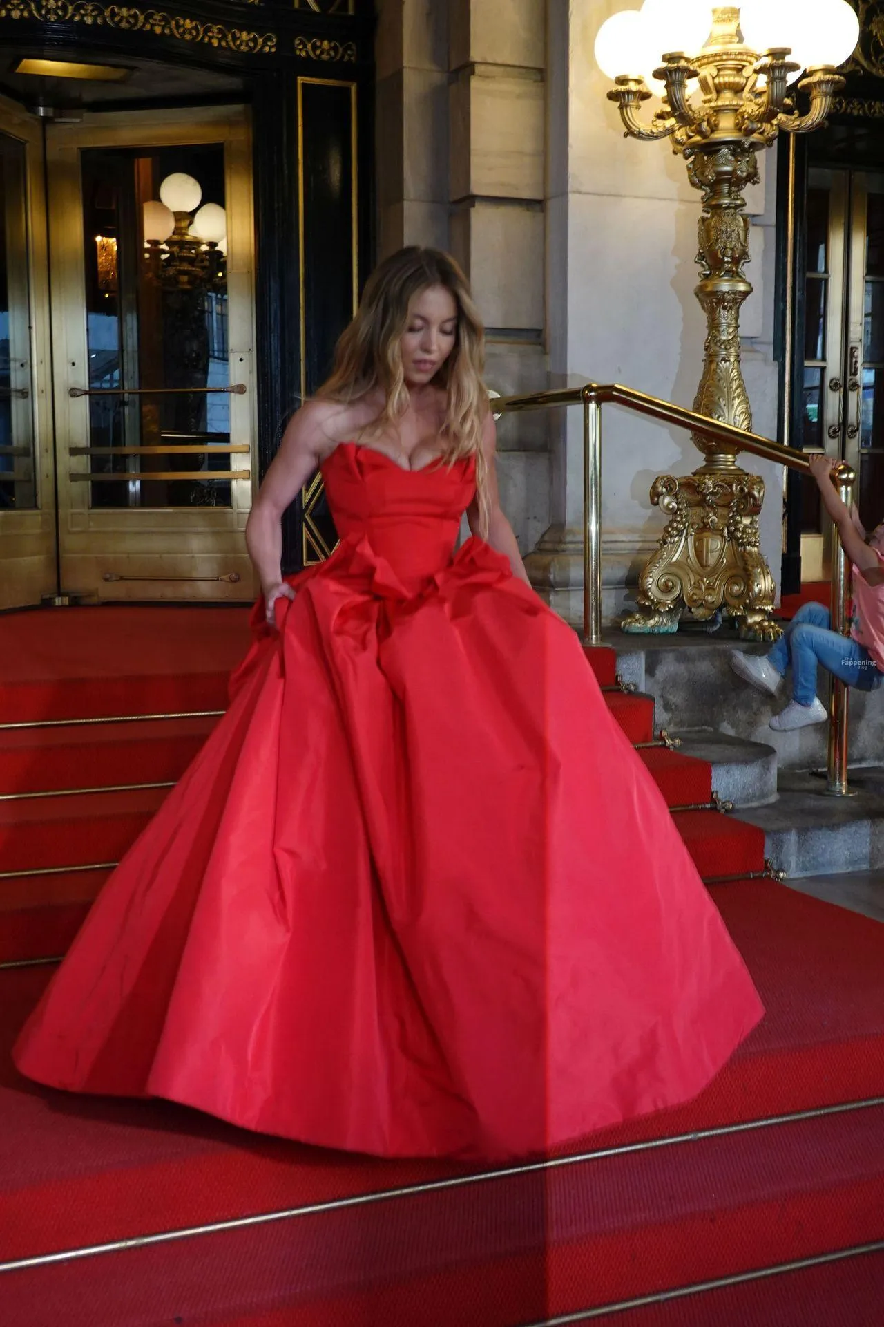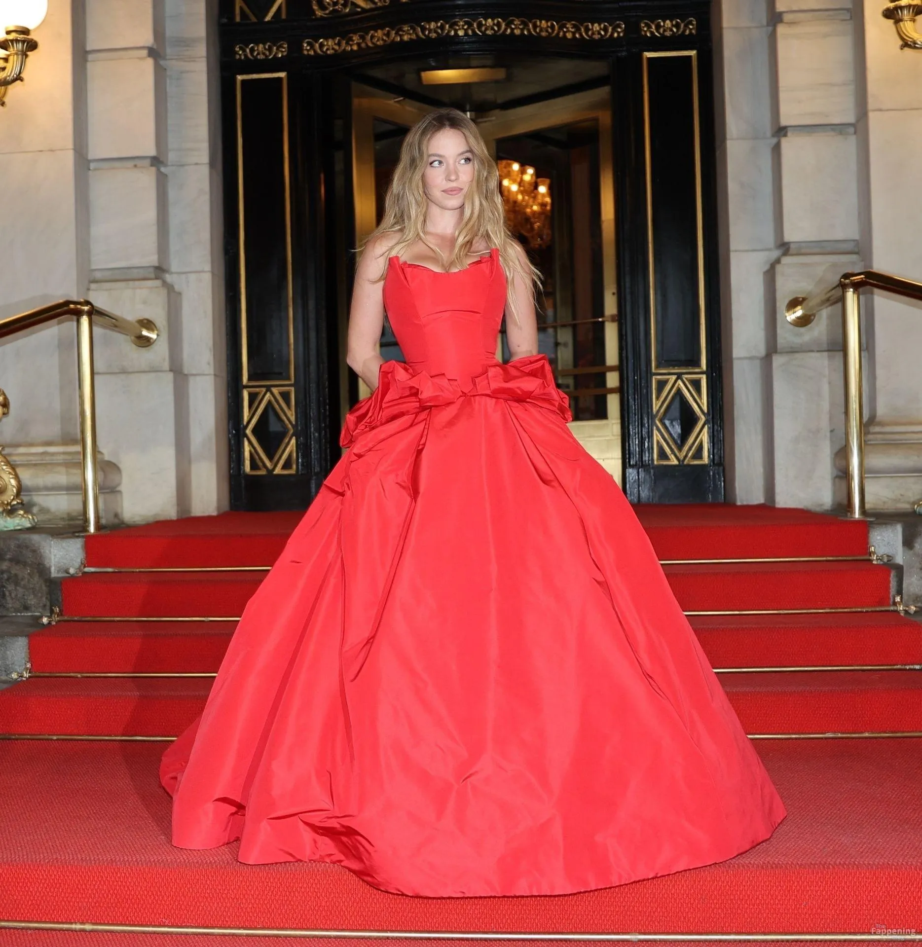 Sydney Sweeney looked like a princess as she stepped out of the Plaza Hotel in New York City wearing a striking red gown ahead of the “Echo Valley” premiere.