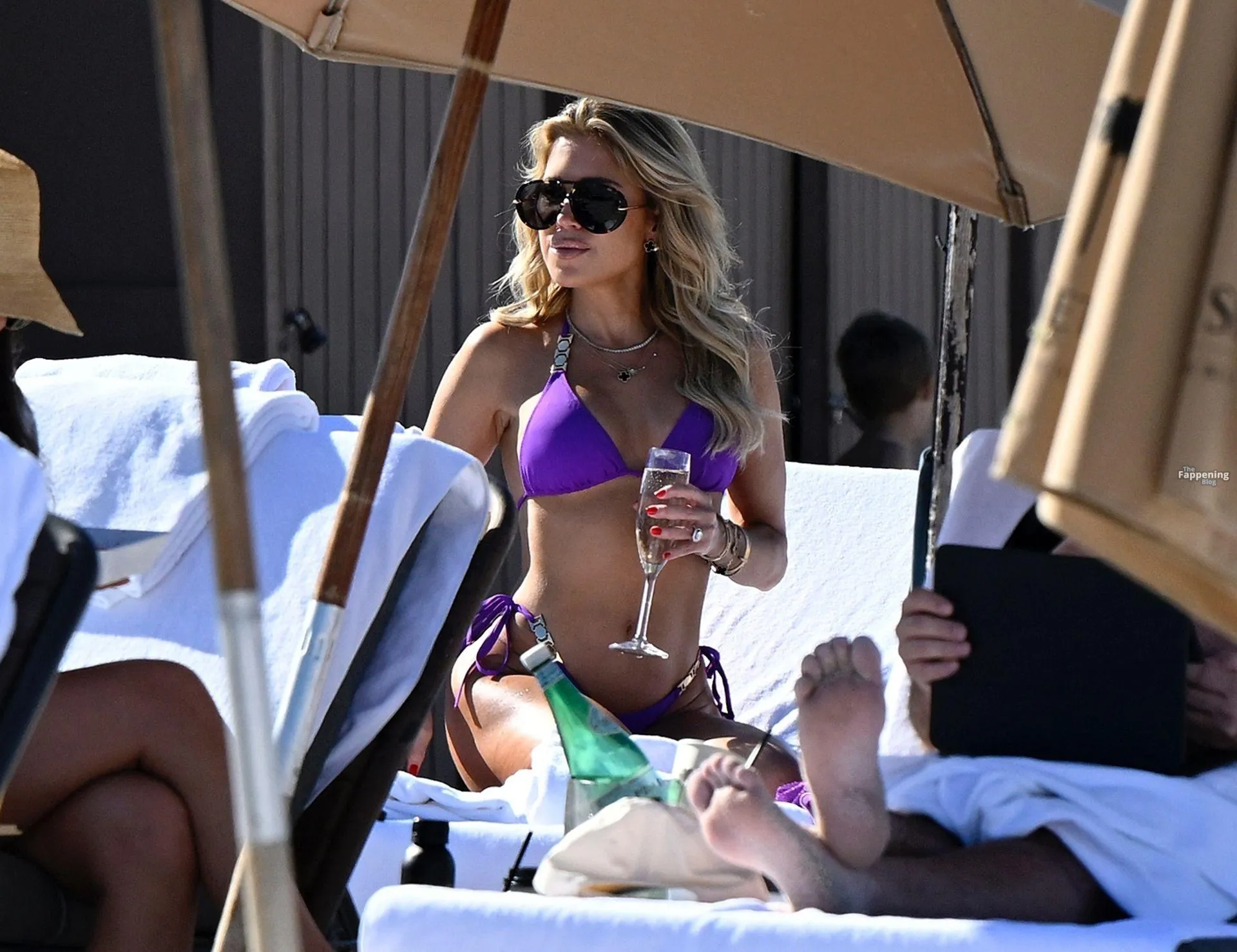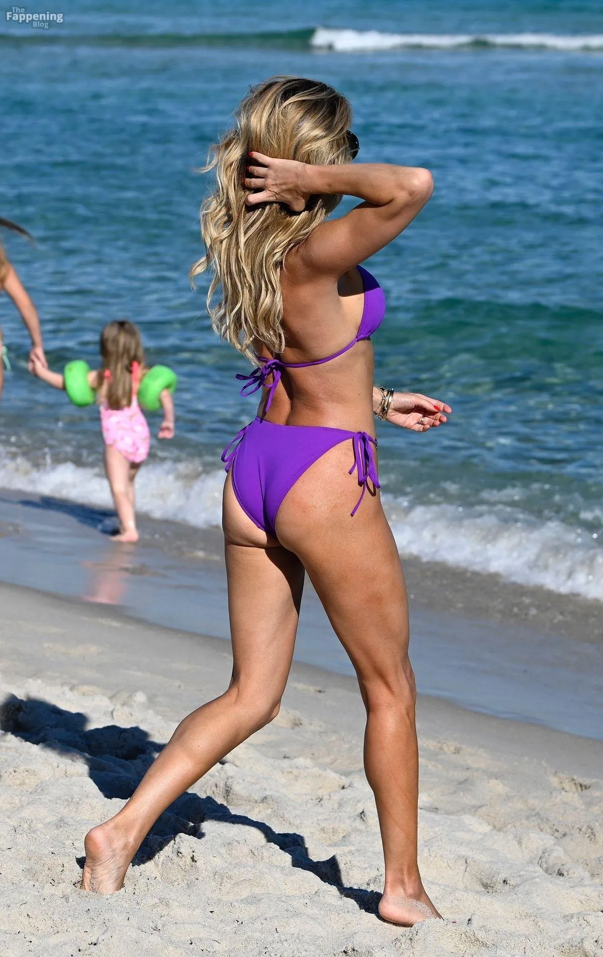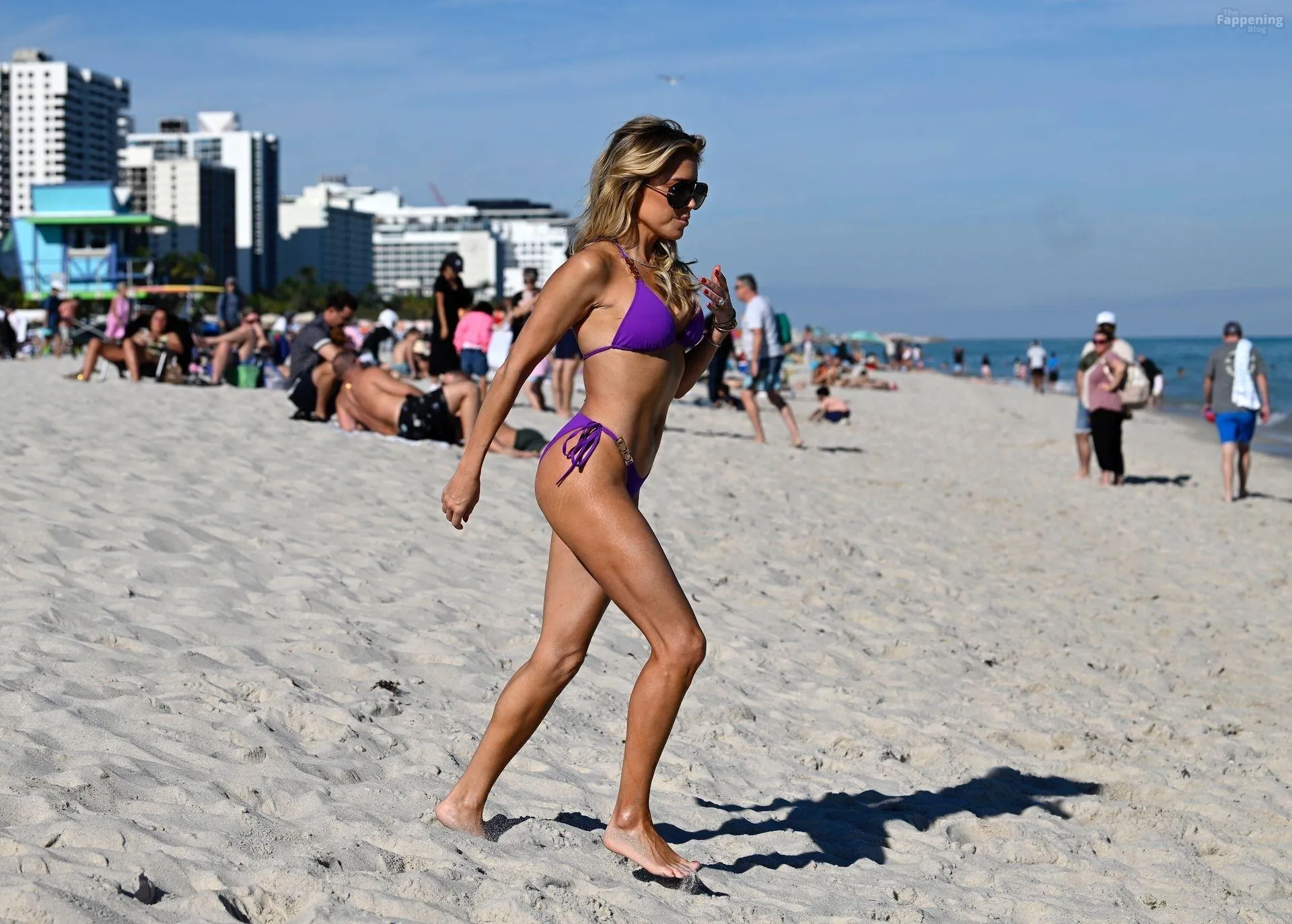 Dutch TV personality and model Sylvie Meis was seen enjoyin’ the sunshine in Miami Beach durin’ her New Year’s holiday. She stunned in a vibrant purple bikini, accessorized with oversized sunglasses and delicate jewelry, as she strolled along the shoreline and relaxed by the water.