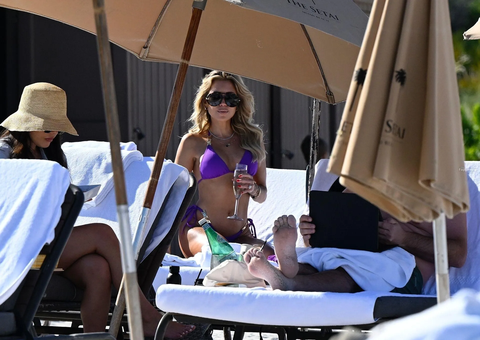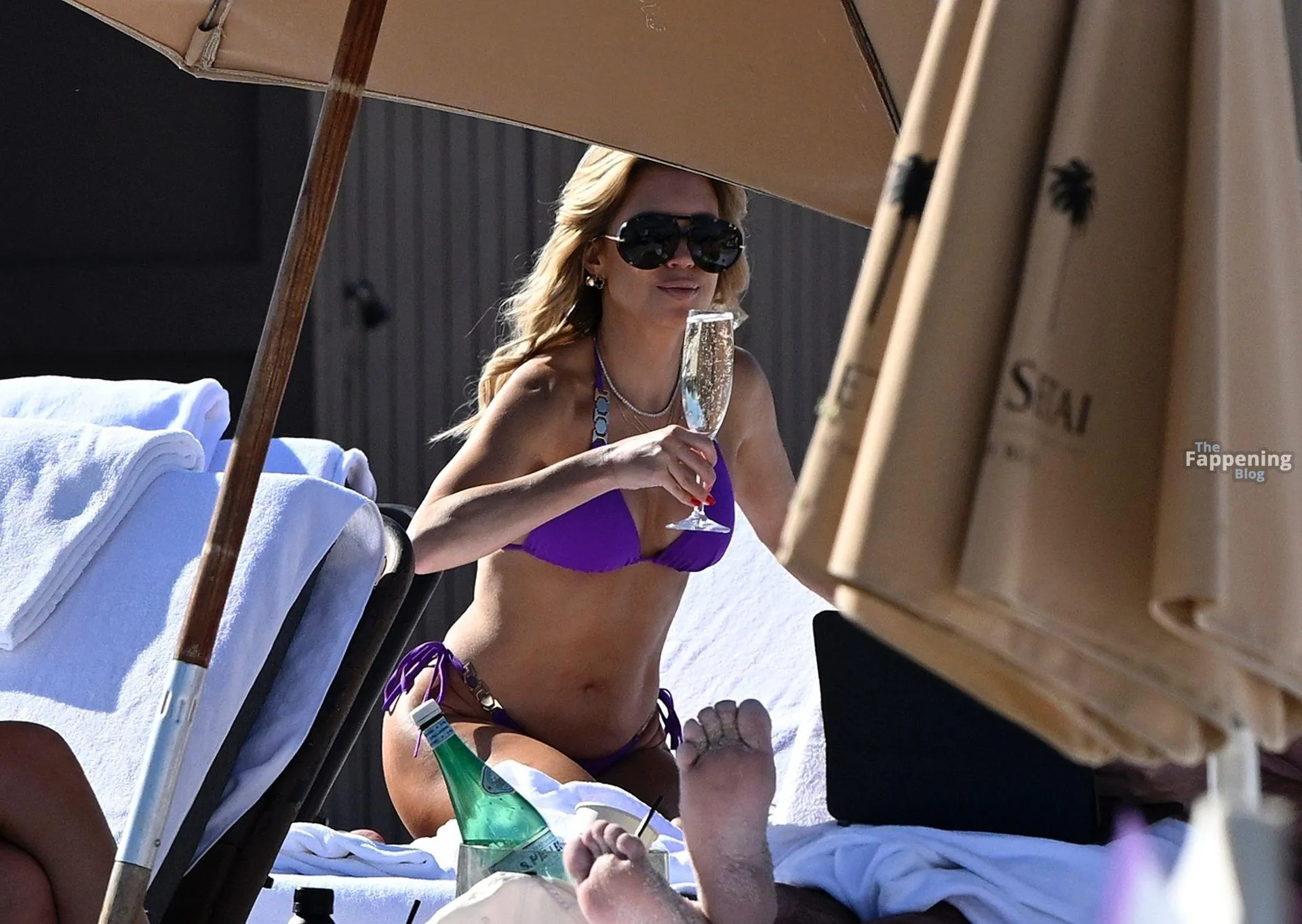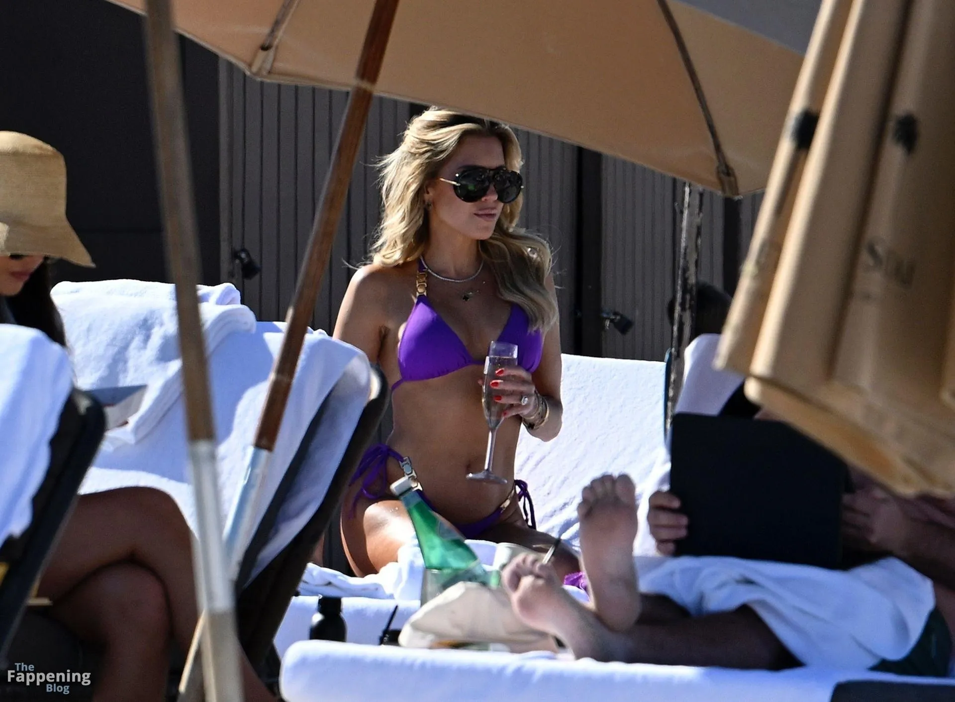 Dutch TV personality and model Sylvie Meis was seen enjoyin’ the sunshine in Miami Beach durin’ her New Year’s holiday. She stunned in a vibrant purple bikini, accessorized with oversized sunglasses and delicate jewelry, as she strolled along the shoreline and relaxed by the water.