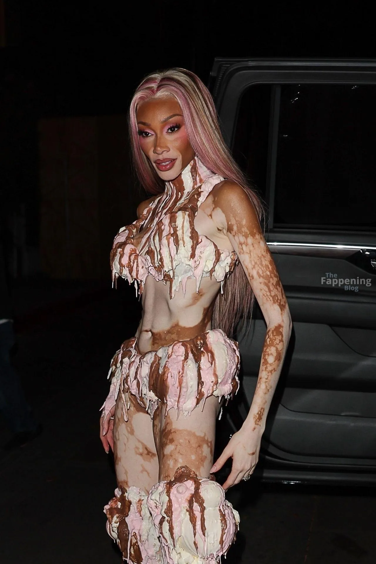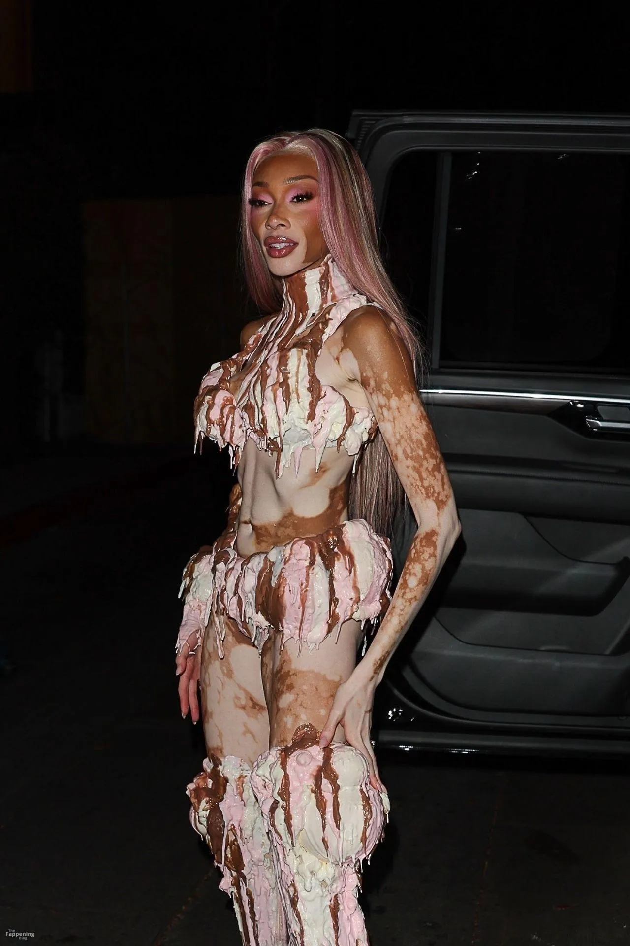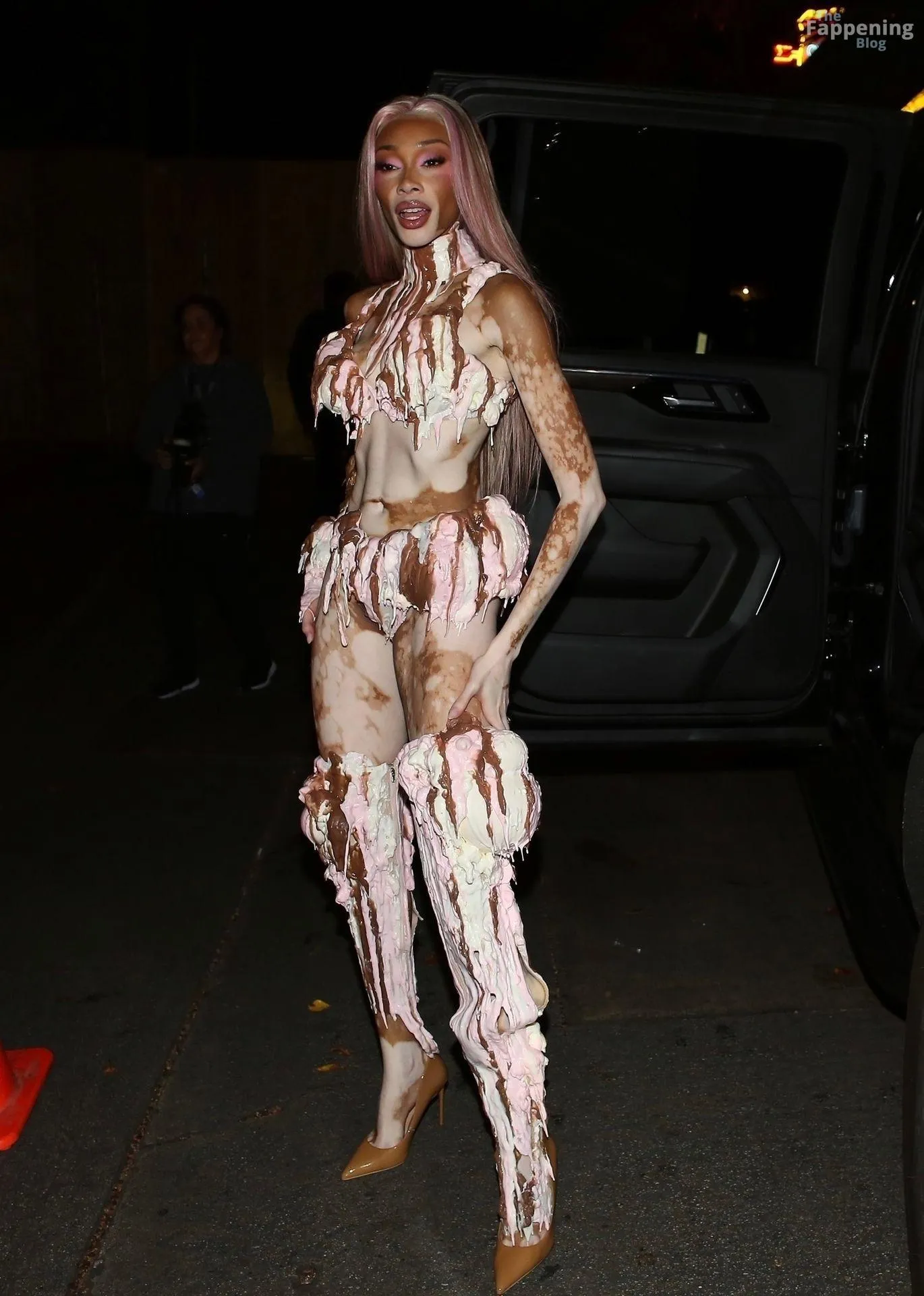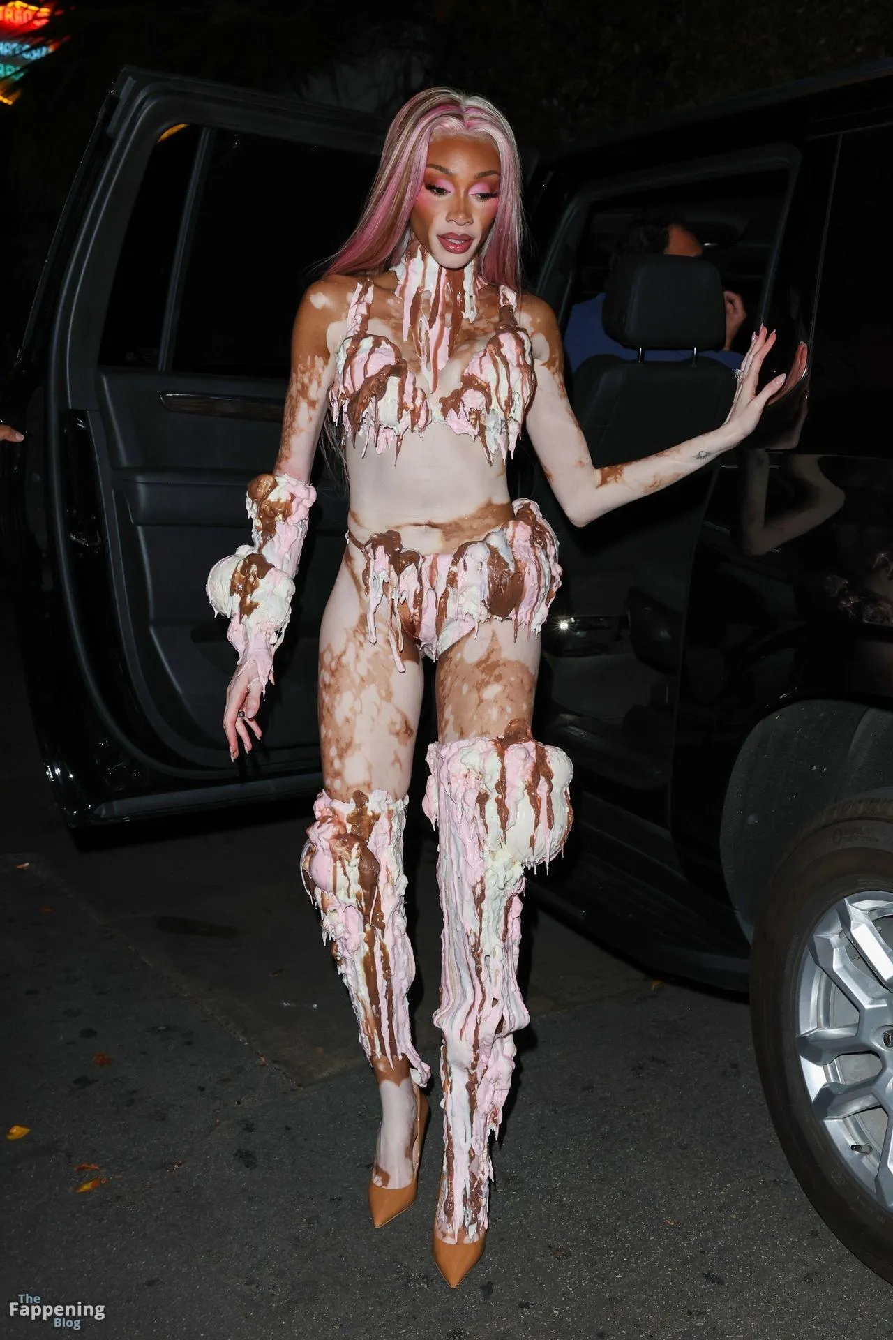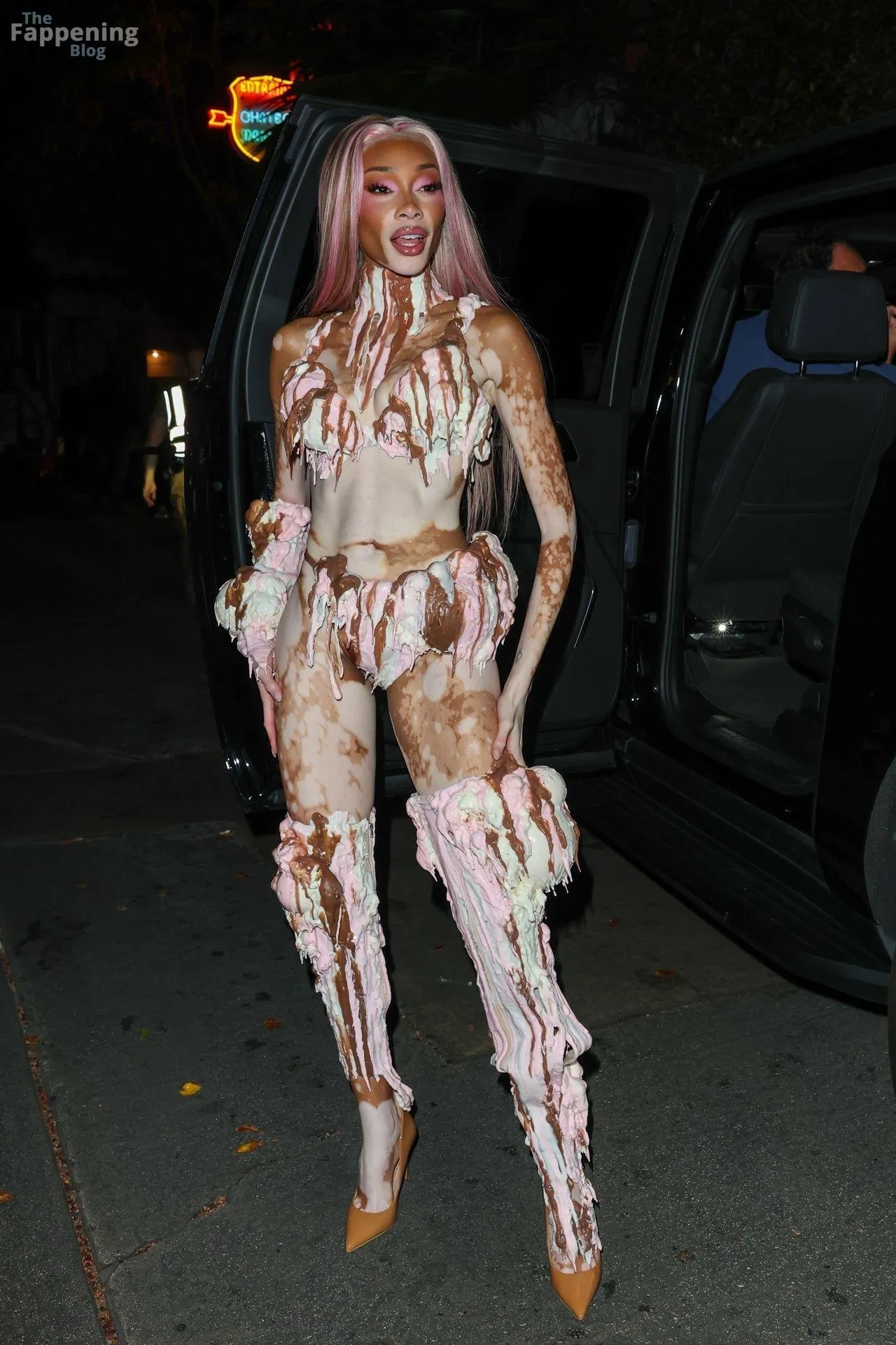Model Winnie Harlow showed up at Vas J Morgan’s big Halloween bash in LA. Check out her ice-cream outfit in the paparazzi pics below.