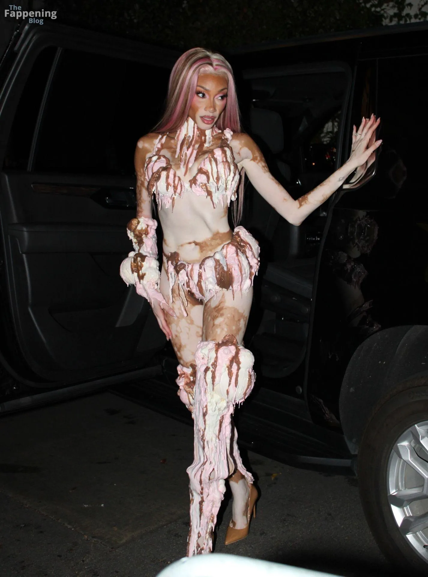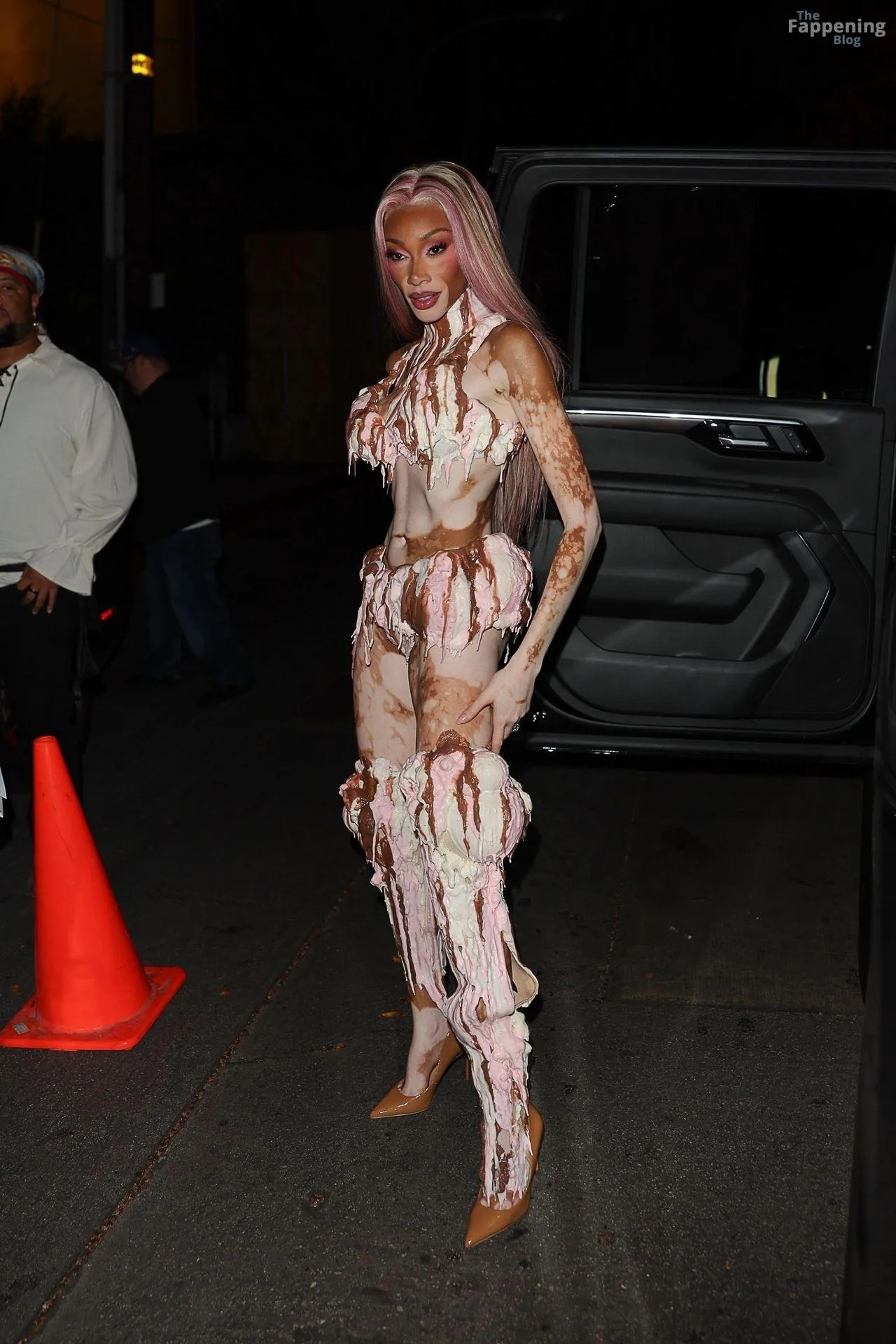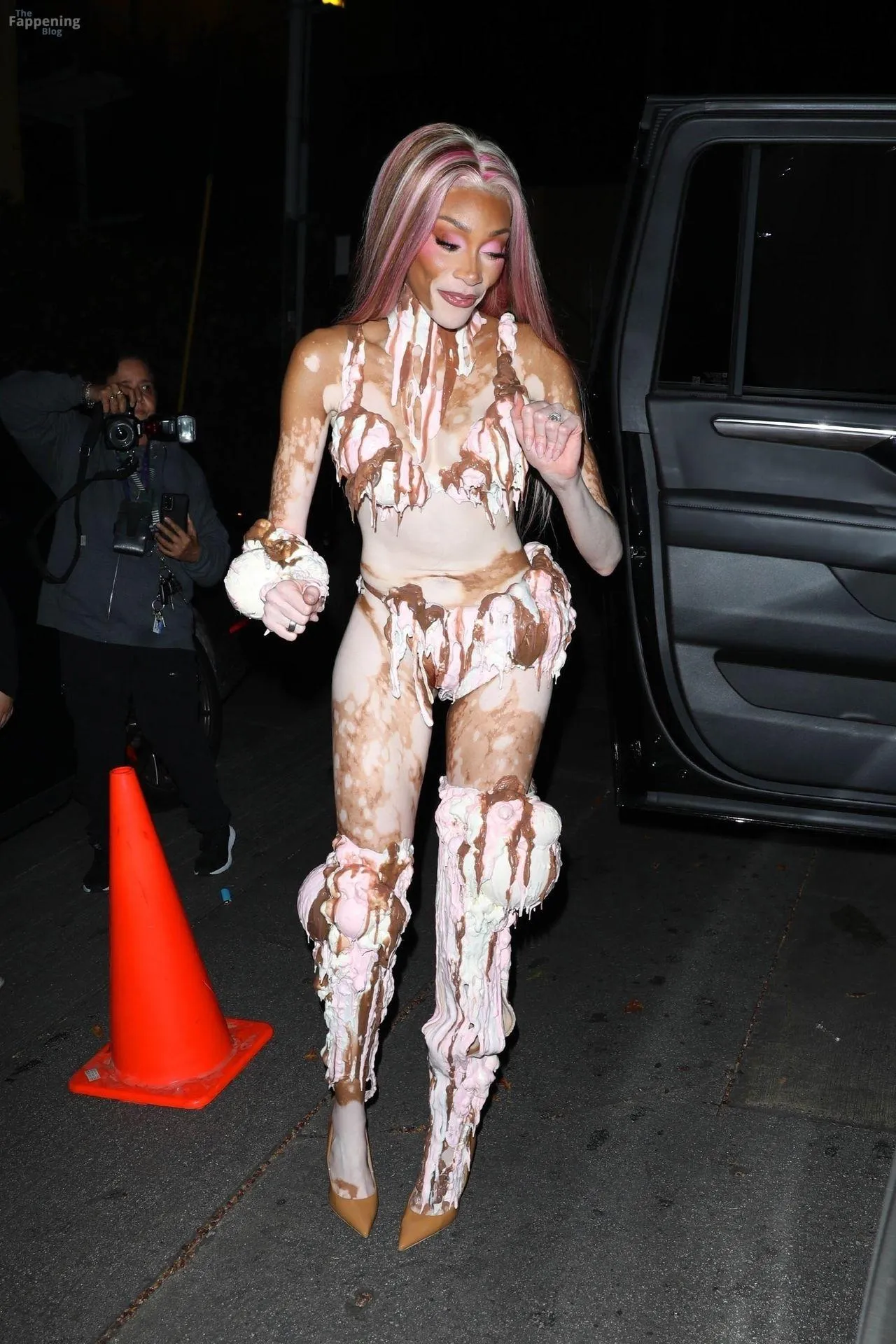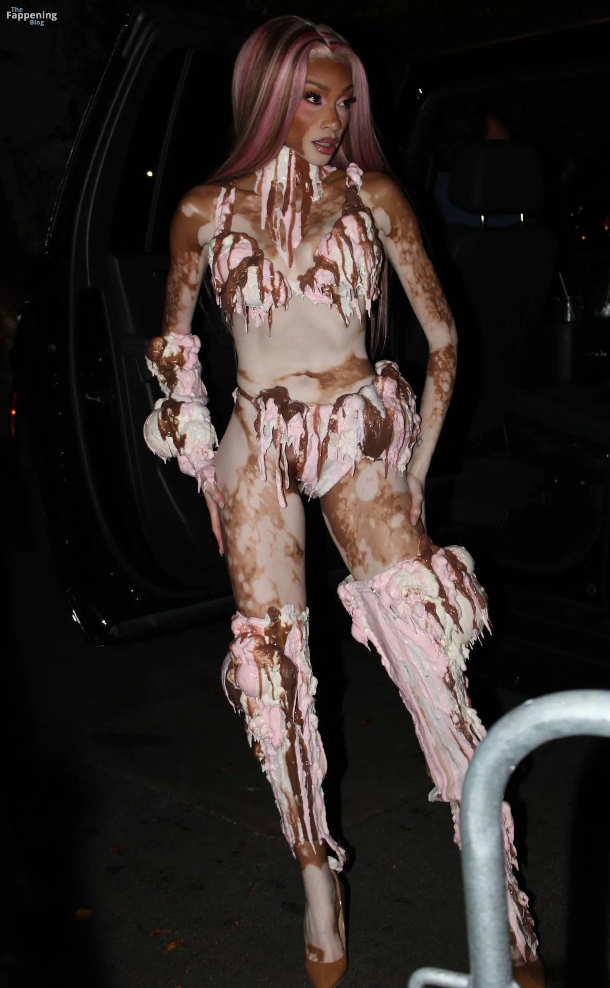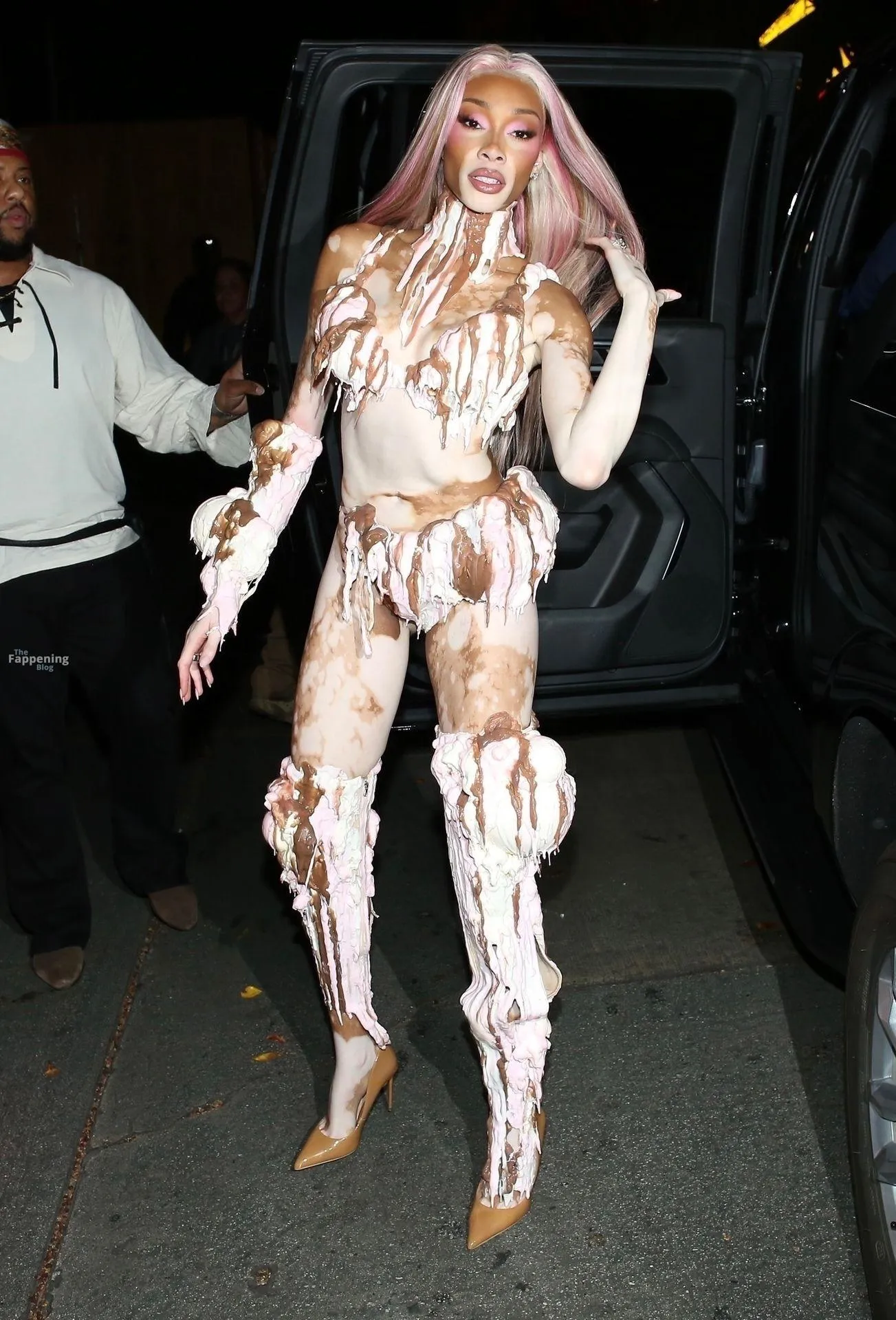Model Winnie Harlow showed up at Vas J Morgan’s big Halloween bash in LA. Check out her ice-cream outfit in the paparazzi pics below.