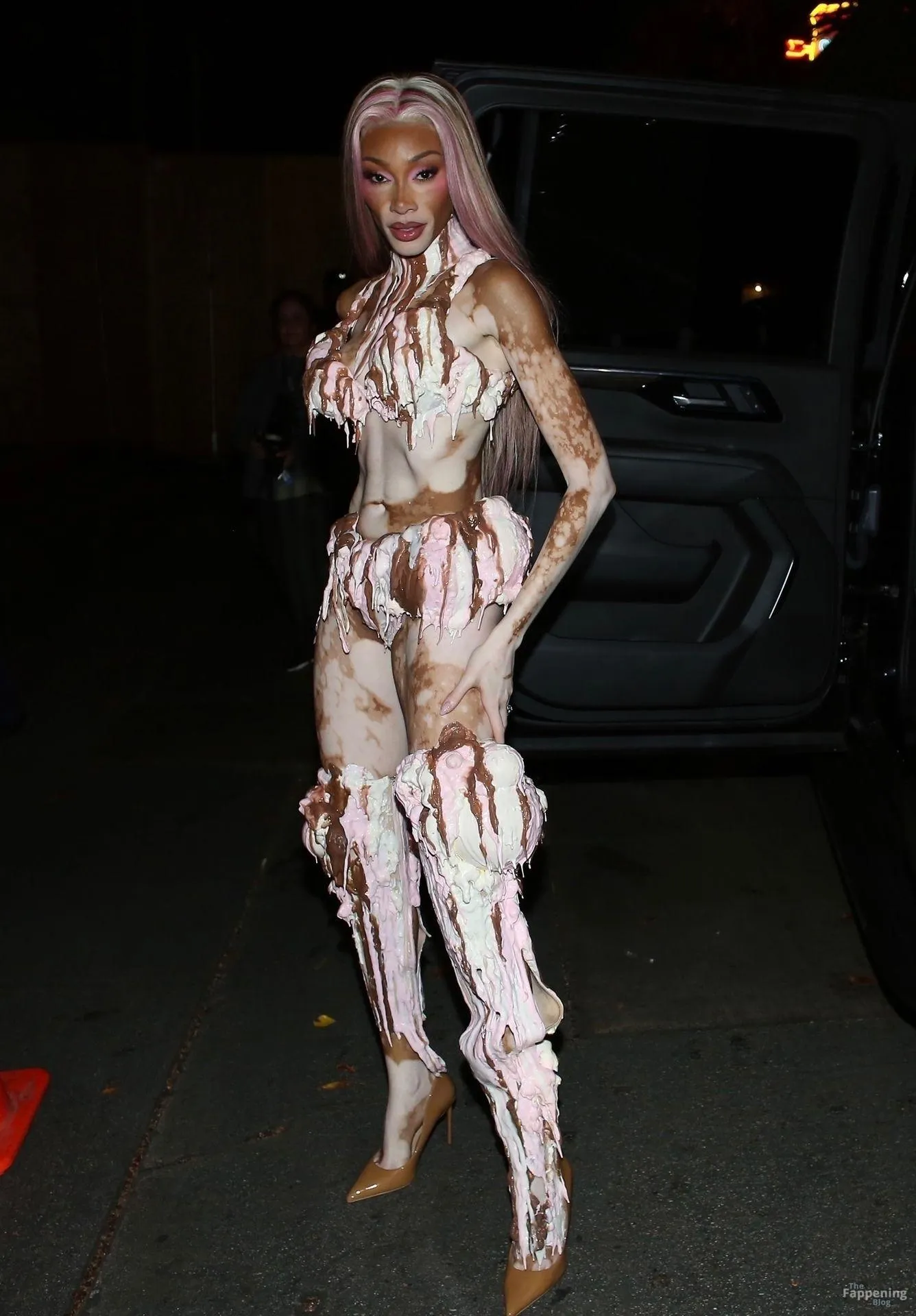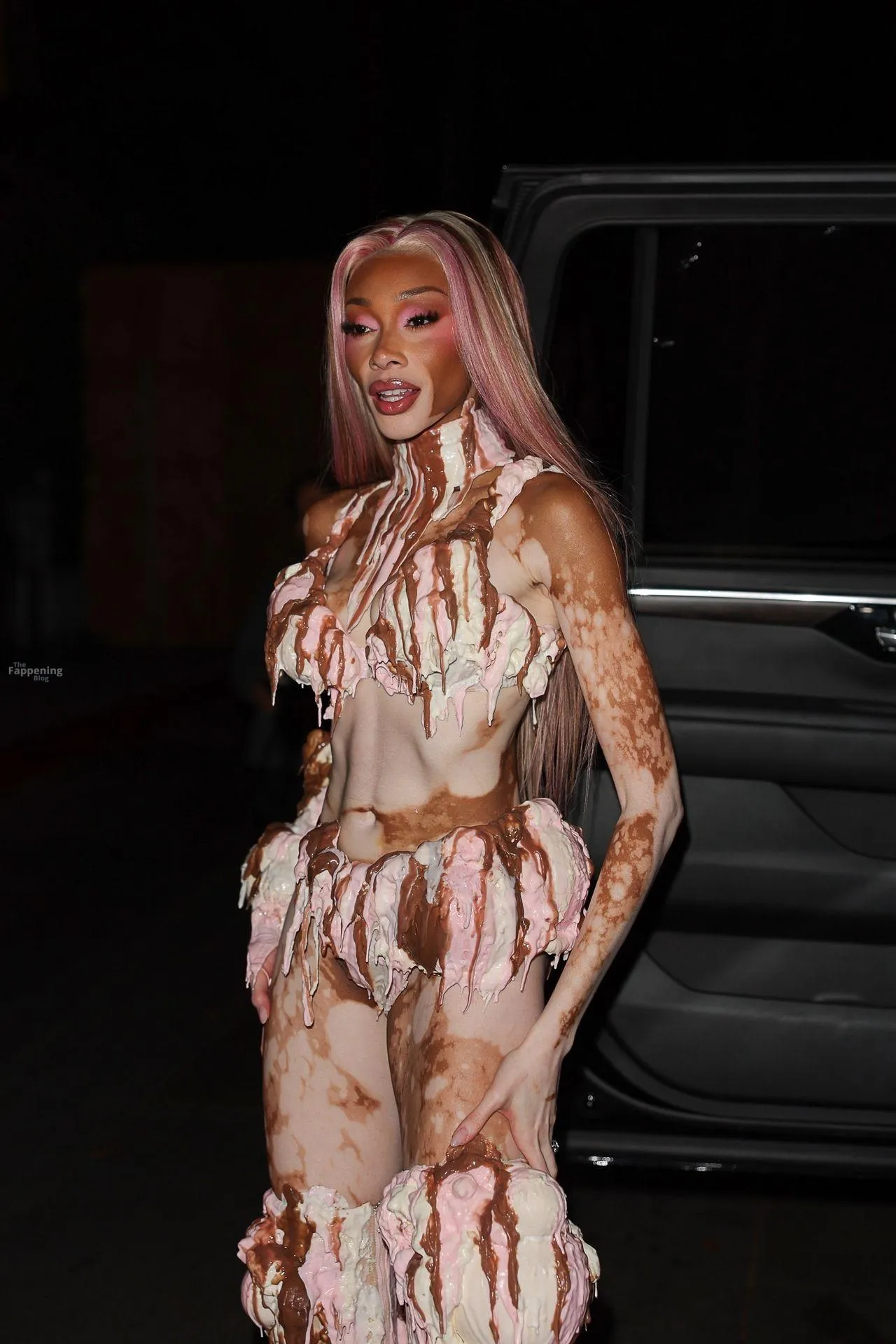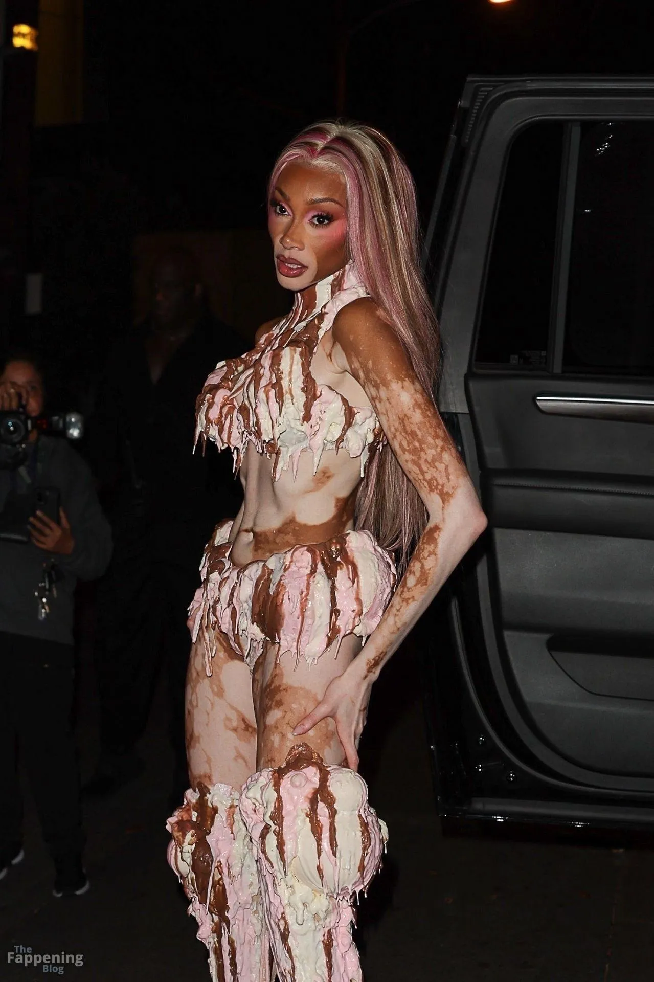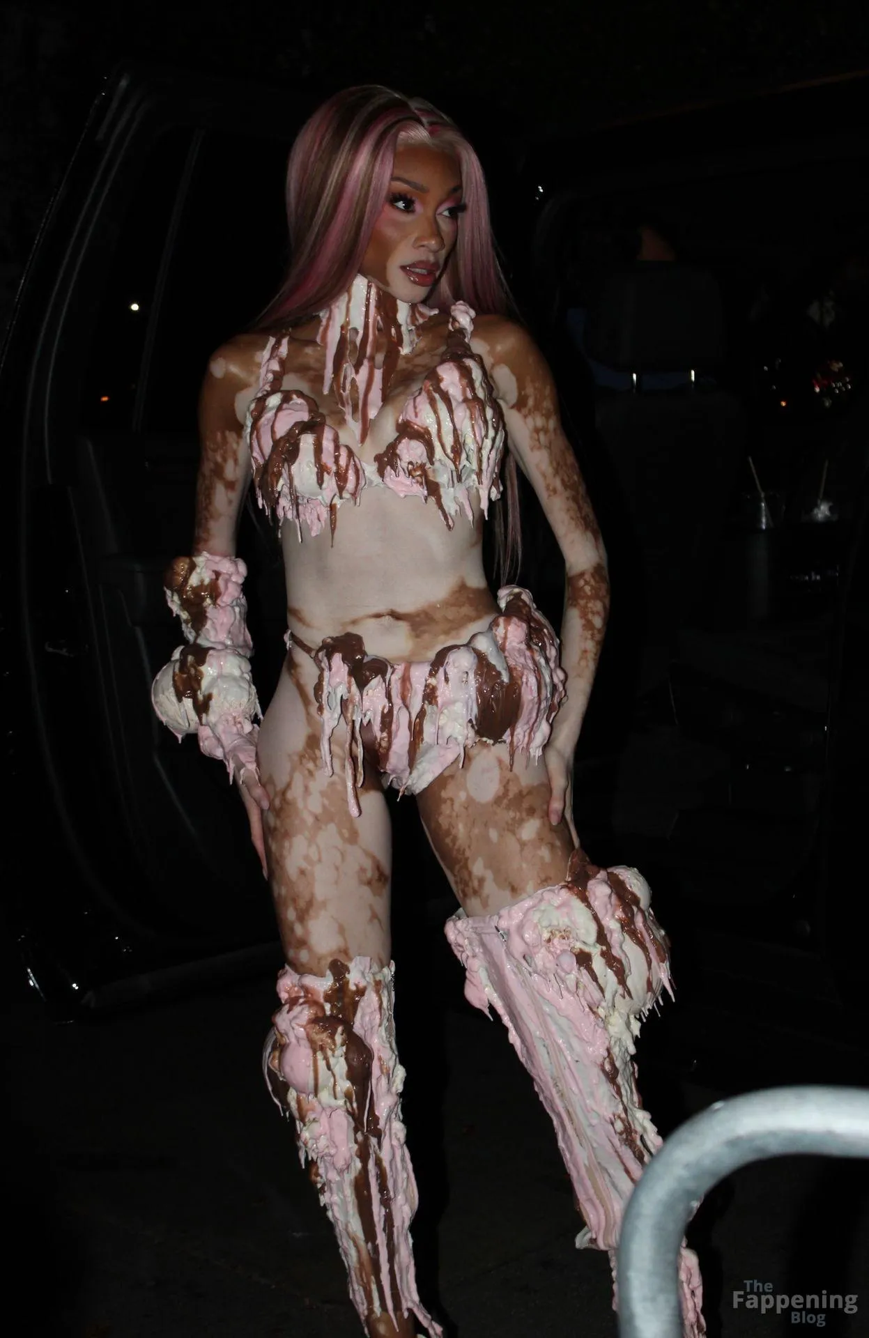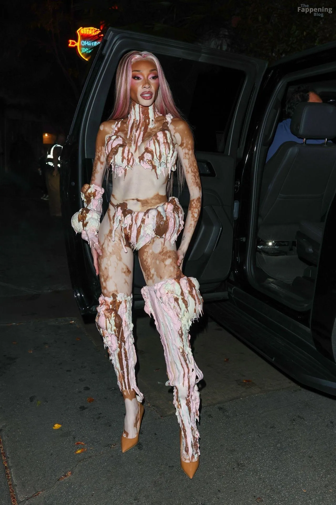 Model Winnie Harlow showed up at Vas J Morgan’s big Halloween bash in LA. Check out her ice-cream outfit in the paparazzi pics below.