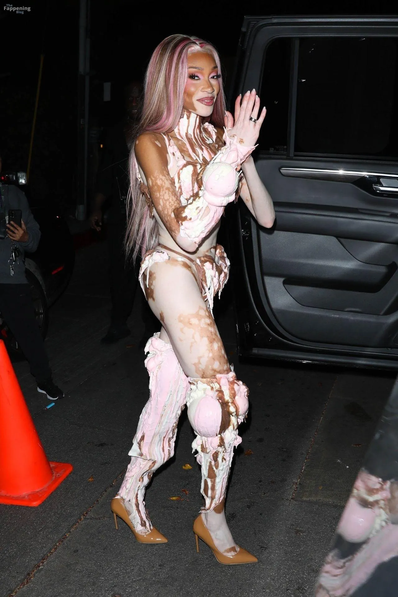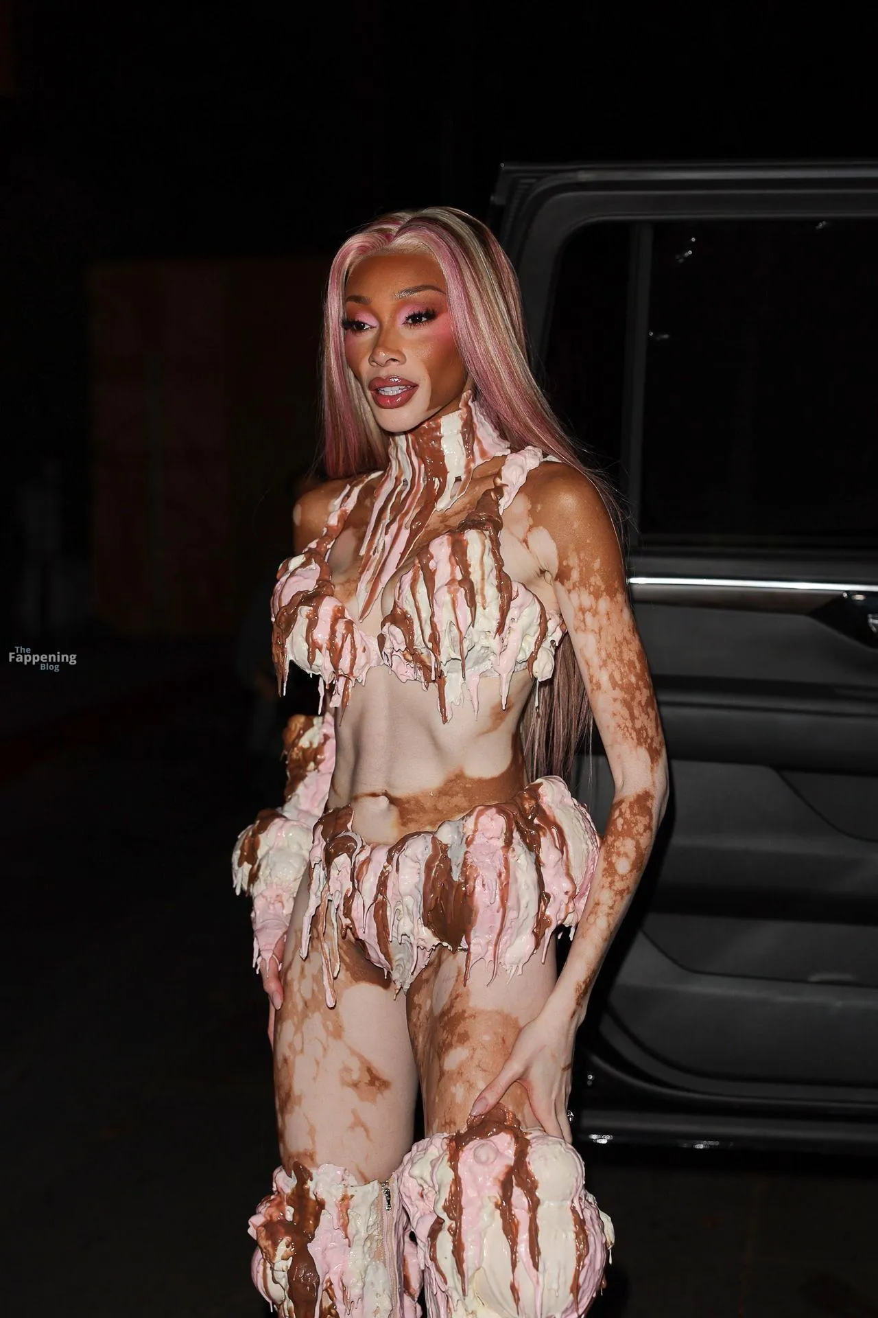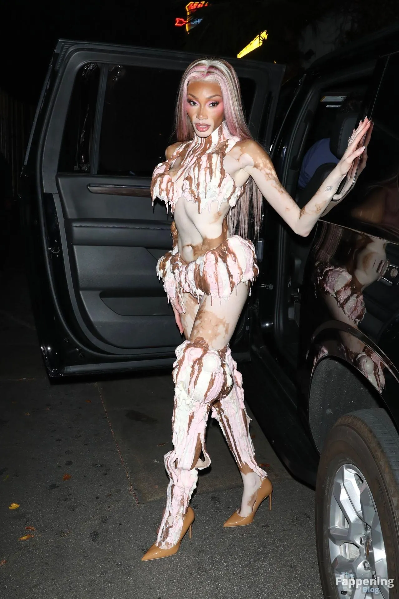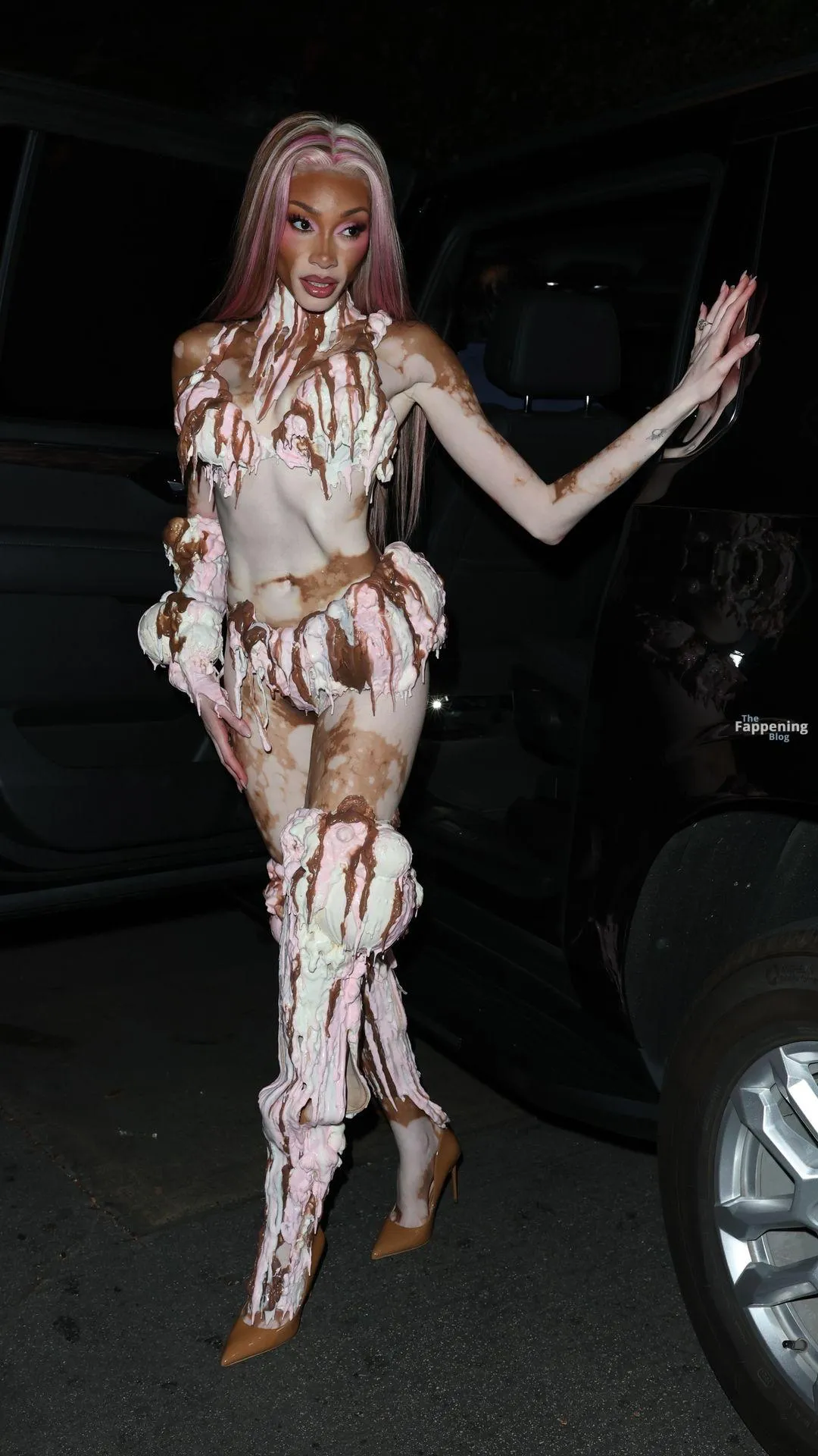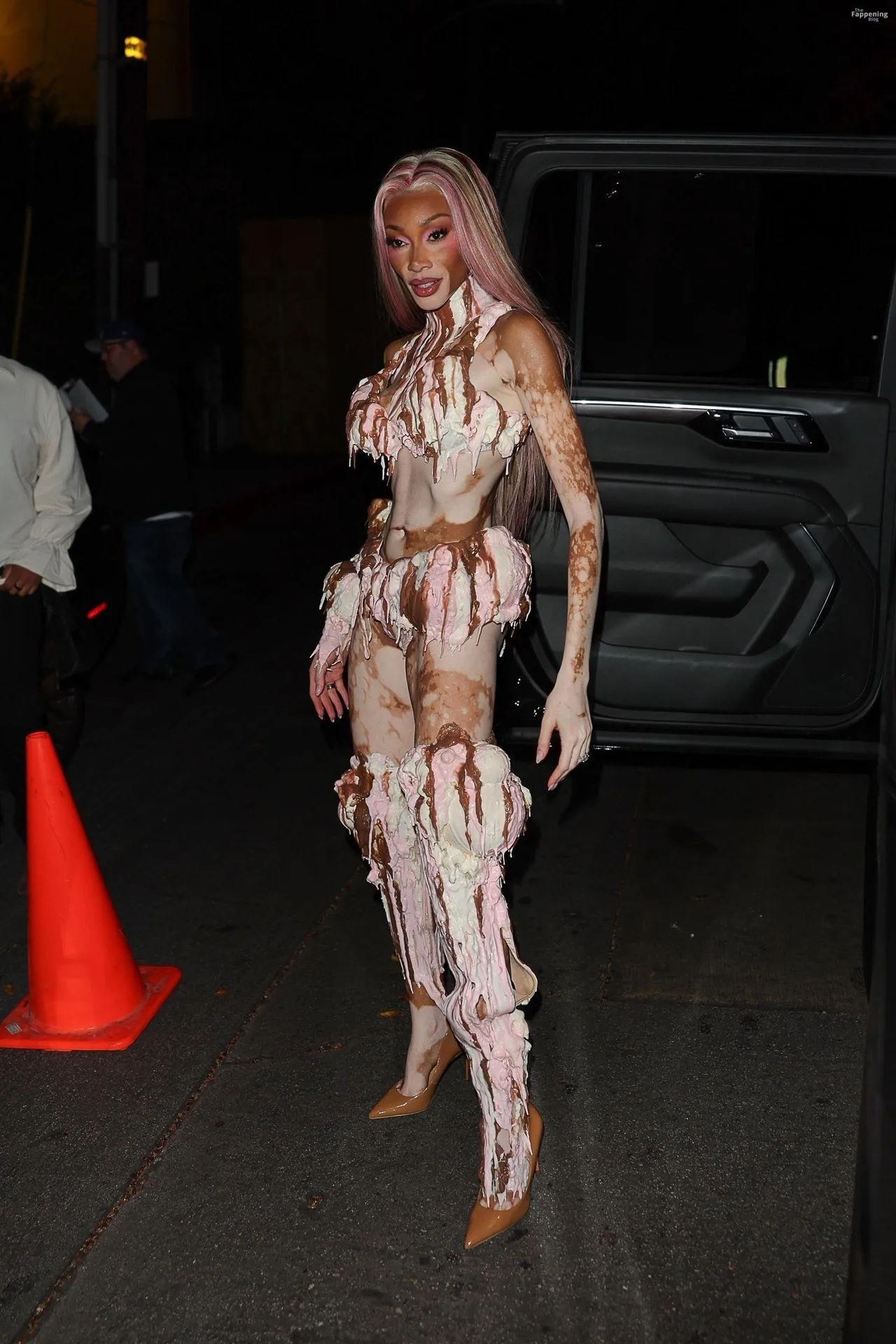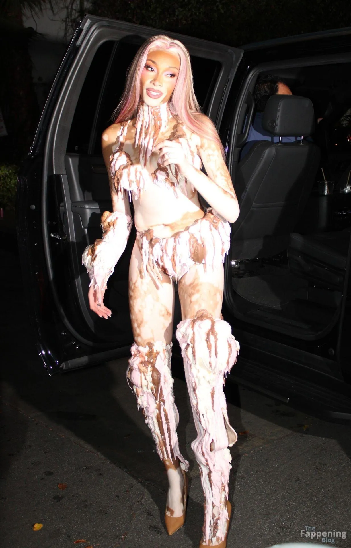Model Winnie Harlow showed up at Vas J Morgan’s big Halloween bash in LA. Check out her ice-cream outfit in the paparazzi pics below.