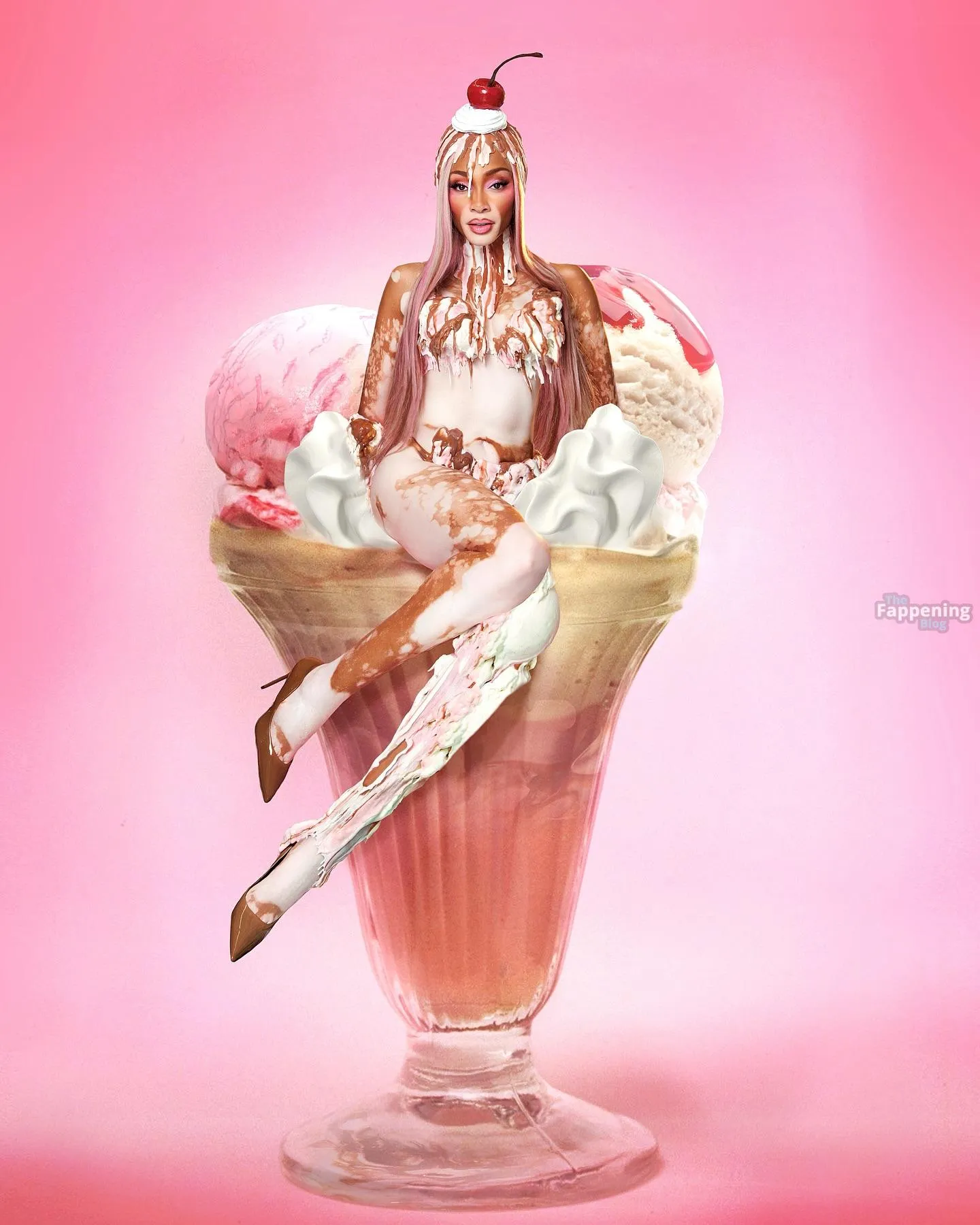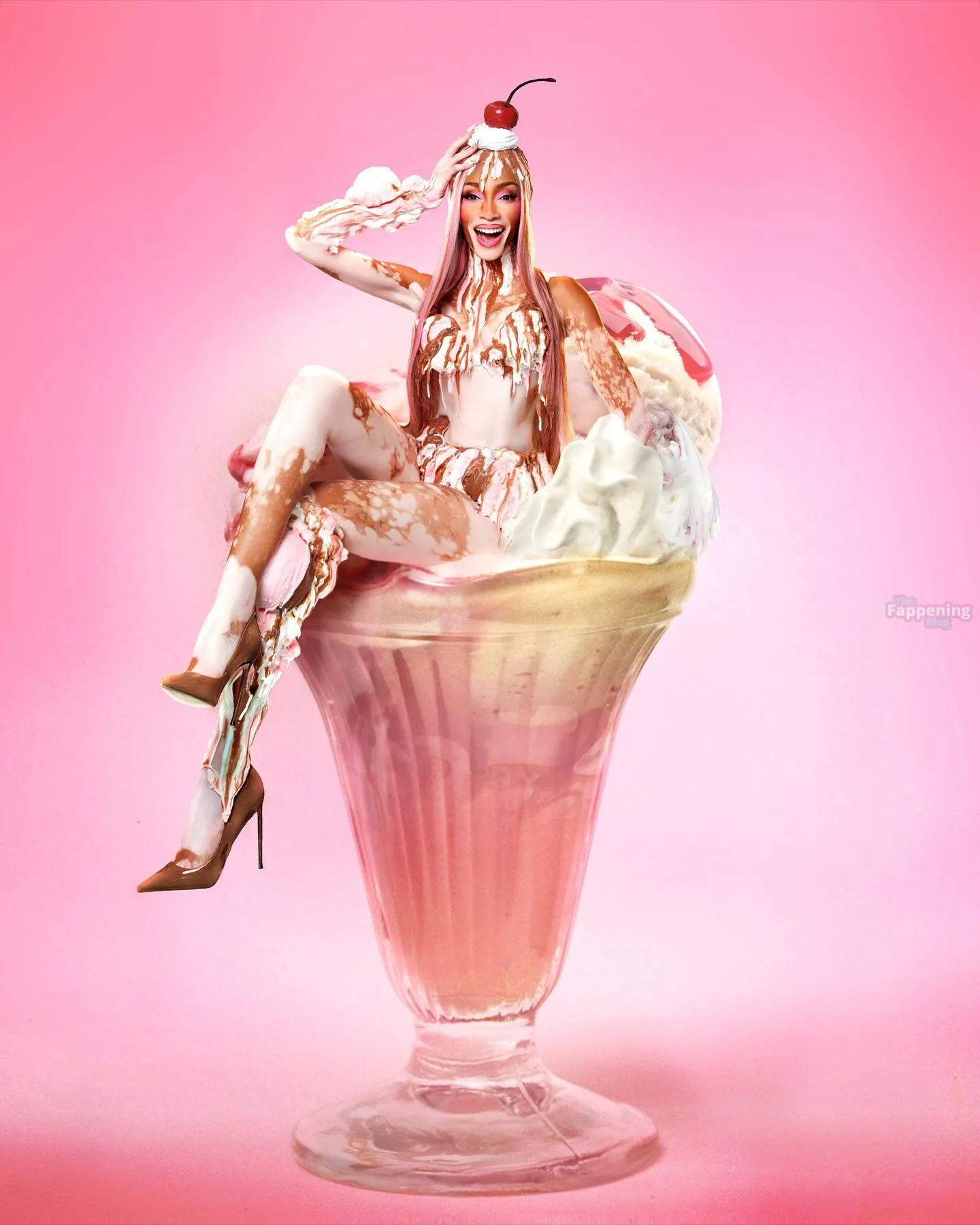 Winnie Harlow pulled off the most original Halloween costume this year. She went as an ice cream monster. It’s a killer idea – a sexy, half-naked girl slathered in ice cream, scary as hell. In the pics, the model with vitiligo poses in an ice cream shop, lookin’ like part of the menu. Would you lick that sweet white ice cream off her? Hell yeah.